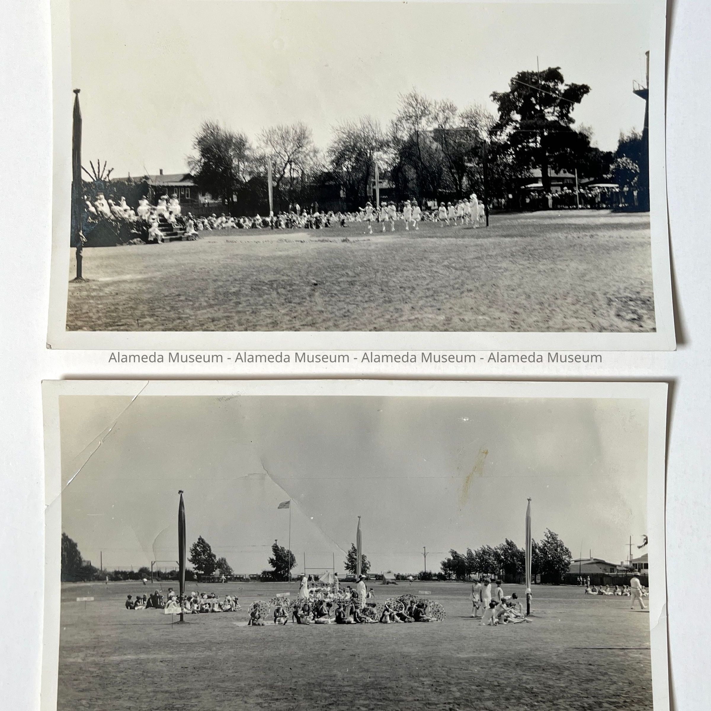 History of Object: Photos of grammar school children performing at a May Day pageant in Lincoln Park; roofs of nearby bungalows can be seen in the distance.