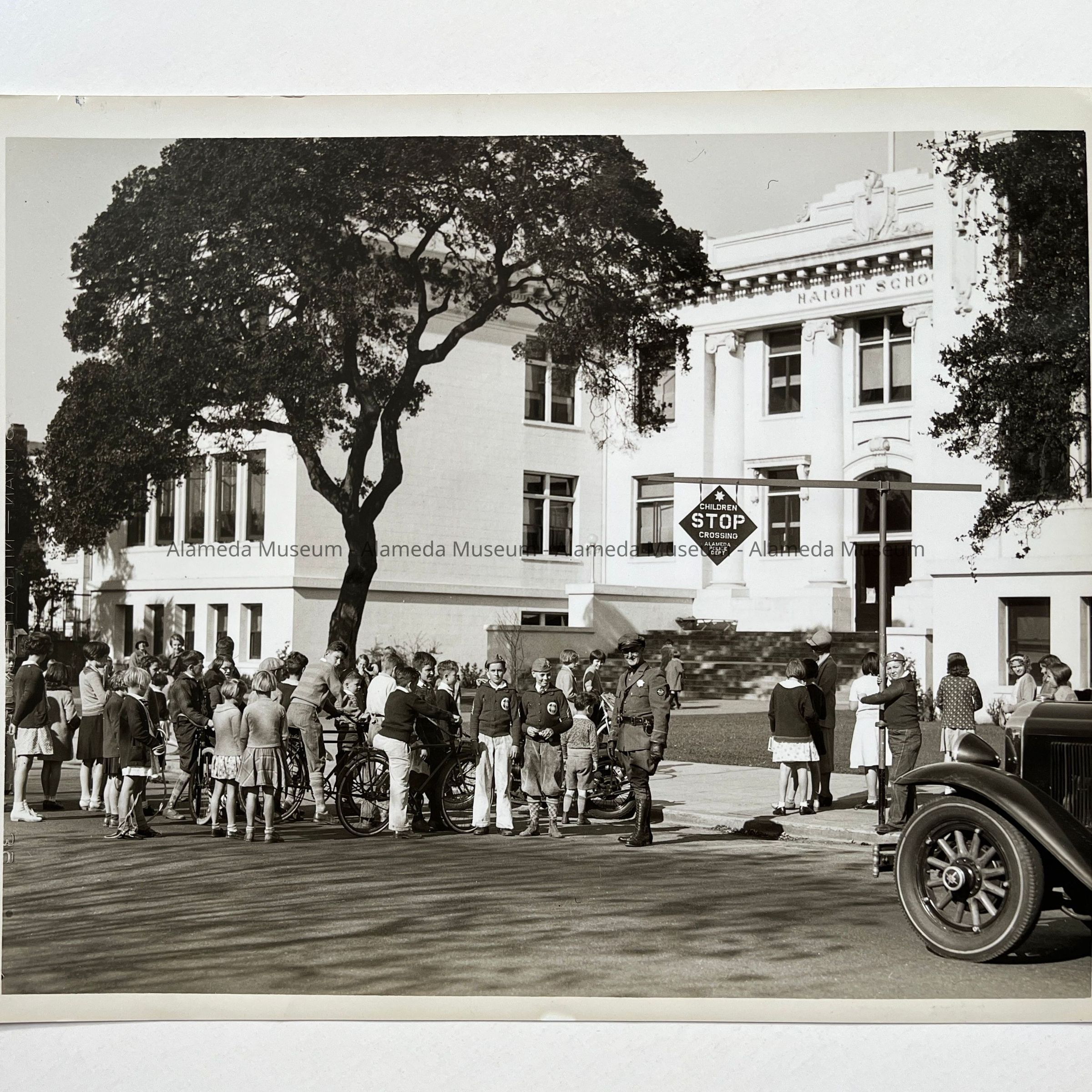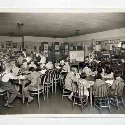 History of Object: Various school scenes: A) Haight School - school crossing safety program; B) Haight School students posed with their teacher; C) "Book Week" reading program demonstrated at an unidentified school.