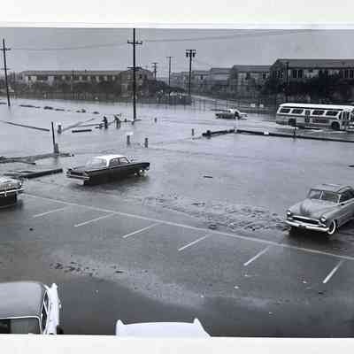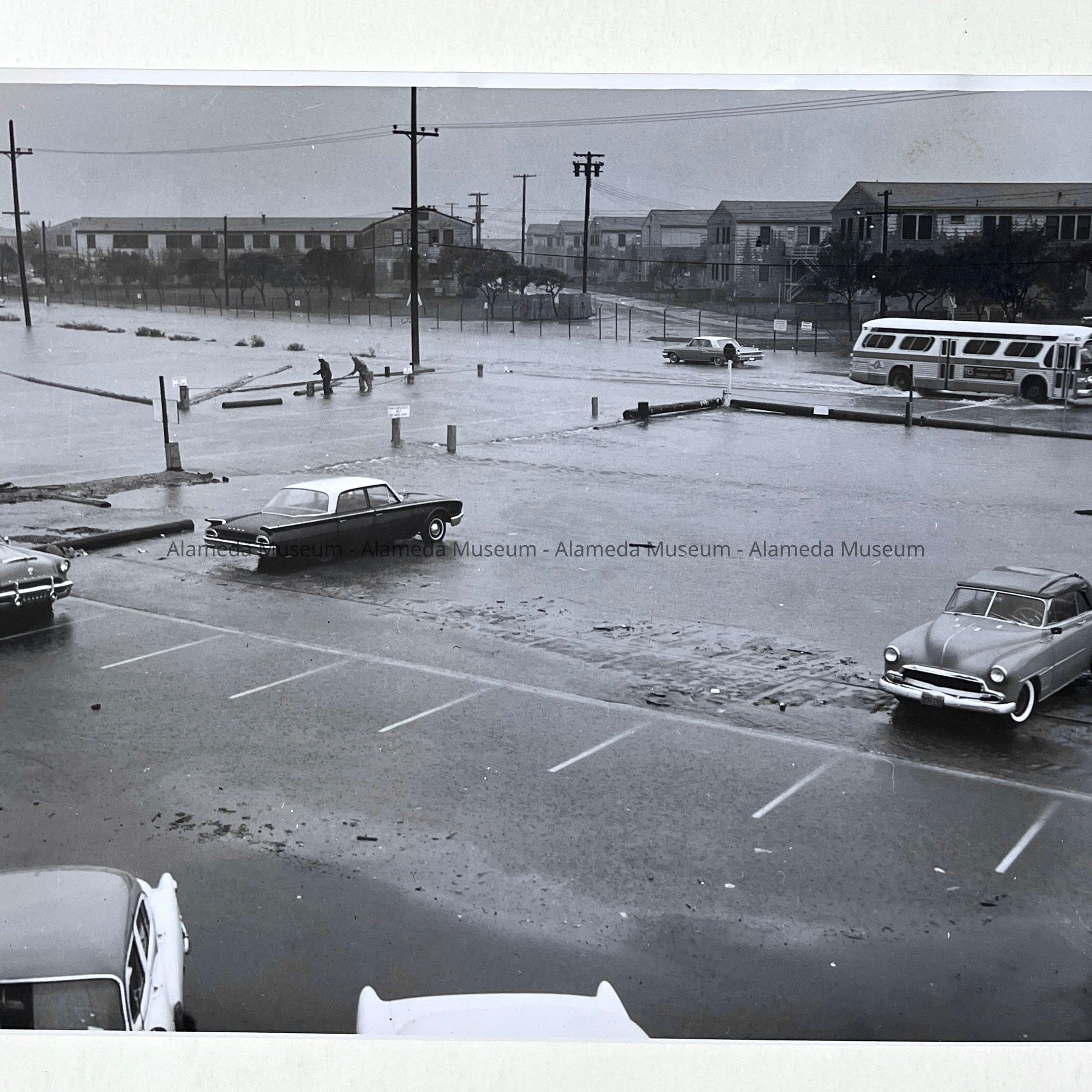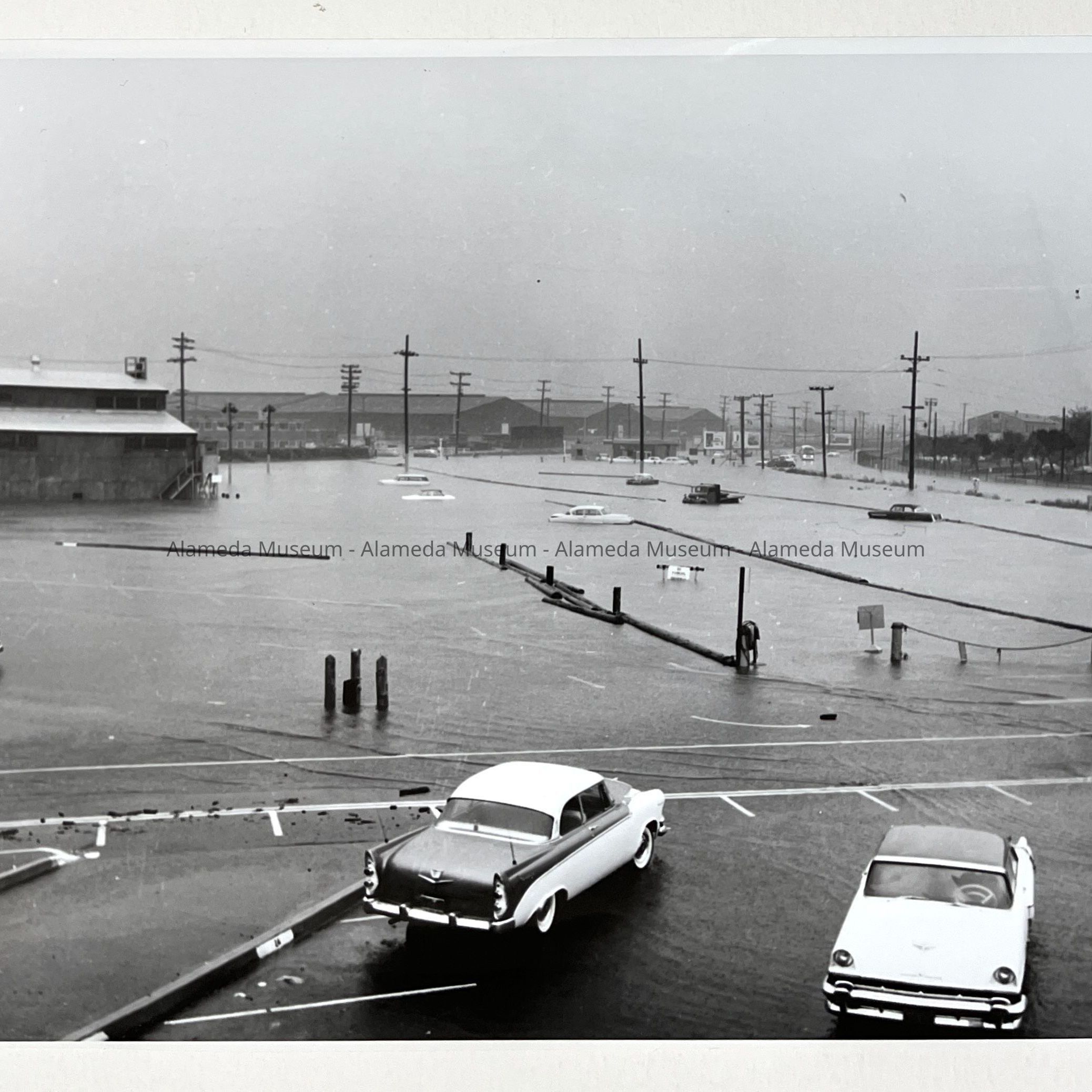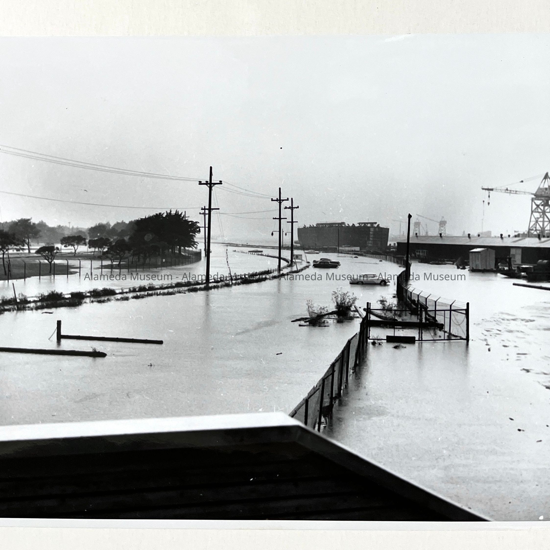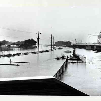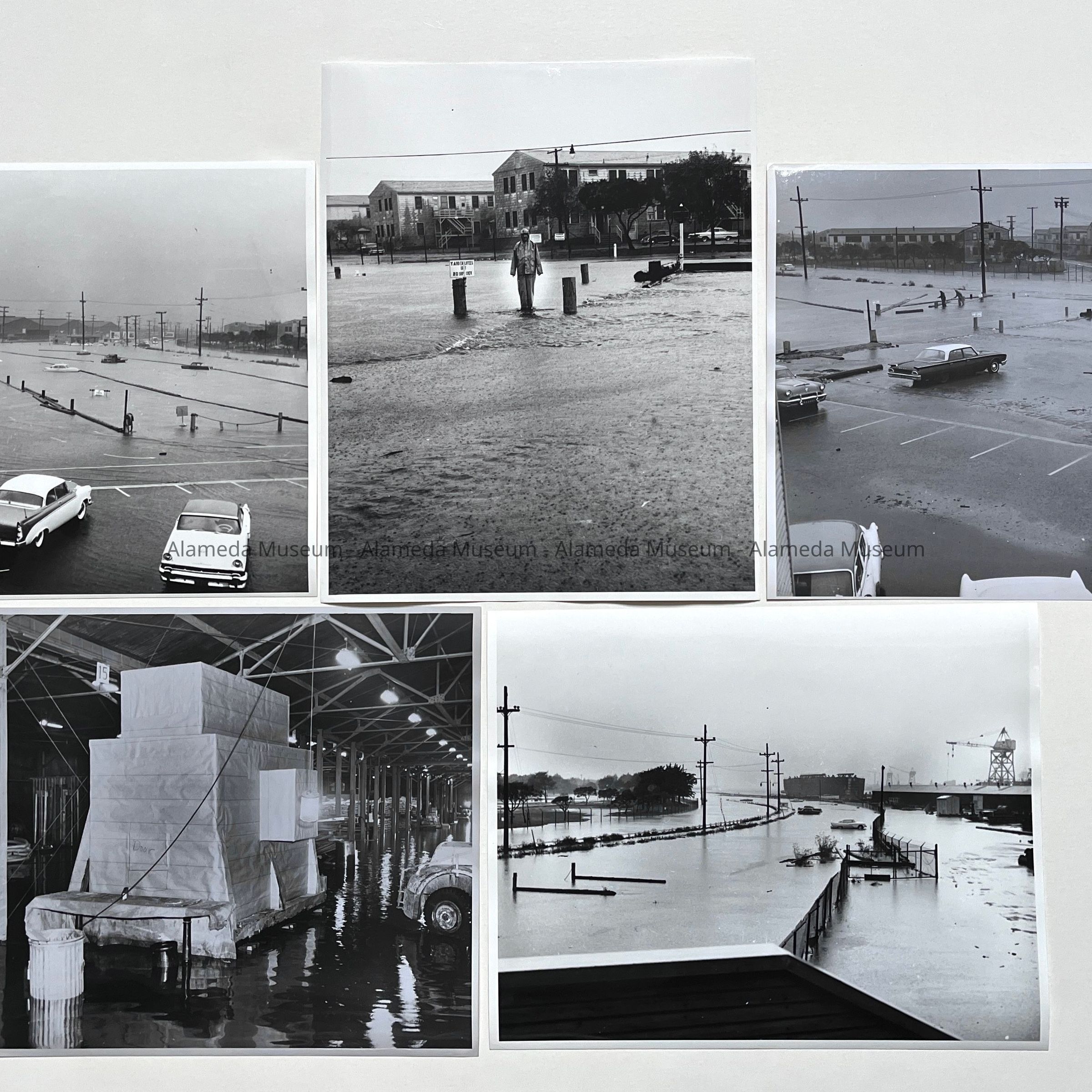 A SERIES OF PHOTOGRAPHS DEPICTING SEVERE WIND- AND RAINSTORM DAMAGES, WEEKEND OF 13-14 OCTOBER 1962, AT TODD SHIPYARDS, ALAMEDA, CALIFORNIA. SEVERE FLOOD CONDITIONS ARE DISPLAYED ON THOSE PHOTOGRAPHS.