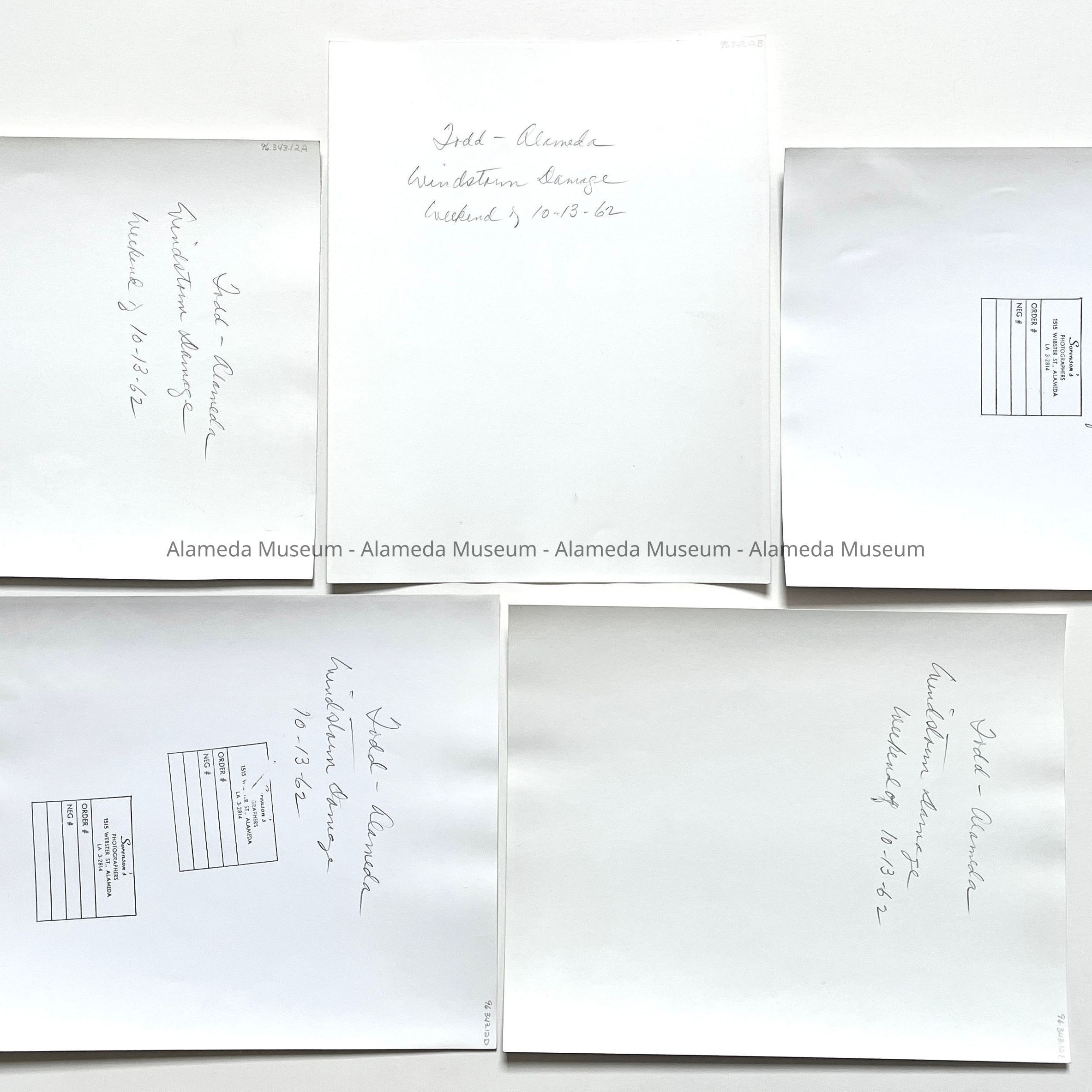 SERIES OF FIVE BLACK-AND-WHITE GLOSSY PHOTOGRAPHS, TWO PHOTOS ARE SIGNED ON REVERSE SIDES, "SORENSON'S PHOTOGRAPHERS." SORENSON'S WAS LOCATED AT 1515 WEBSTER STREET, ALAMEDA, CA.