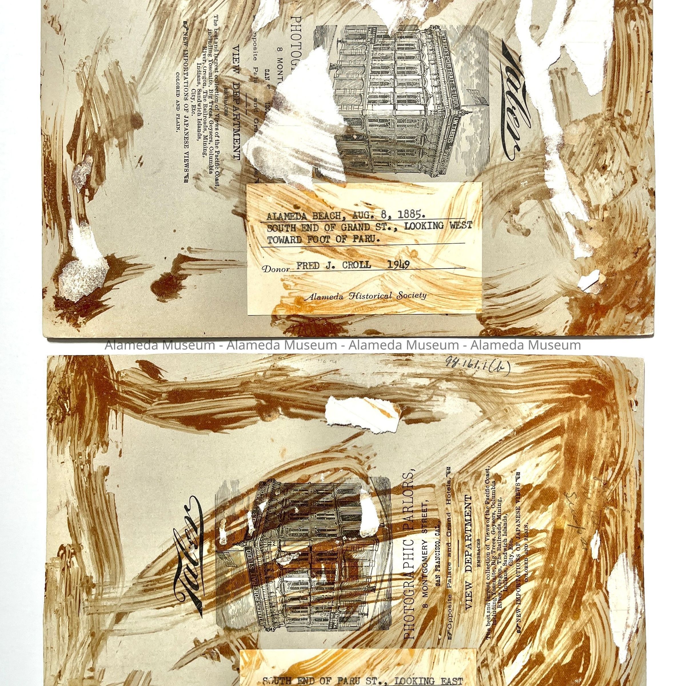 History of Object: Two shoreline vies of Alameda: #a - South end of Grand Street looking west toward the foot of Paru Street; #b - South end of Paru Street looking east toward an old private bath house structure located on a small piling at the foot of Grand Street.