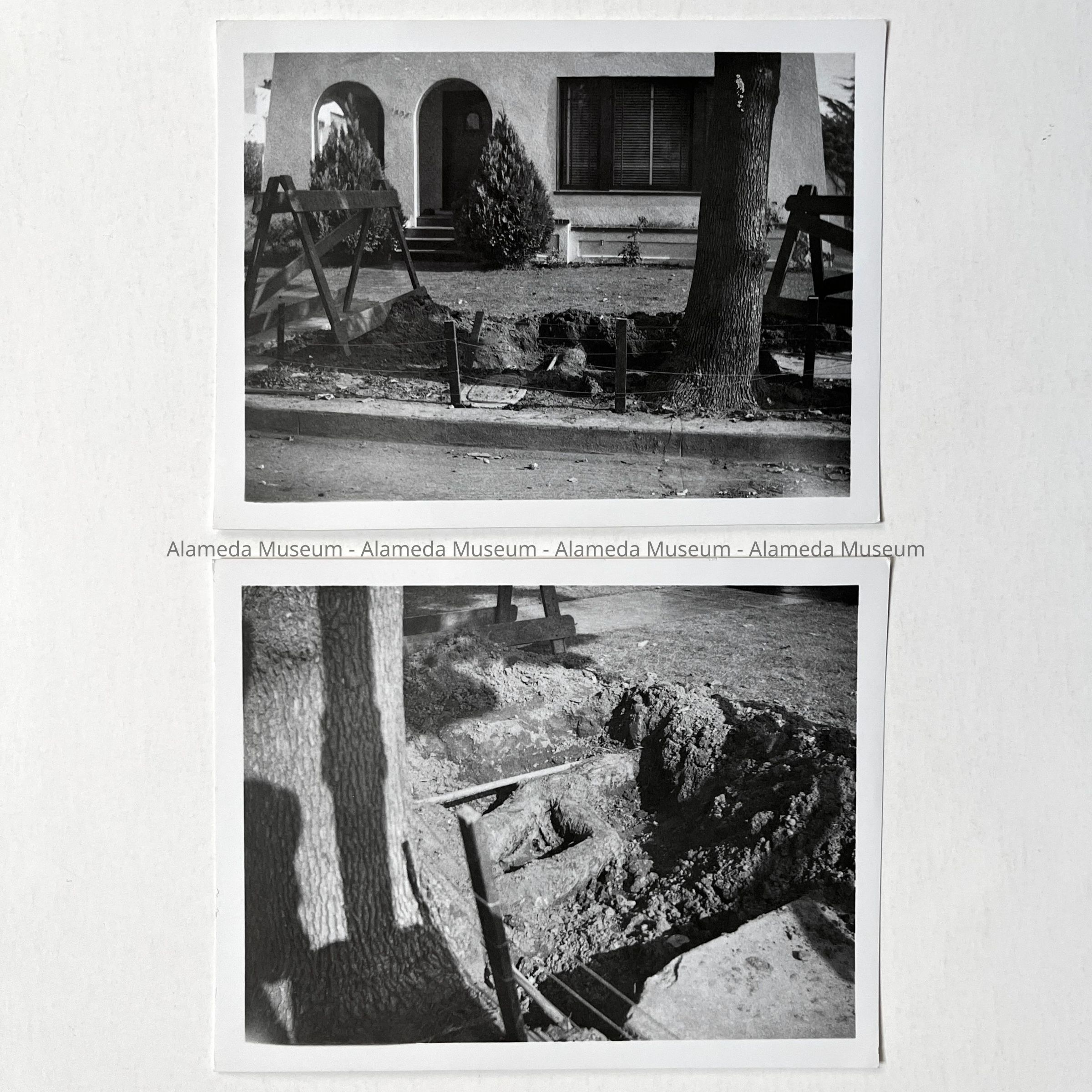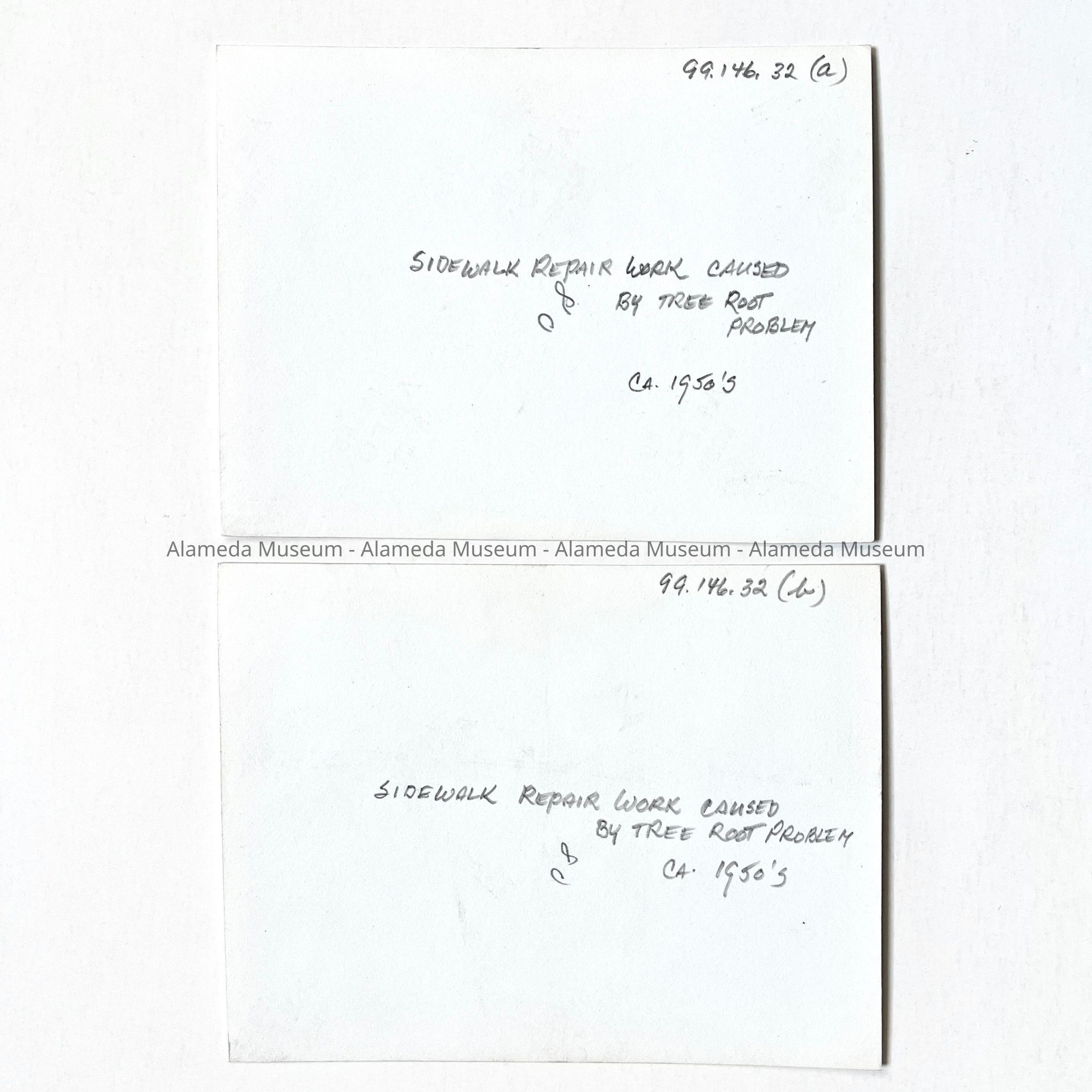 History of Object: Two views of sidewalk repair work due to a tree root problem, in front of a stucco home (#1834) on an unidentified street.