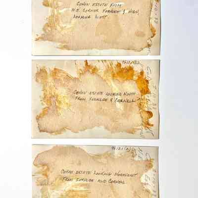 Description: Glossy black/white sepia-toned photos, unmounted (but with brown glue stains and tan scrapbook paper residue on the verso). Photographer unknown. The images have descriptions typed upon their emulsion, along the top margin. The photos are somewhat discolored by an unstable fixing solution. Image #a is damaged by creasing and small gouges on its edges.