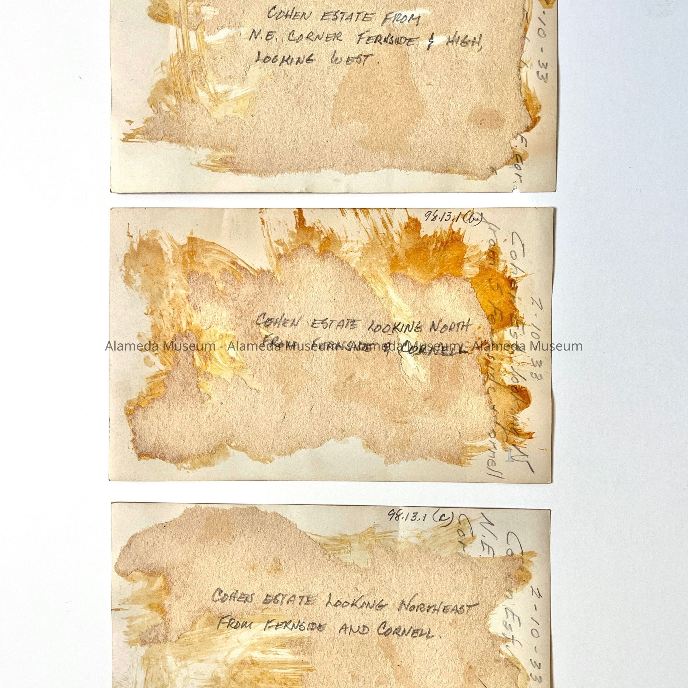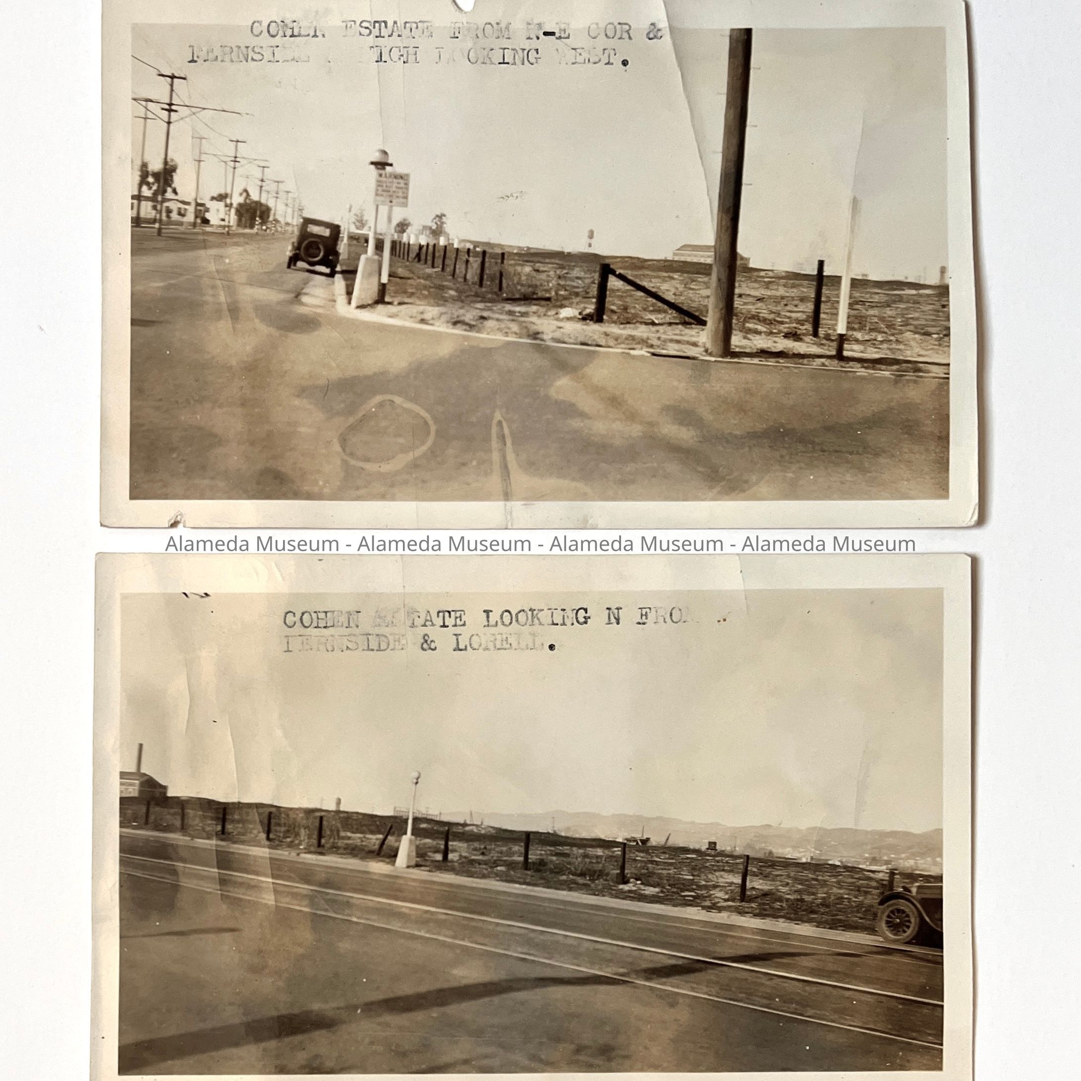 History of Object: Alameda scenes: image #a - Cohen Estate from Northeast corner of Fernside Ave. and High St., looking West; #b - Cohen Estate looking North from Fernside Ave. and Cornell St.; #c - similar scene to #b; #d - Peach St. at Otis Drive.