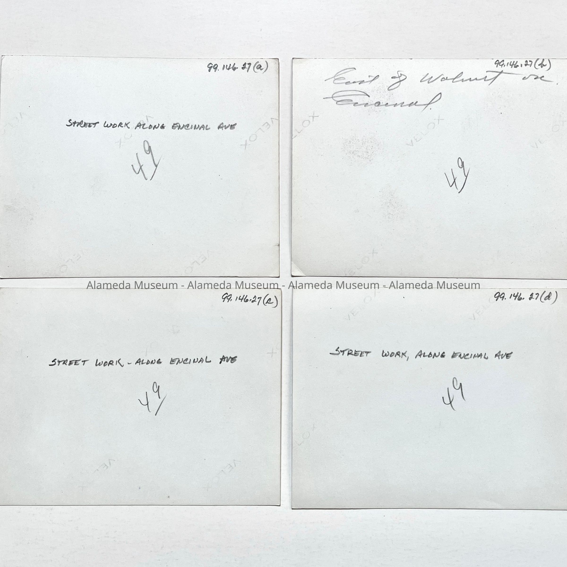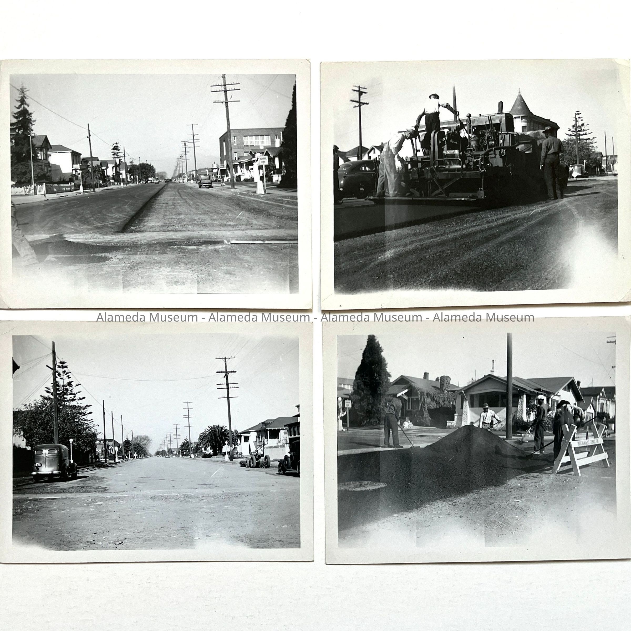 History of Object: Four street repair scenes showing work along Encinal Avenue, east of Walnut Street.