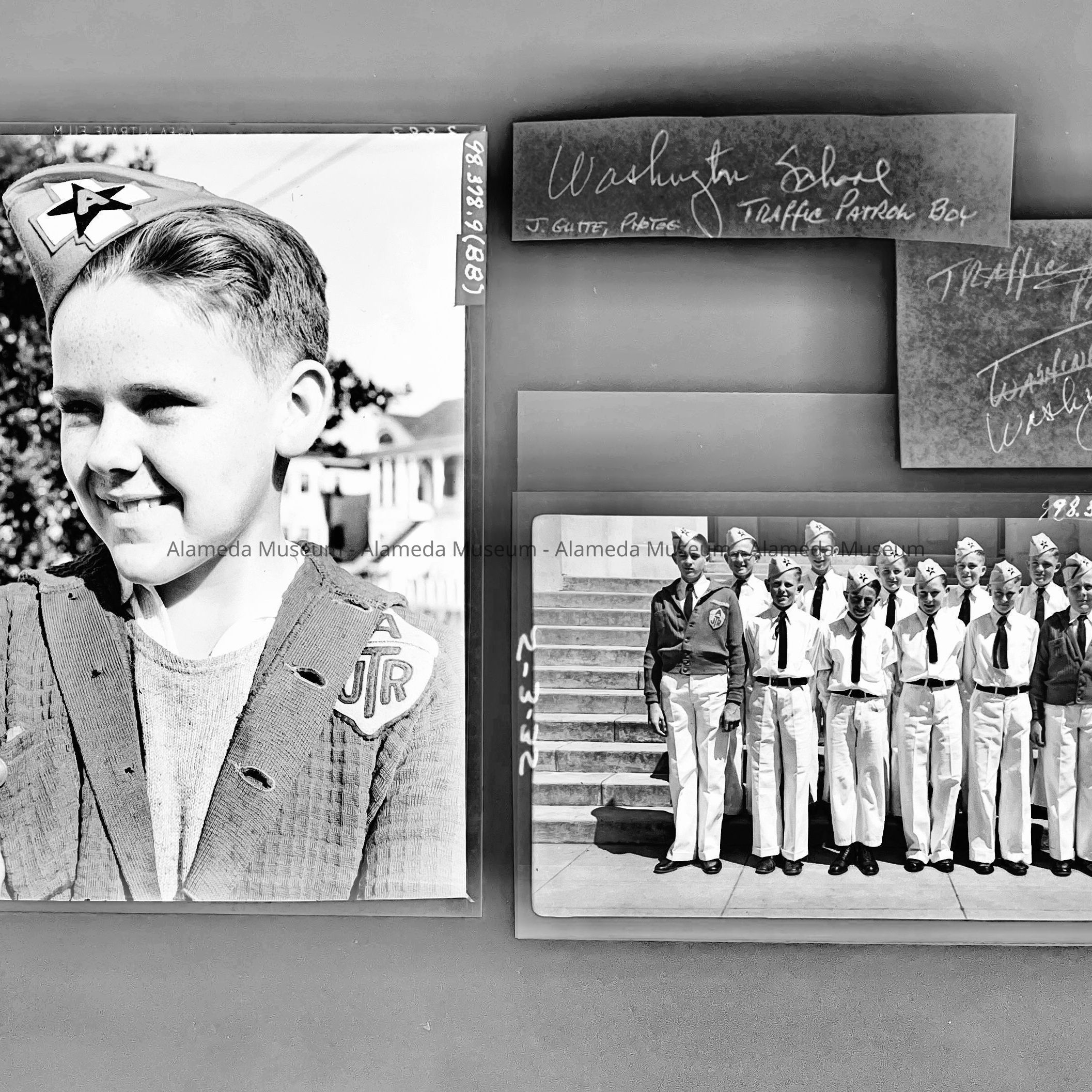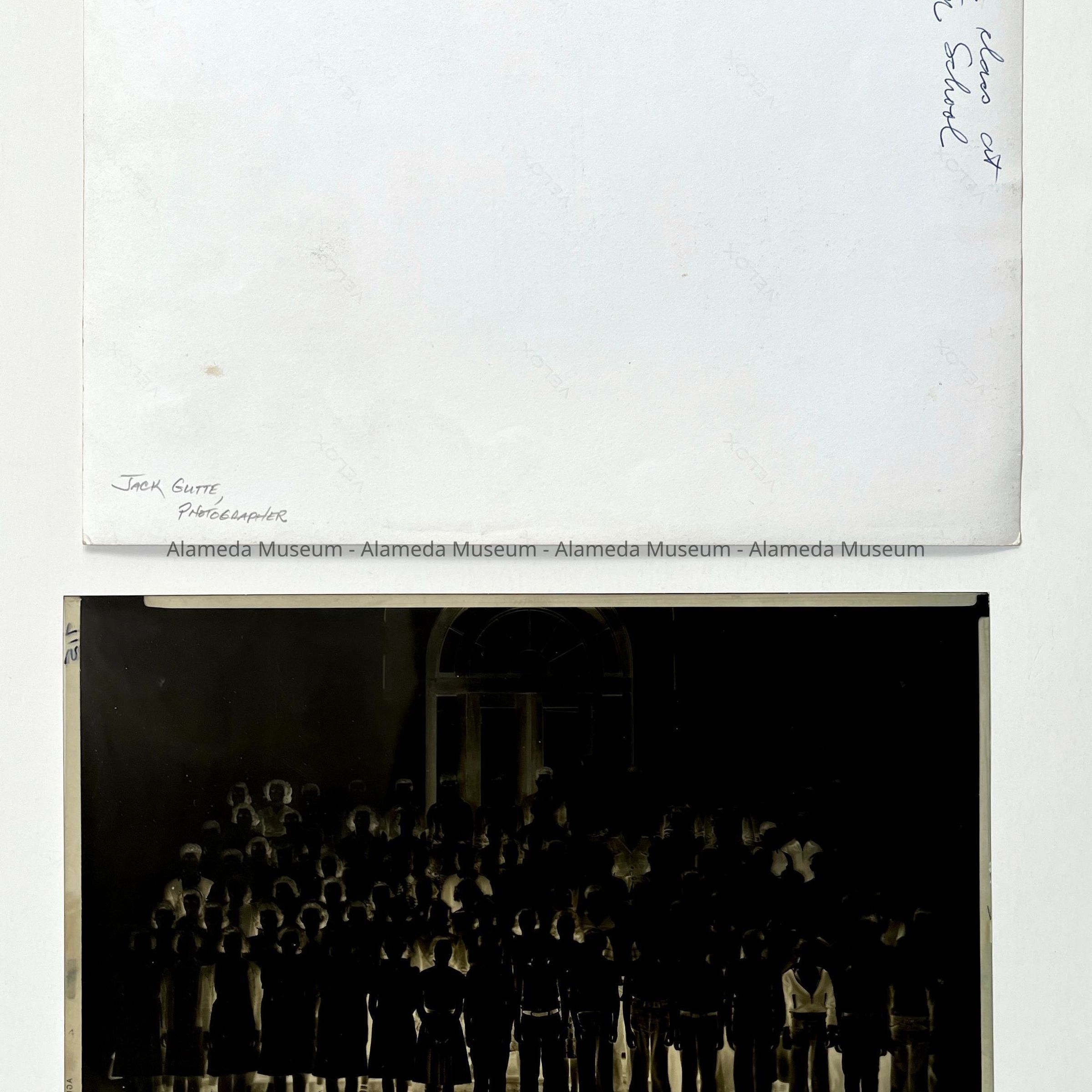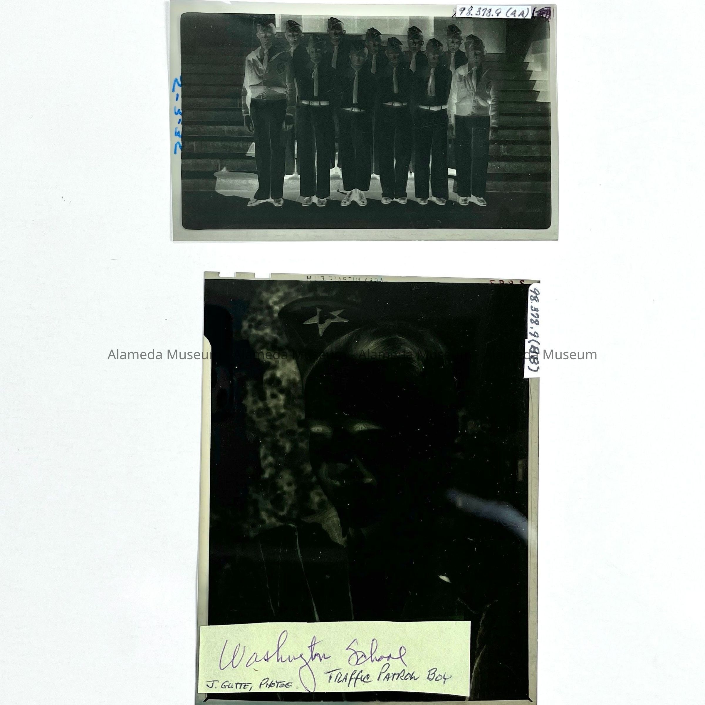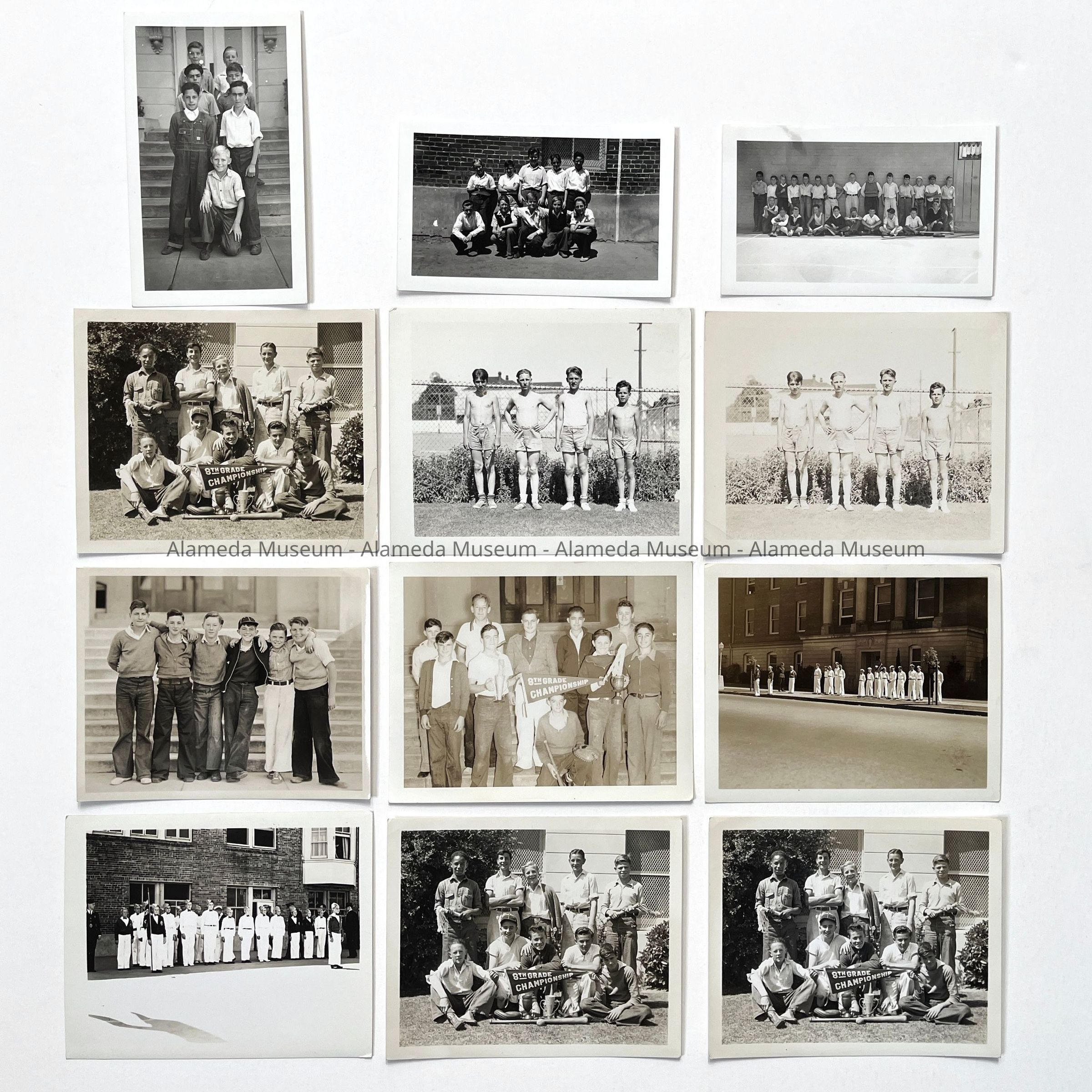 History of Object: Various views of student activity at Alameda Schools. Largely in 1936: #a-c: informal groups of boys; #d - 8th Grade baseball champions; #e - Mastick school traffic patrol marching; #f, h - track stars (identical images); #(e), g, k, m, n, x – Mastick scool May Day pageant; #i - 8th Grade baseball champions; #j - baseball players; # l, p, o, r, s: May Day at Mastick School. #t-u: traffic patrol boys in uniform; #v-W - 8th Grade baseball champions (identical images, and same as #d); #y - graduating class, mid-1930's; #z - photographic negative of #y. #AA (neg.) boys in traffic patrol uniforms it provided by Gutte's Association Gas Station; #BB (neg.): portrait of youth in traffic uniform.