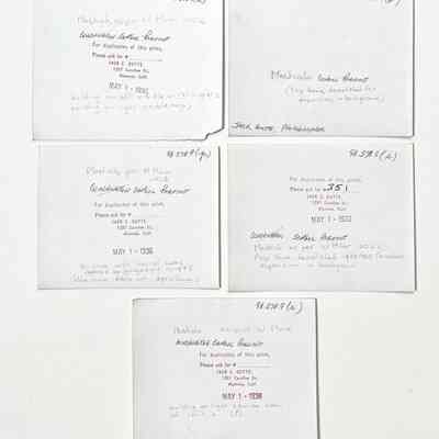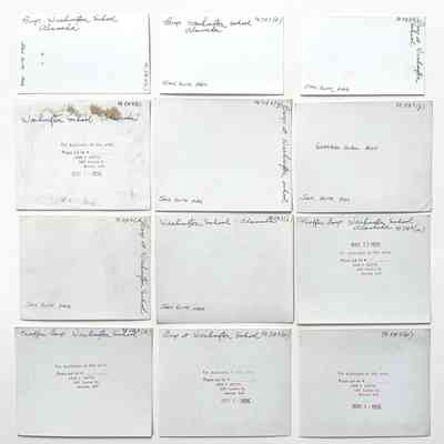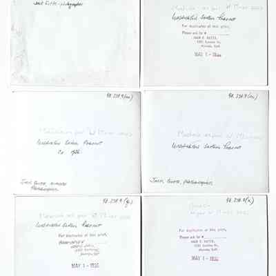 Various sizes: #a - L 4 3/4 x W-3 in.; #b-c: L-2 3/4 x W-4 1/2; #d-x: L-4 x W-5 in.; #y - L 8 x W–10 in. #z, a black photographic negative of #y, measures: L-8 x W-10 in.; #AA - negative L2 3/4 x W-4 1/2 in. #BB: L-4 x W-5 in.