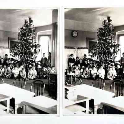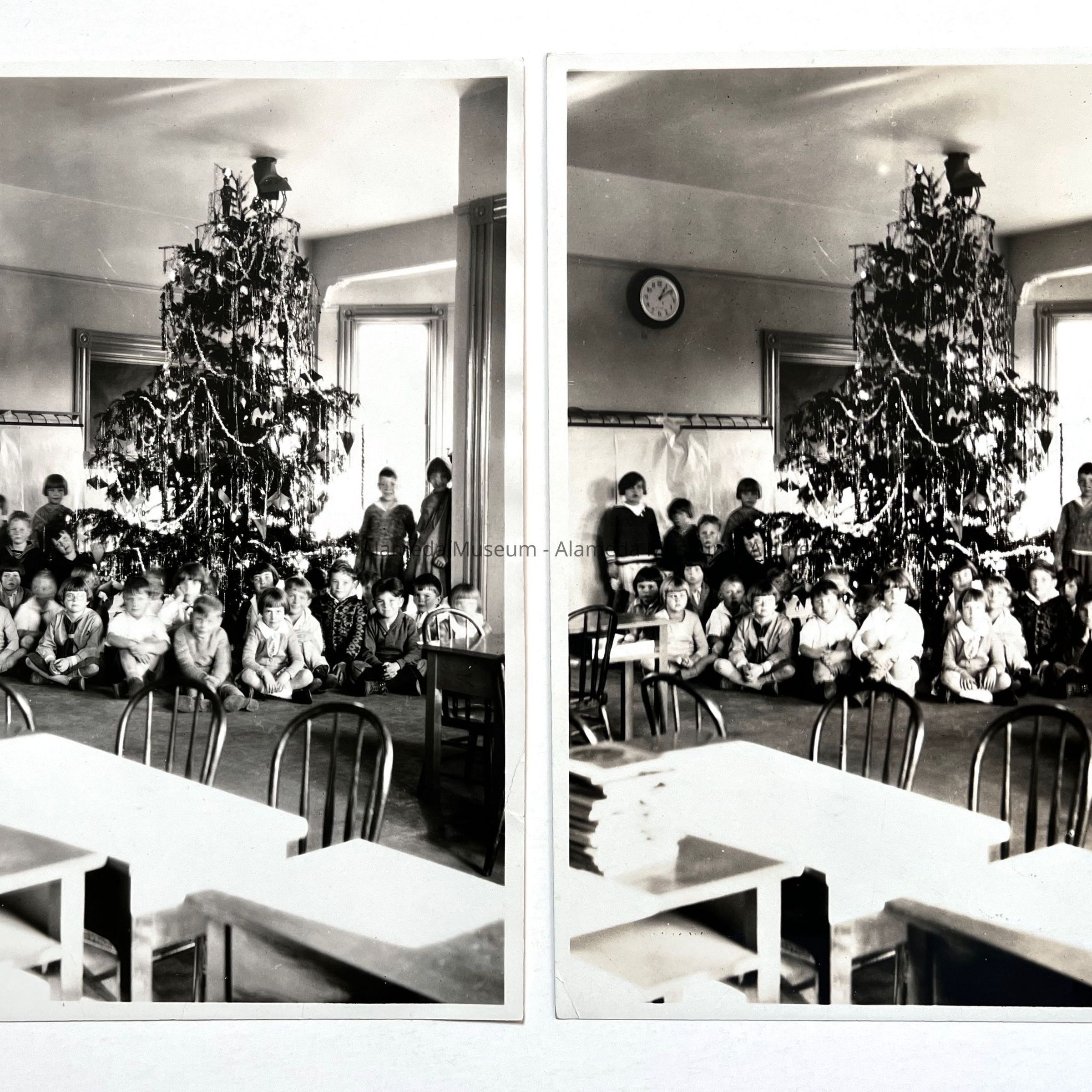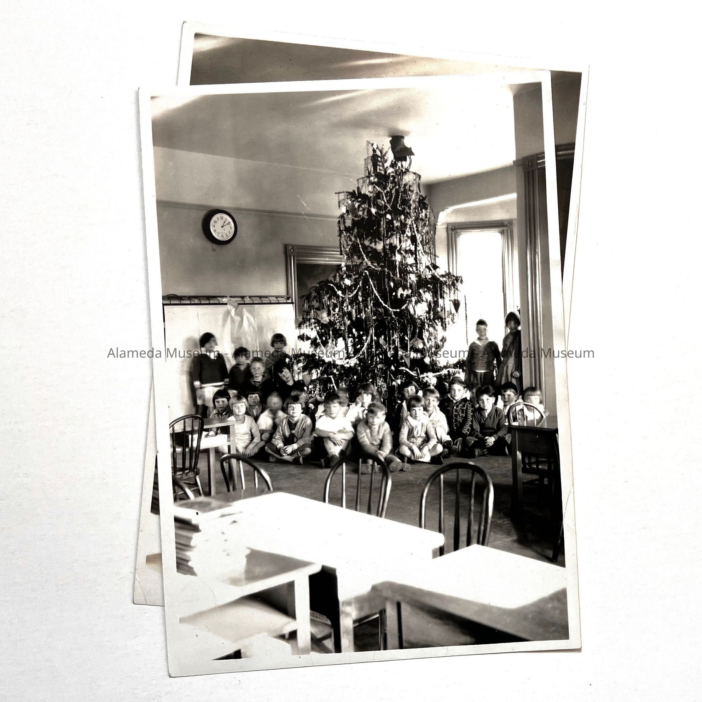 History of Object: Two nearly identical views of students gathered around a decorated Christmas tree in an unidentified school.
