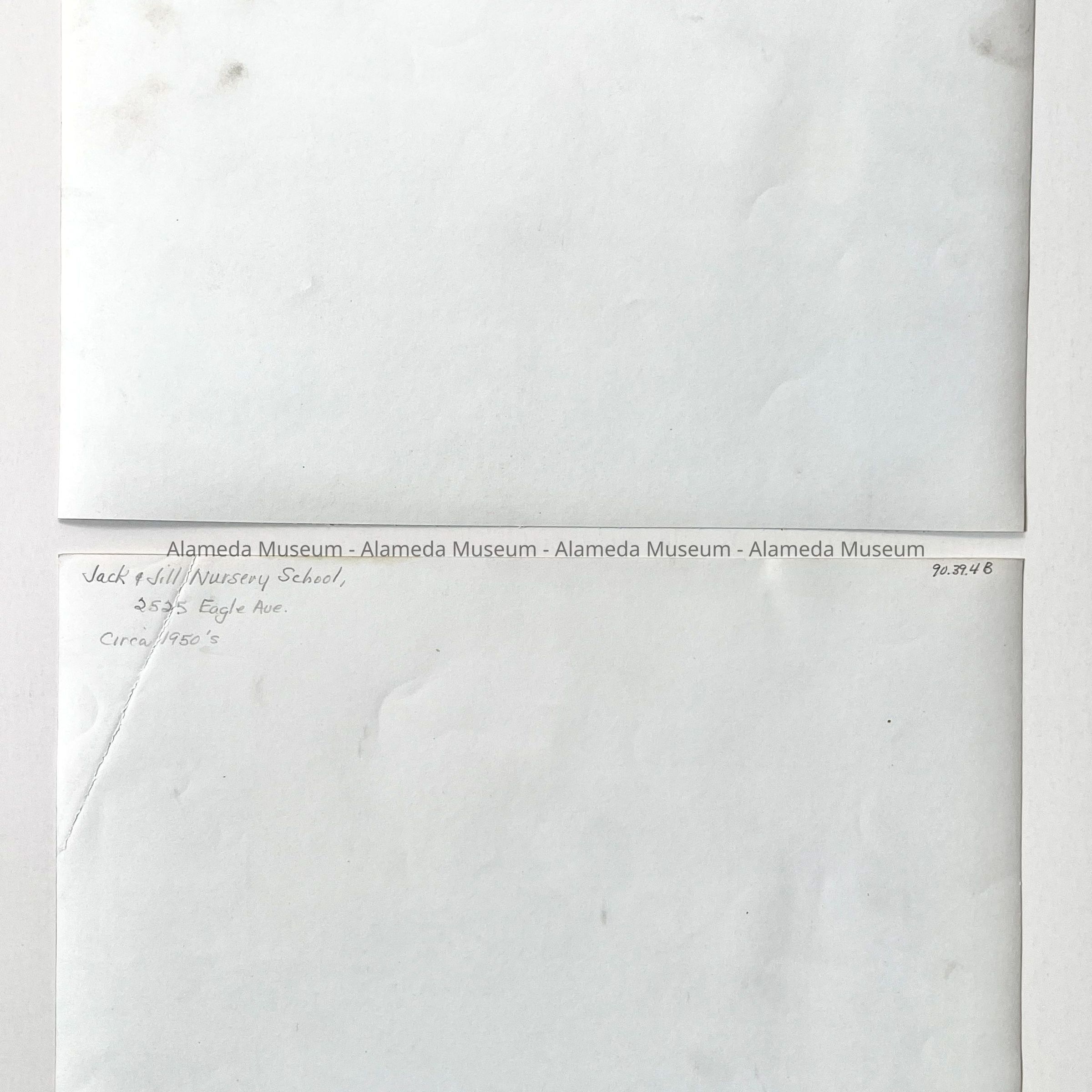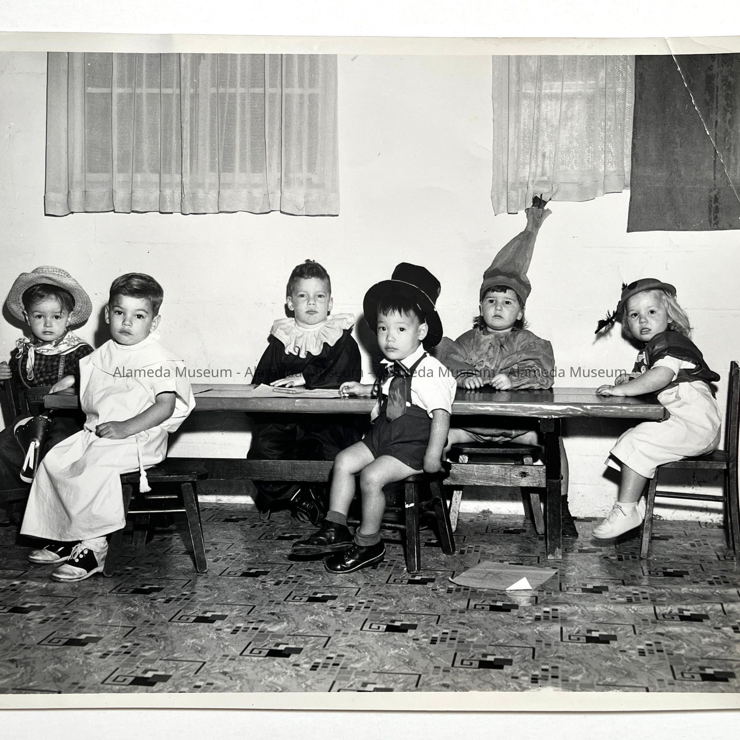 Photograph (2 copies) depicting the students, dressed in Halloween costumes, of a private nursery school named the "Jack & Jill Nursery School," operated by Ione Feigenberg, from 1947 into the 1950's. Owned and run by Mrs. Feigenberg, the nursery school was located at 2525 Eagle Avenue, Alameda.