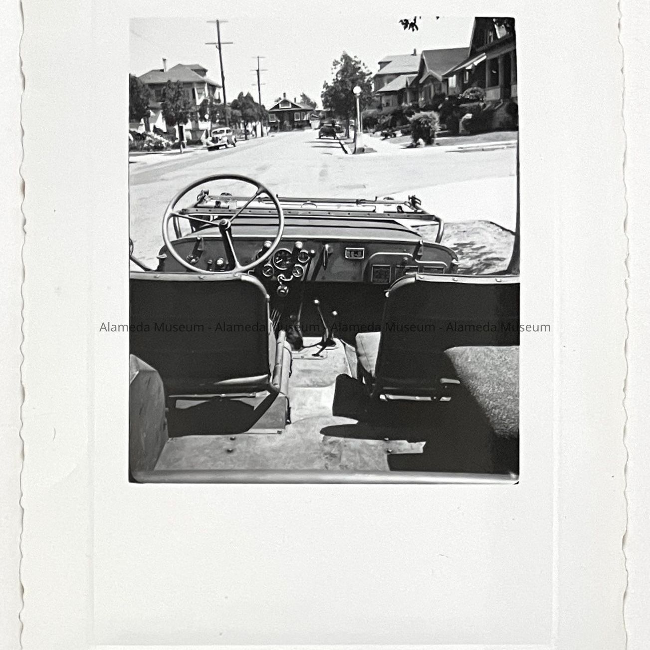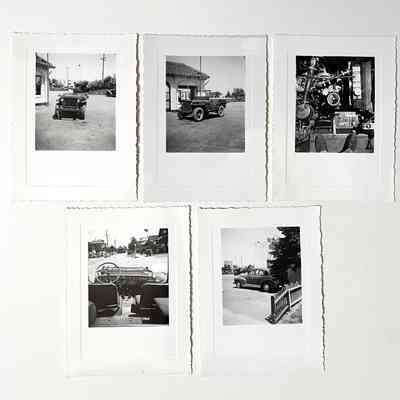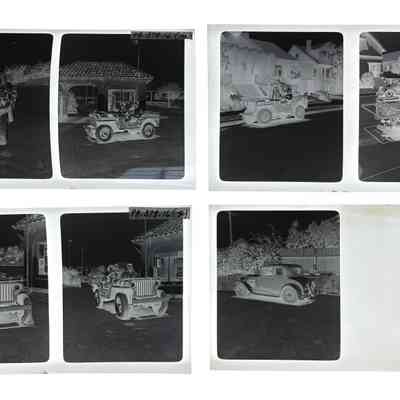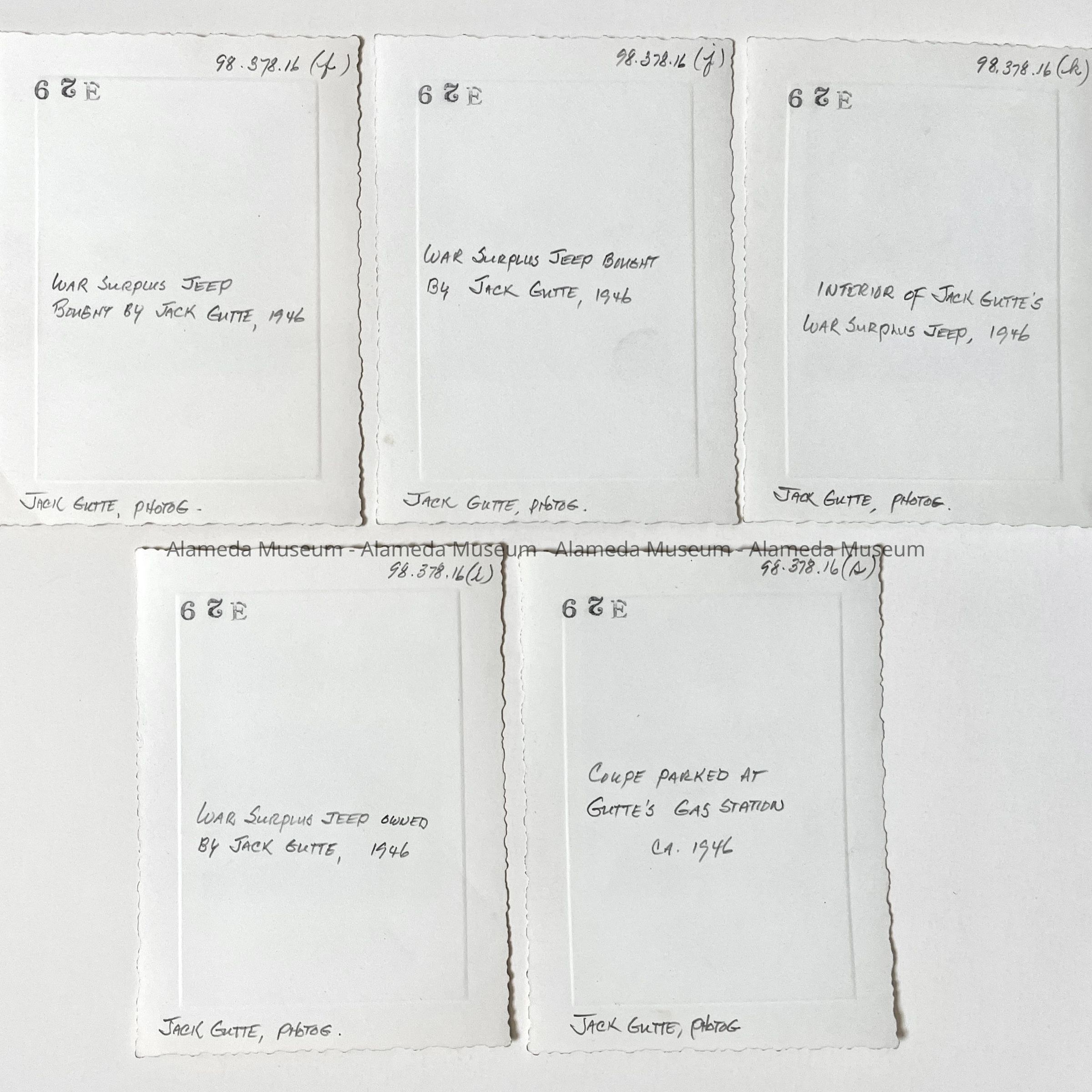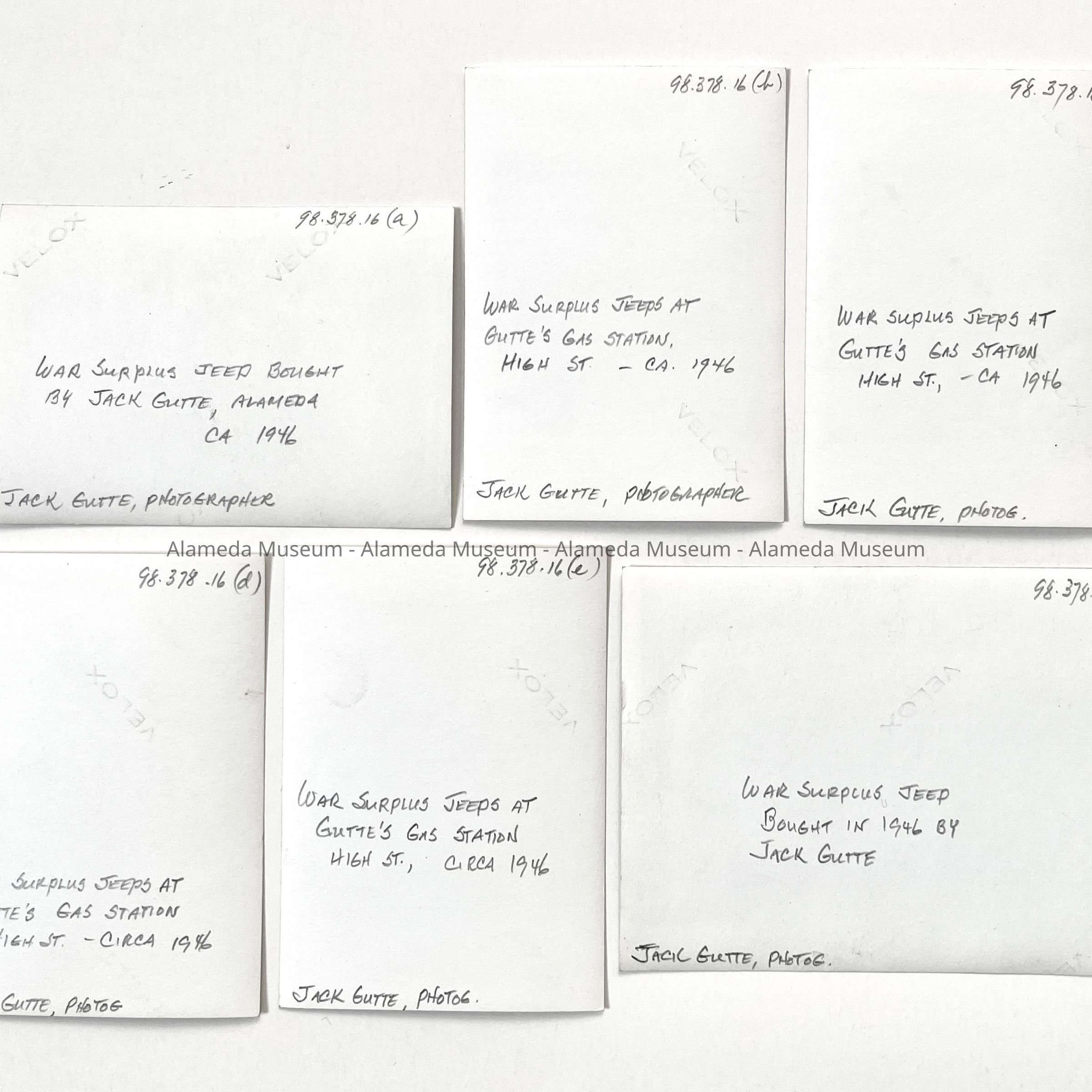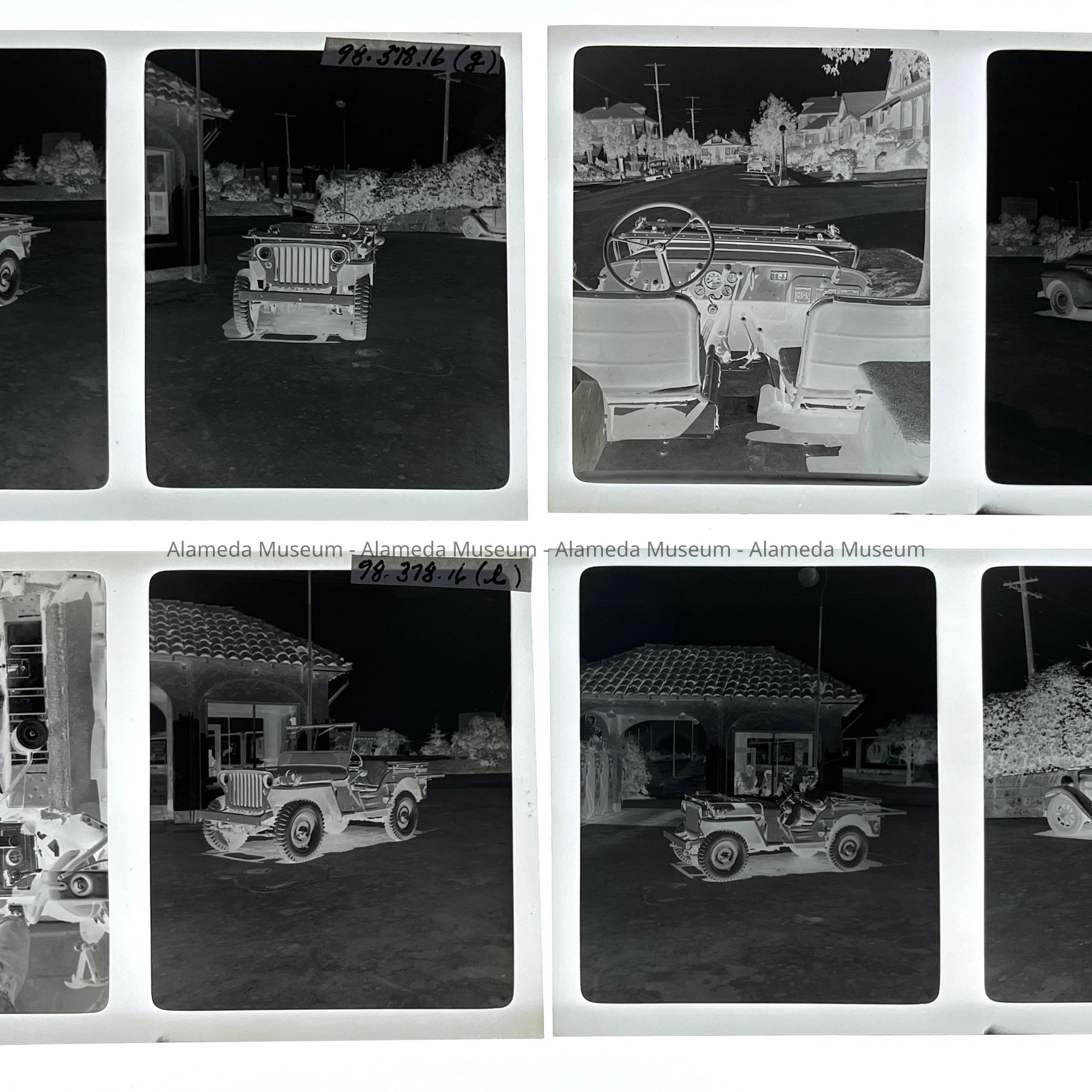History of Object: Series of images mostly showing war surplus jeeps purchased by the Gutte family, plus other vehicles: #a - jeep parked in residential area; #b-f: jeeps parked at the Gutte Gas Station on High St.; #g - (neg) two jeep views, one printed out as #f; #h (neg) - images of a jeep interior and a coupe, printed out as #i and #s; #i - photo taken within the jeep; #j - view of jeep's engine area; #k - jeep parked by station; #l (neg) - images printed out as #j and #k; #m (neg) images of the jeep and a coupe, not printed out; #n (neg) two jeep images, not printed out; #o and #p (negs.): two jeep images on each, not printed out; #q (neg): sedan image not printed out; #r - jeep parked in residential area; #s - sedan parked at the gas station.
