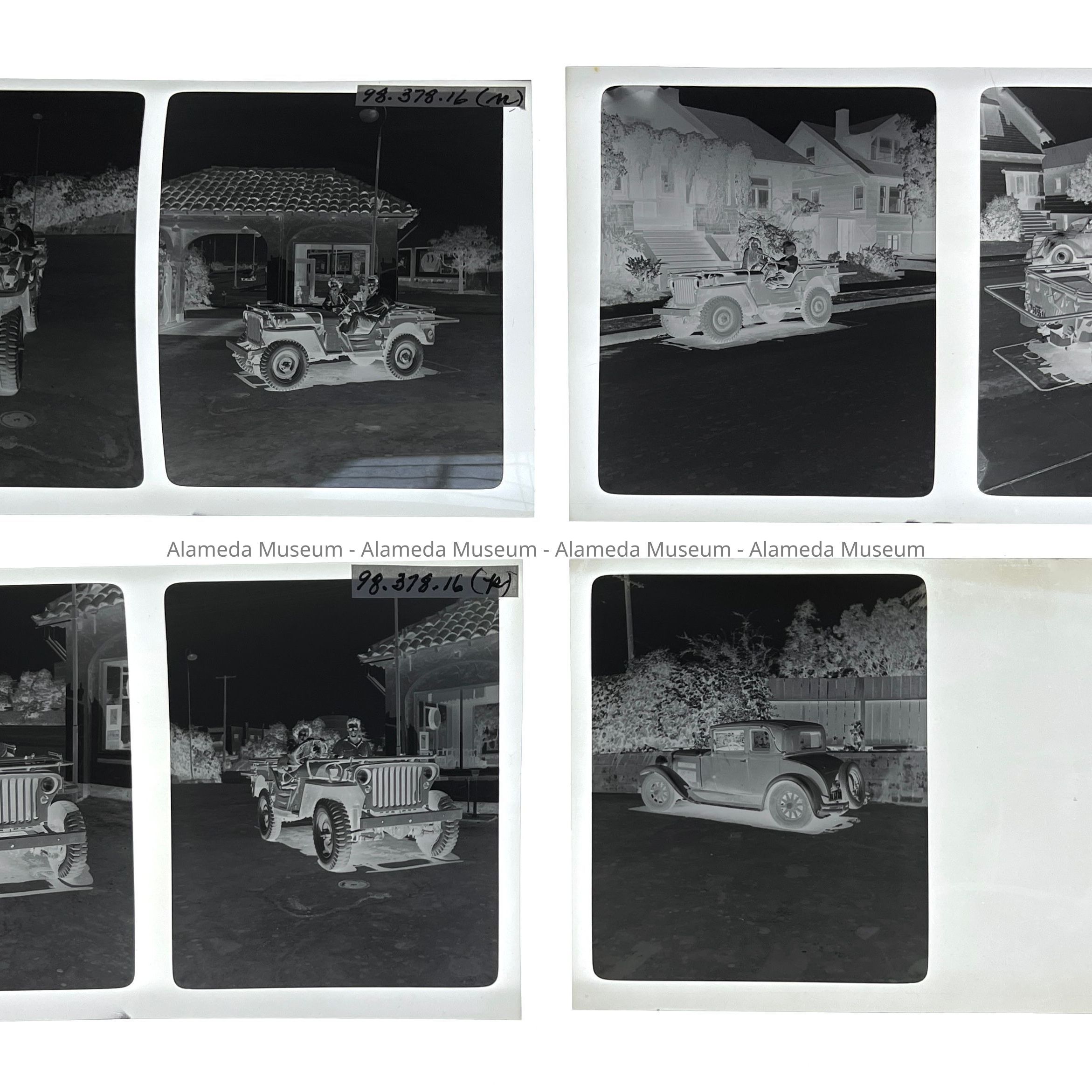 Description: Series of glossy black/white photos, a few with their negatives, plus unprinted negatives - all taken by Jack Gutte, a professional photographer in Alameda. All negatives, with one exception, comprise two separate images.