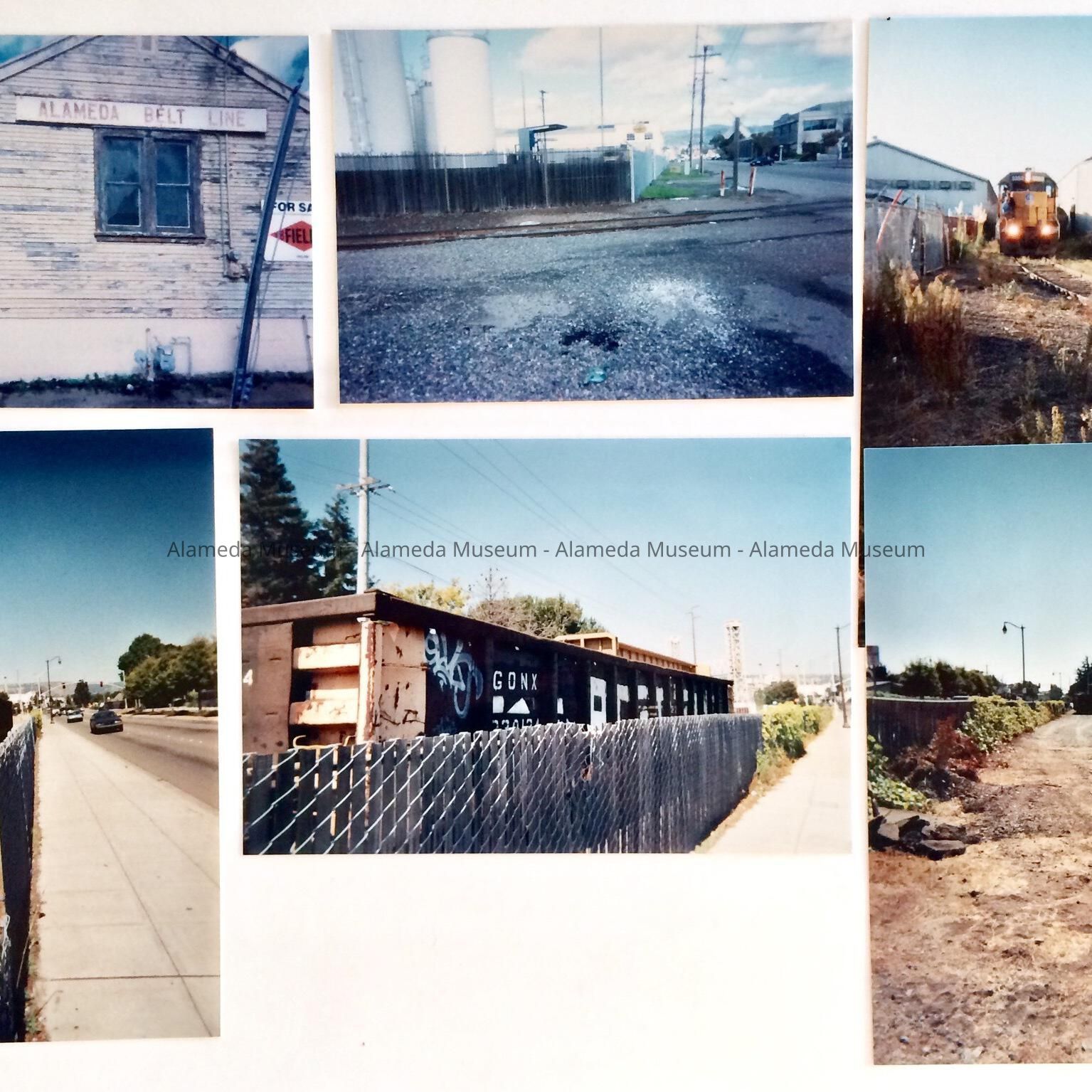 History of Object: Photos taken by Ken Keltz, an Alameda resident, of the vestiges of the Alameda Belt Line, as were still existing between 1999 and 2002. 1. Alameda Belt Line office, with sign, on Sherman, off Buena Vista, taken 1999. 2. Belt Line tracks running on the former Pennzoil Complex, corner Clement and Grand. 3. Union Pacific Switcher from Oakland yards, switching oiltank cars at the Pennzoil Complex, early fall 2000. 4, 5, 6: Union Pacific Work train cars from Oakland on newly graveled road bed, transferring old rail and ties to Oakland for disposal. The Fruitvale bridge can be seen on 4 and 5. Taken summer 2002, the last time trains ran on Alameda Island.