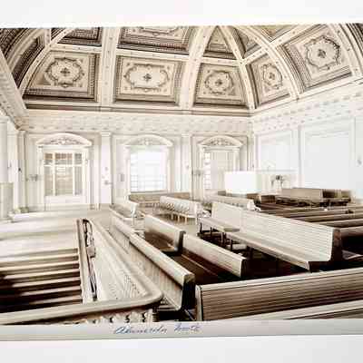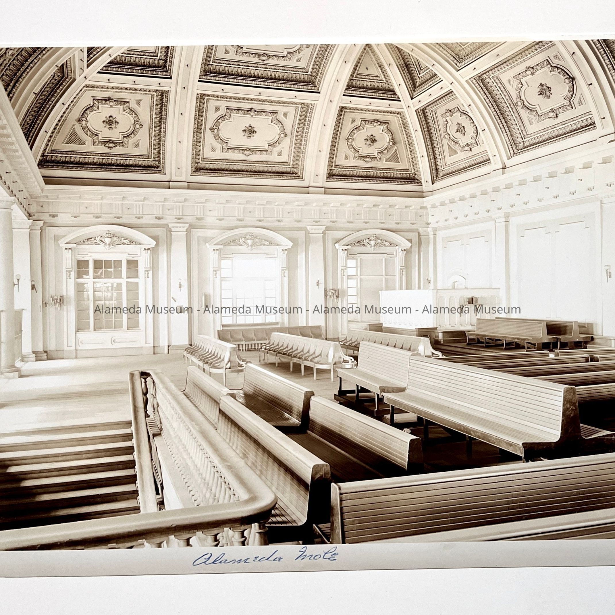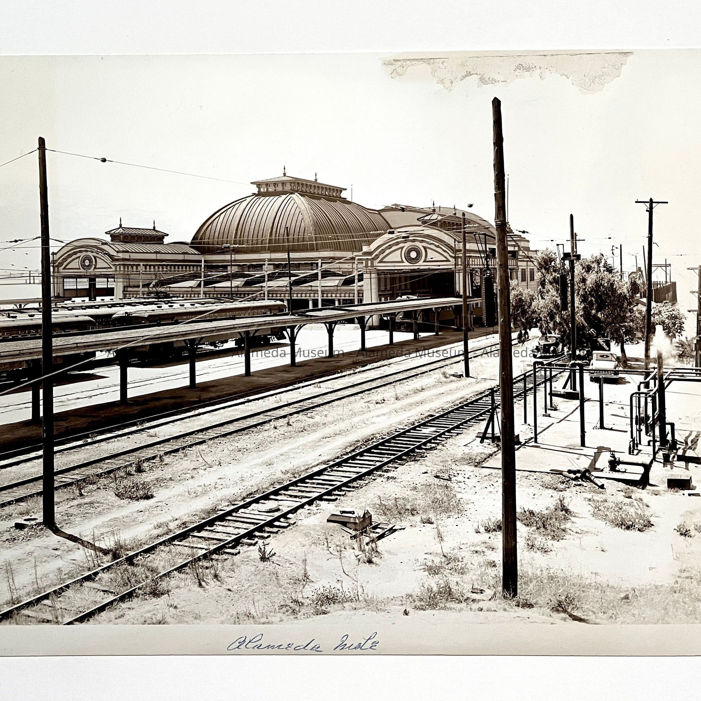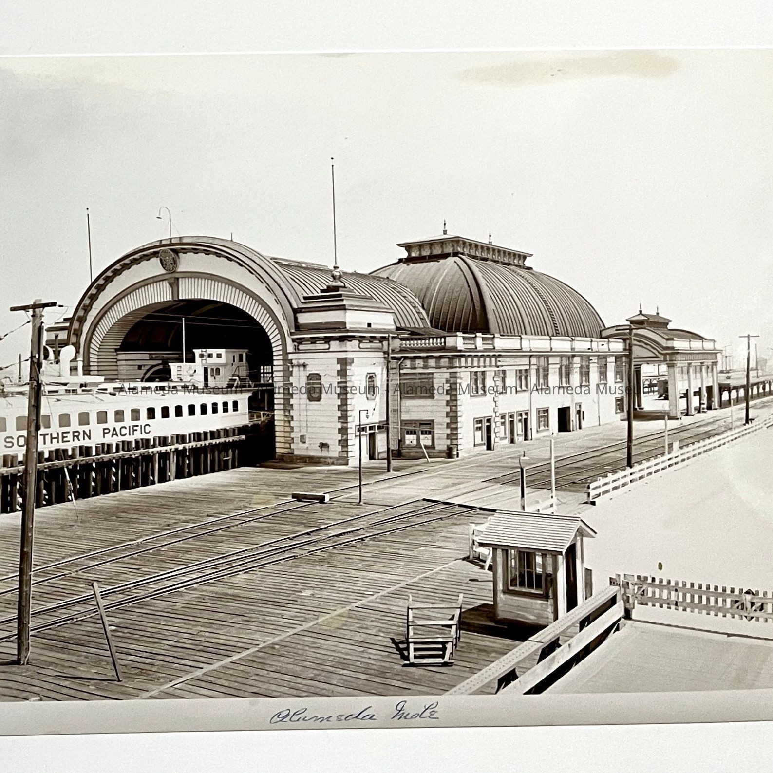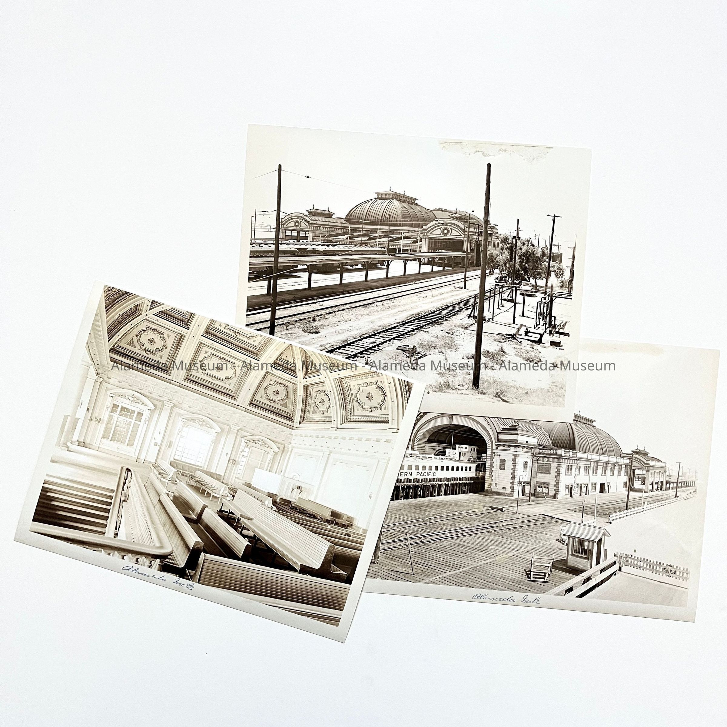 History of Object: Three views of the Alameda Mole, belonging to the Southern Pacific as a transit point between their trains and the trans-bay ferries. Image A) distant view of the Alameda Mole; B) closer exterior view of the Alameda Mole; C) interior view of the passenger waiting room showing the ornate ceiling. The donor's grandfather - Clarence B. Landis - worked for the Southern Pacific.
