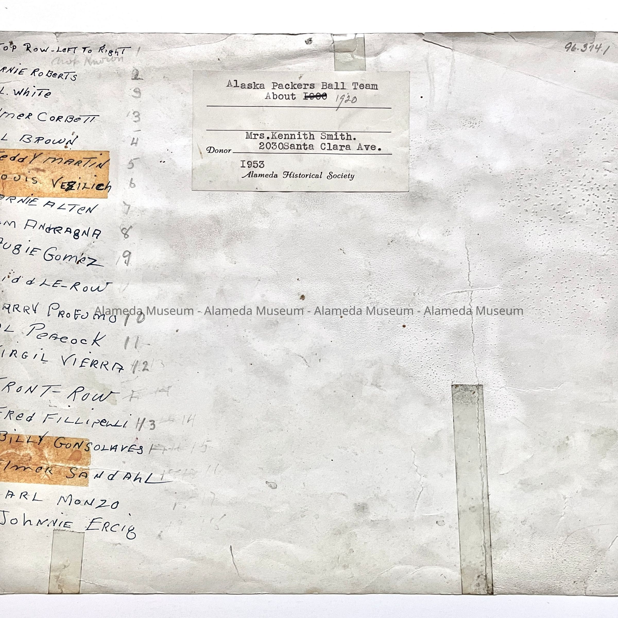 History of Object: Alaska Packers Baseball Team, ca. 1920. Members are assembled on a pier with an Alaska Packers vessel seen in the background. The members are identified on the verso as well as on a typewritten list glued to the upper right corner of the image.