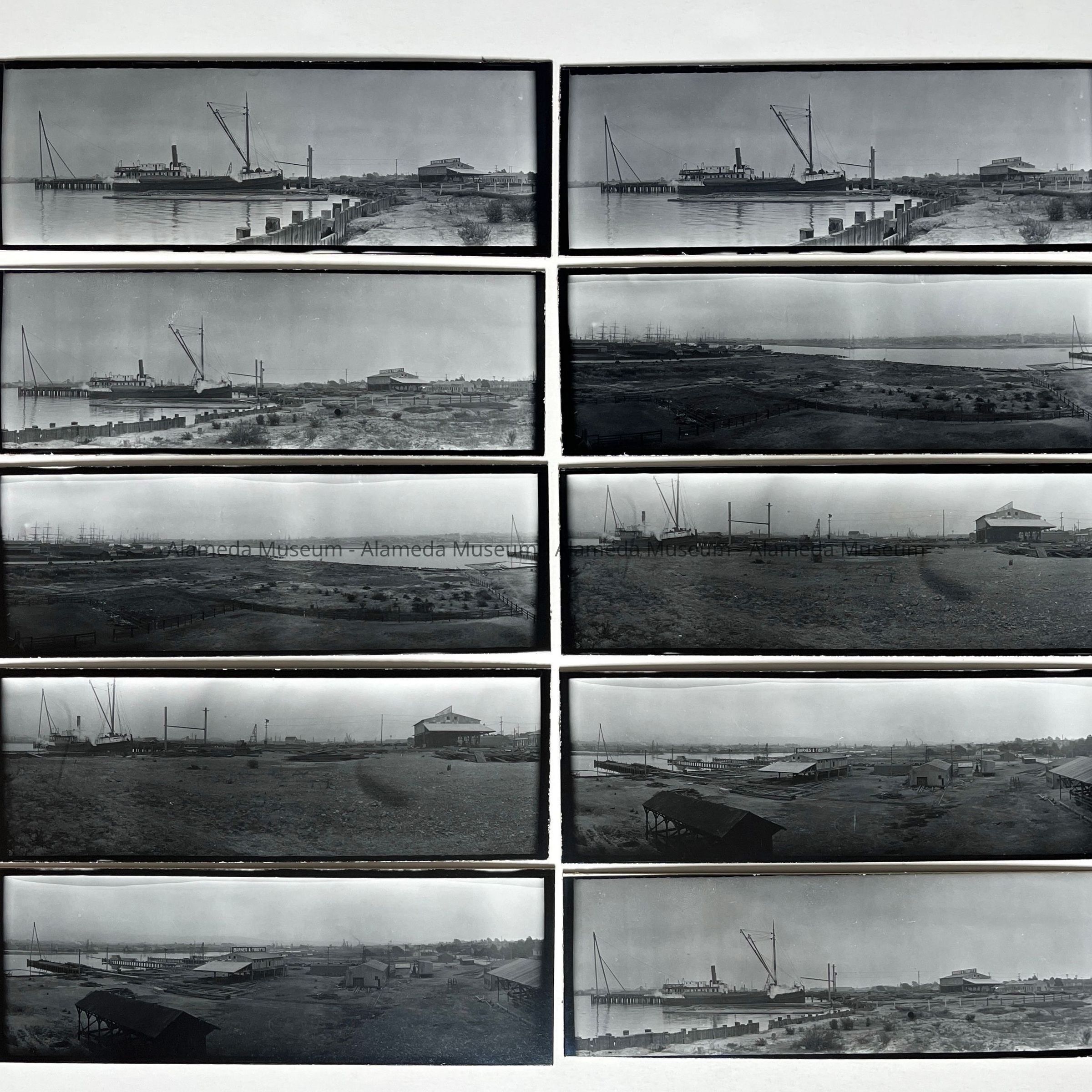 History of Object: Series of views of the Barnes & Tibbitts Shipyards: a-b) view of a small steamer docked by a pier; c) similar view of same; d-e) panoramic view of the grounds; f-g) another view of same; h-i) another view of grounds; j) identical view of small steamer, item #c).