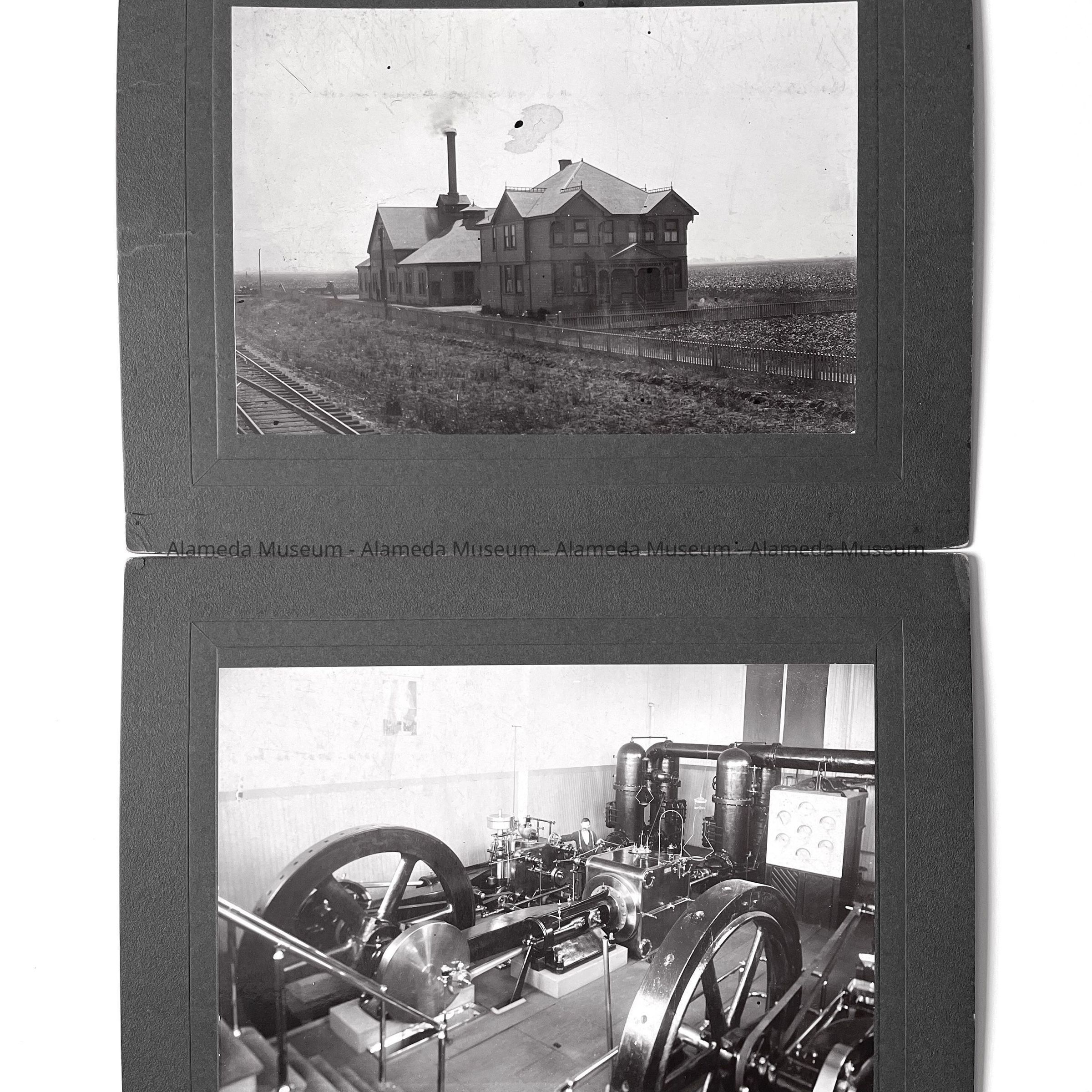 History of Object: Views of the Fitchburg water pumping station in Oakland, located at site between present-day Colisseum and East 14th St. an alternative source of water for Alameda: #a - exterior view; #b - the pumping mechanism. Joe Sunhill is listed as the engineer-in-charge.
