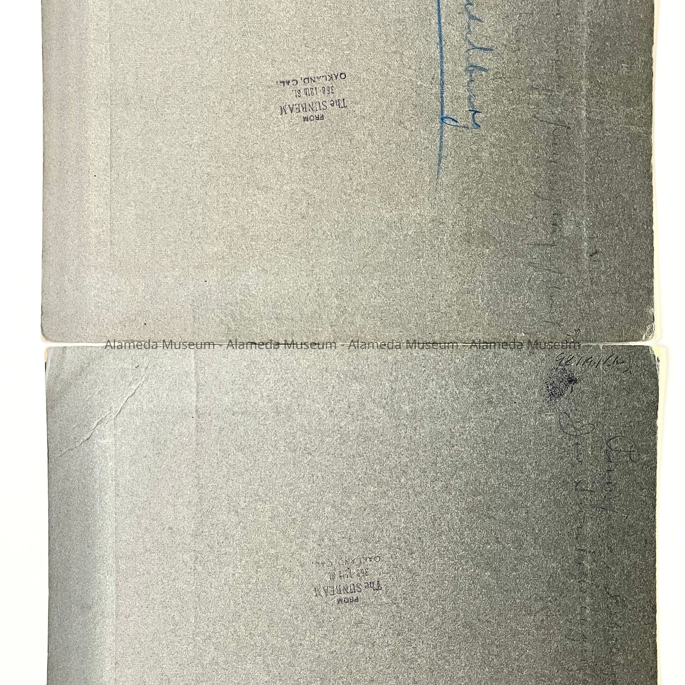 Description: Sepia-toned albumen print photos, mounted on dk. grey paperboard. Photographer: The Sunbeam, 368 12th St., Oakland, CA. Image #a has minor spotting on both its mounting and on the emulsion.