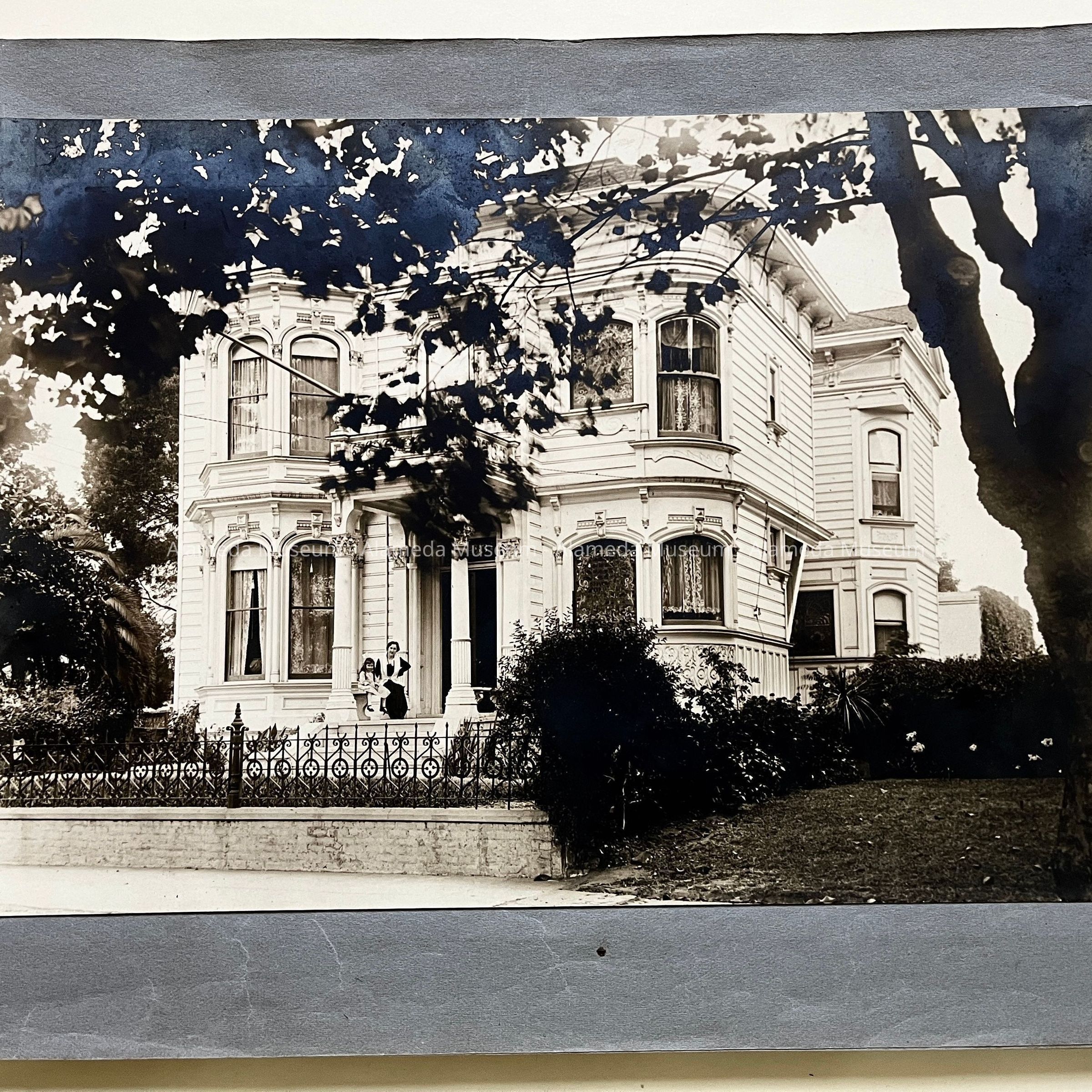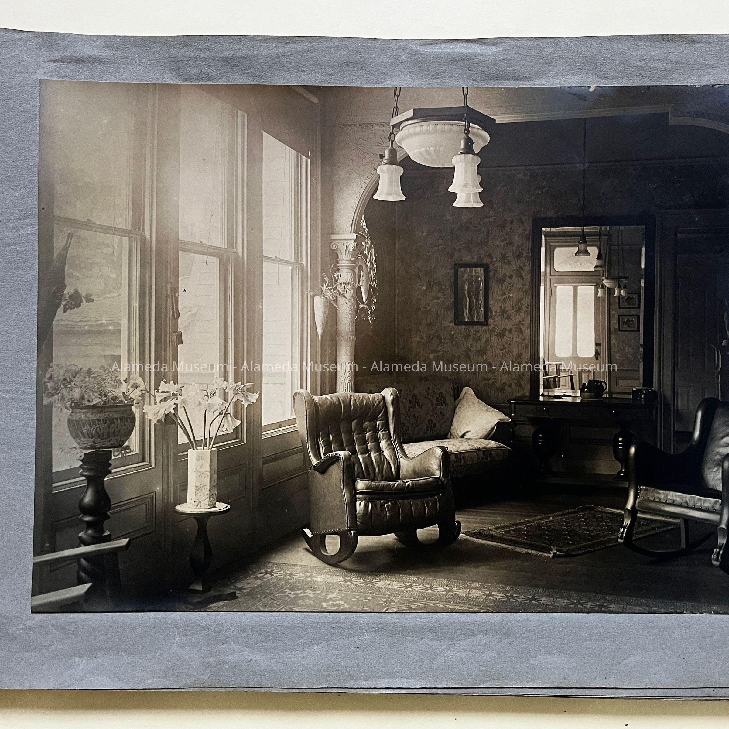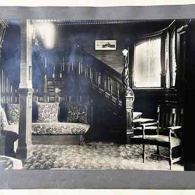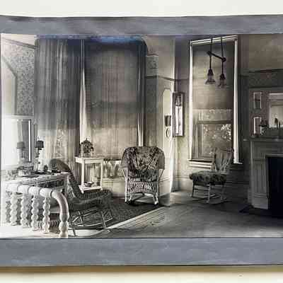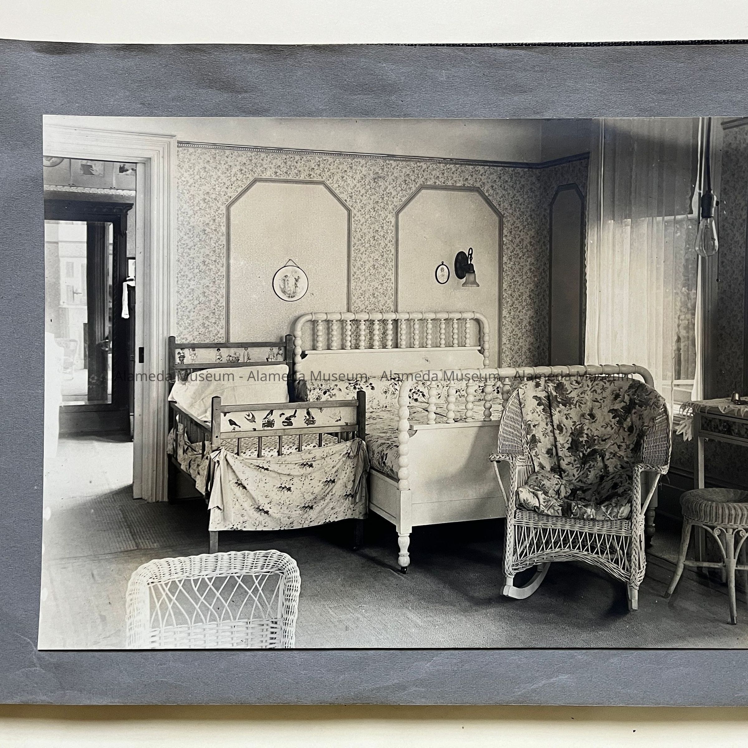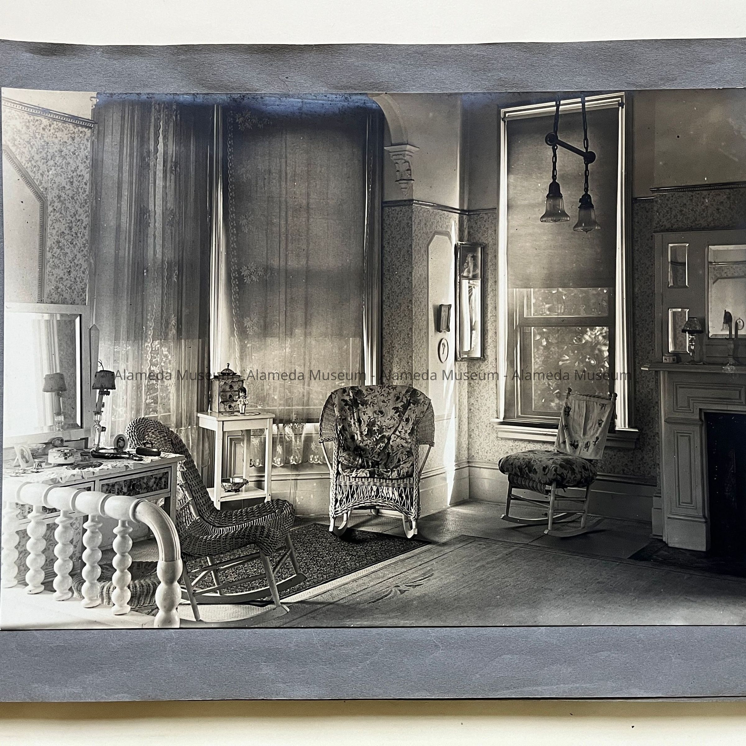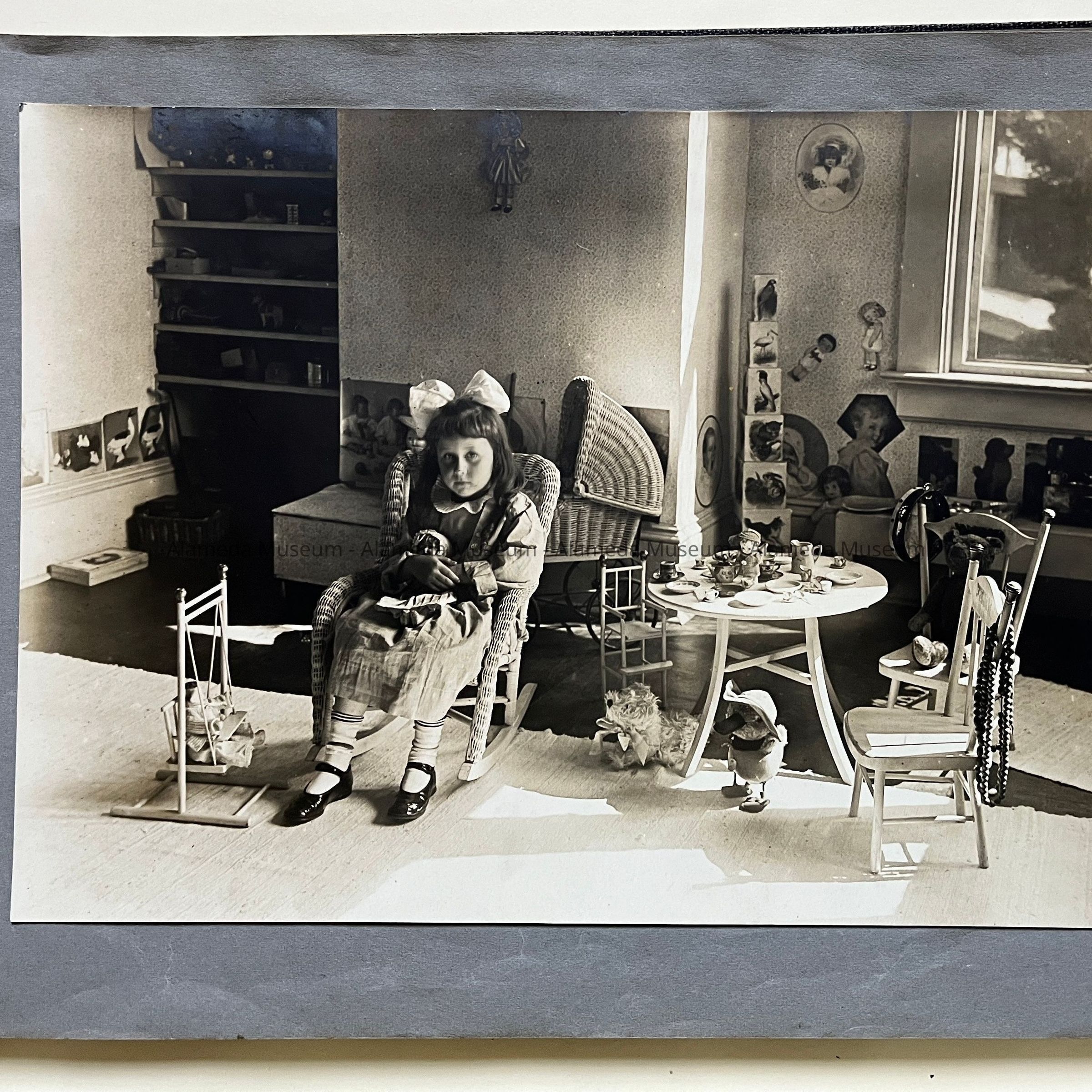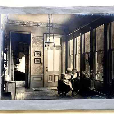 History of Object: Views of the Herbert home at 1433 Morton Street: #a - exterior view of the front, showing a governess with a young girl on the porch; #b - another front view showing the large garden at the left; #c - bottom of grand staircase featuring a bronze light fixture upon the newel post; #d - distant view of the staircase bottom; #e - inner parlor view; #f - view of an alcove area; #g - sitting room with leather rocking chairs; #h - same room, different angle, showing a governess seated in a chair with the young girl on her lap; #i -side room with a round dining table; #j - nursery, with wicker furniture; #k - furniture in the nursery; #l - the young girl seated in her playroom amid her many toys.