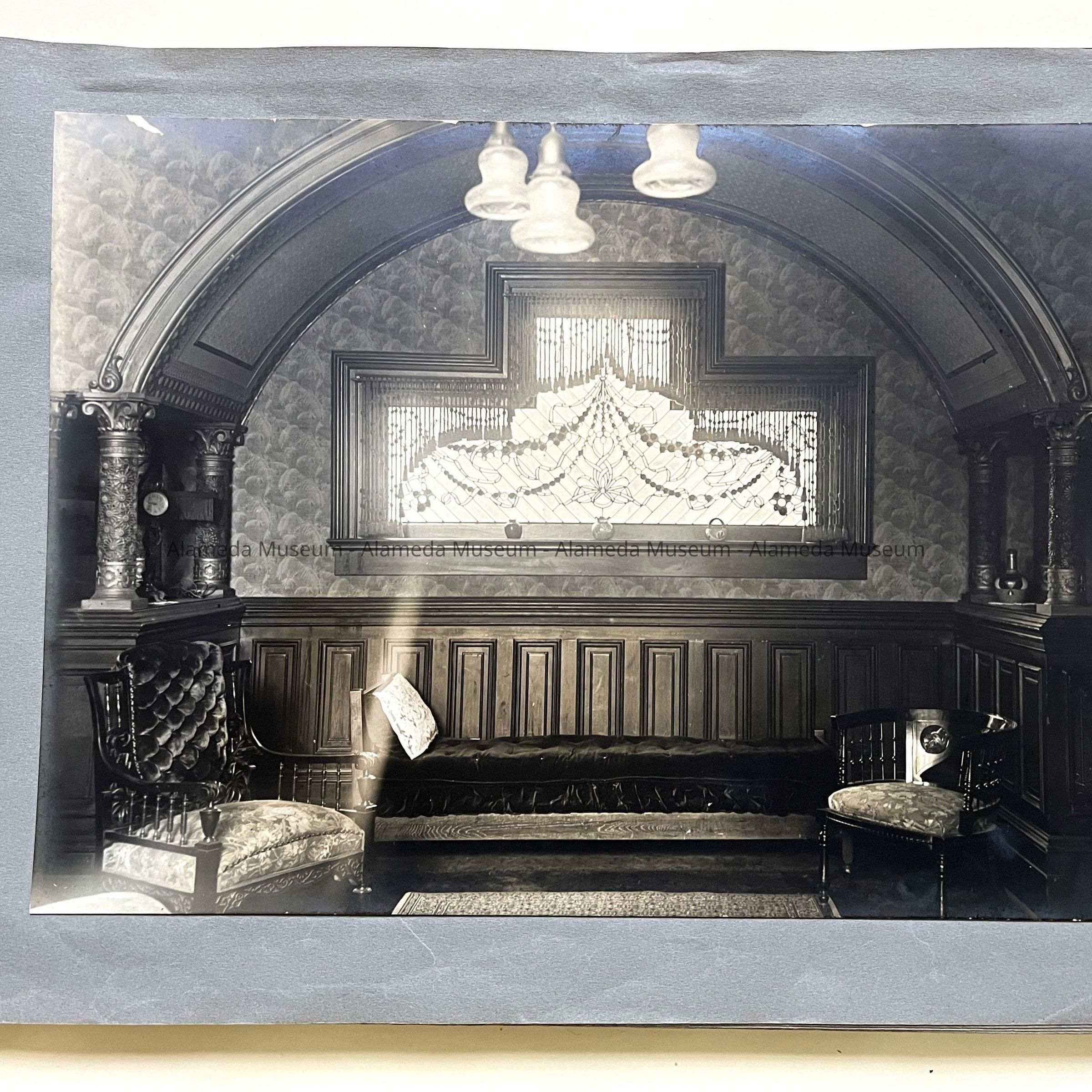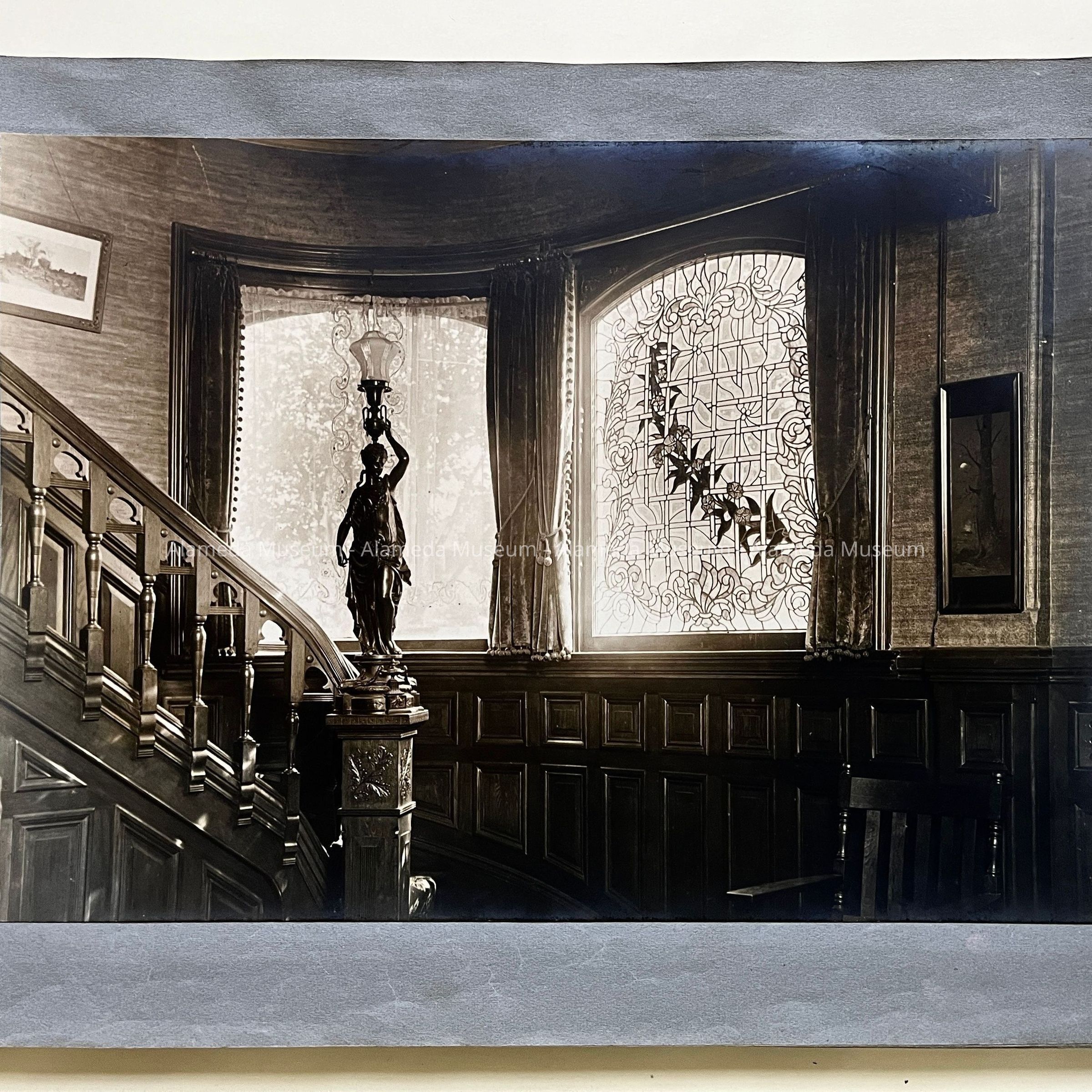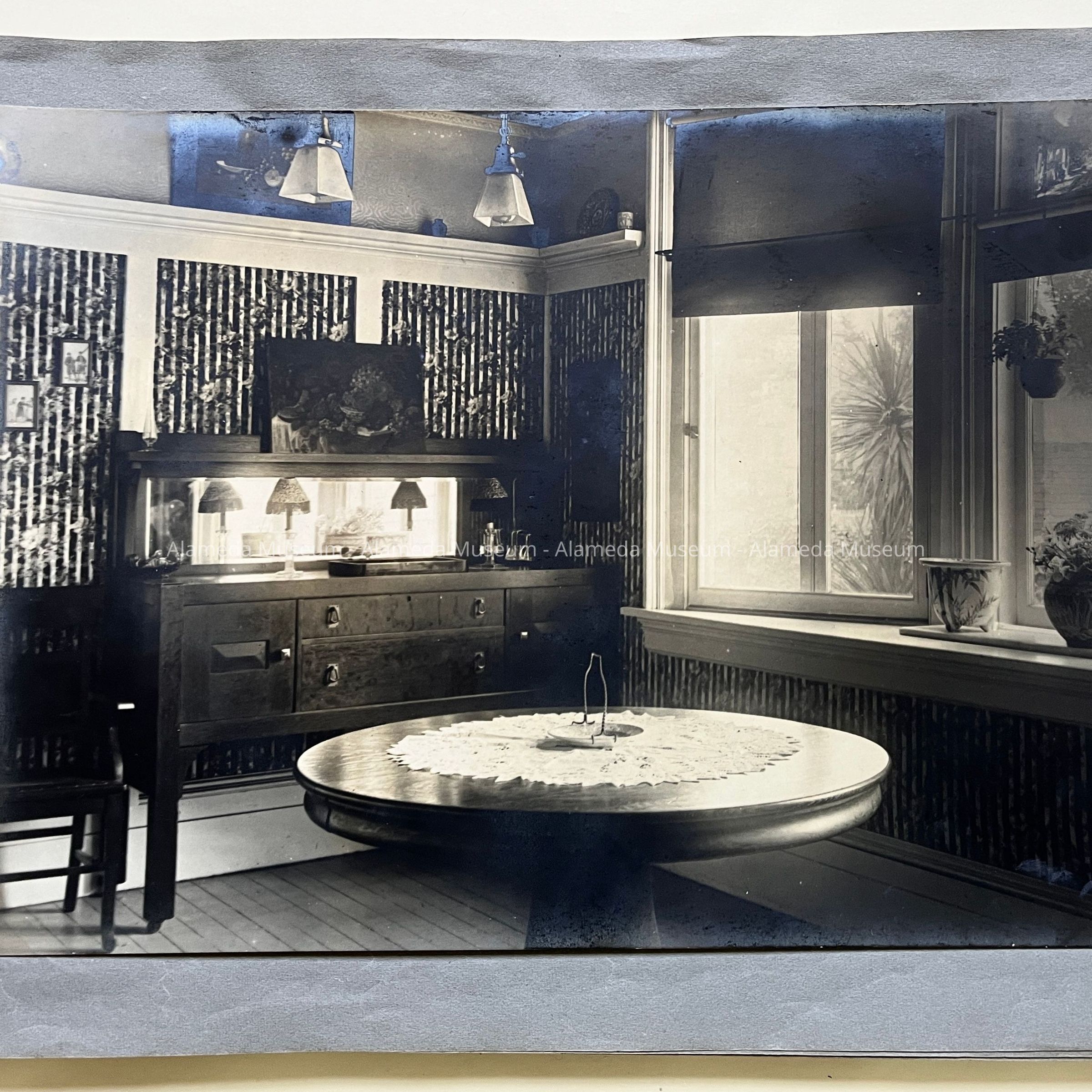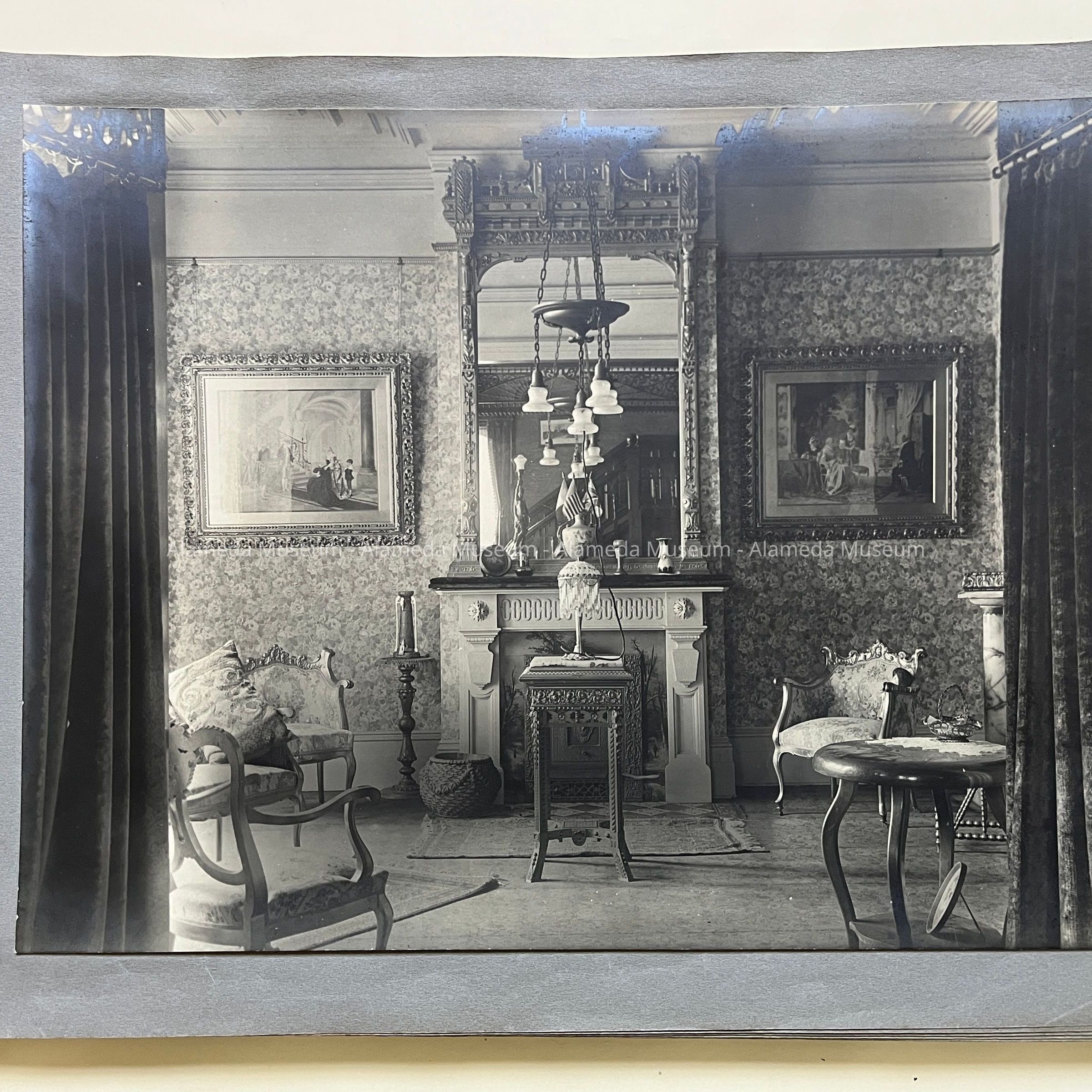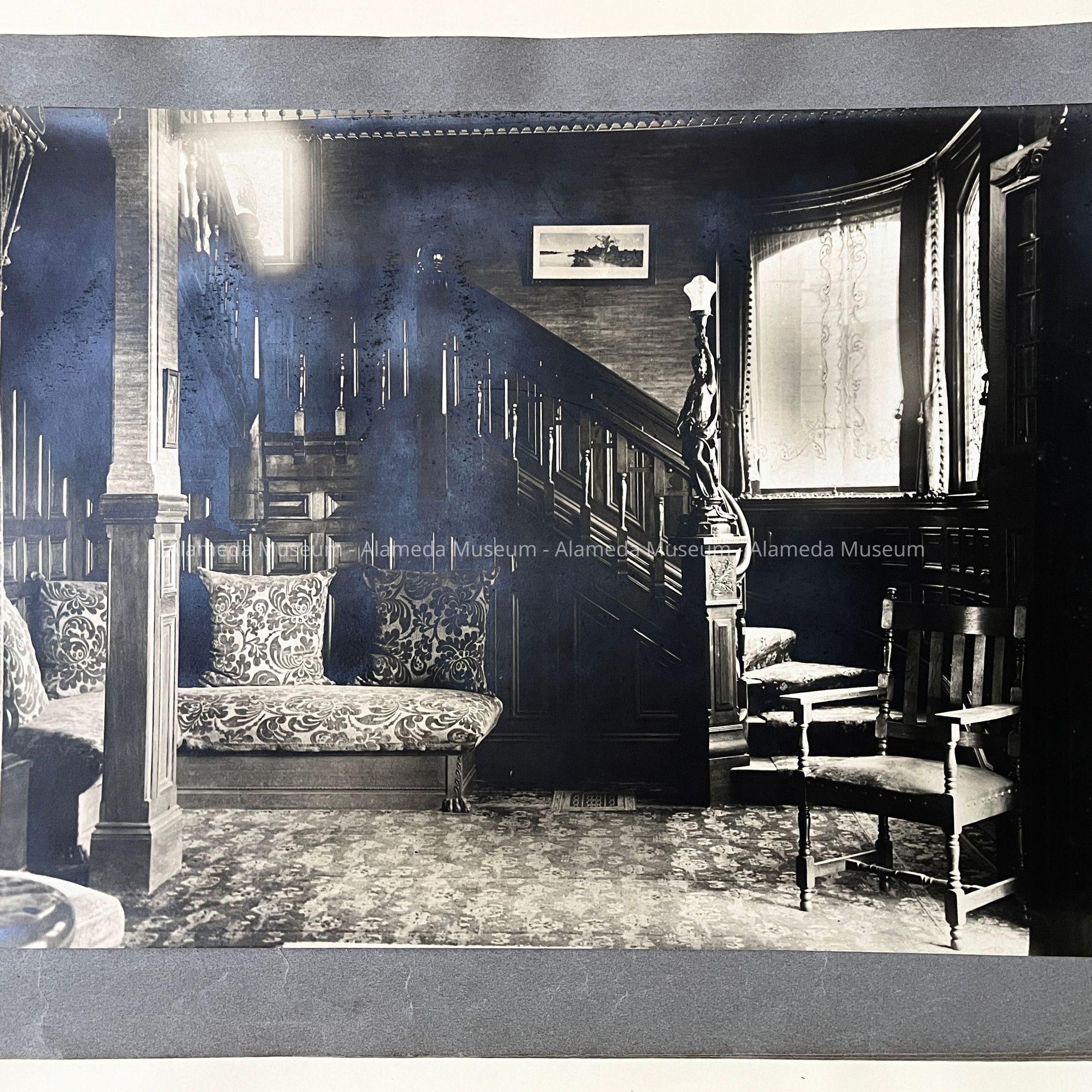History of Object: Views of the Herbert home at 1433 Morton Street: #a - exterior view of the front, showing a governess with a young girl on the porch; #b - another front view showing the large garden at the left; #c - bottom of grand staircase featuring a bronze light fixture upon the newel post; #d - distant view of the staircase bottom; #e - inner parlor view; #f - view of an alcove area; #g - sitting room with leather rocking chairs; #h - same room, different angle, showing a governess seated in a chair with the young girl on her lap; #i -side room with a round dining table; #j - nursery, with wicker furniture; #k - furniture in the nursery; #l - the young girl seated in her playroom amid her many toys.