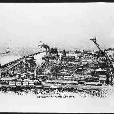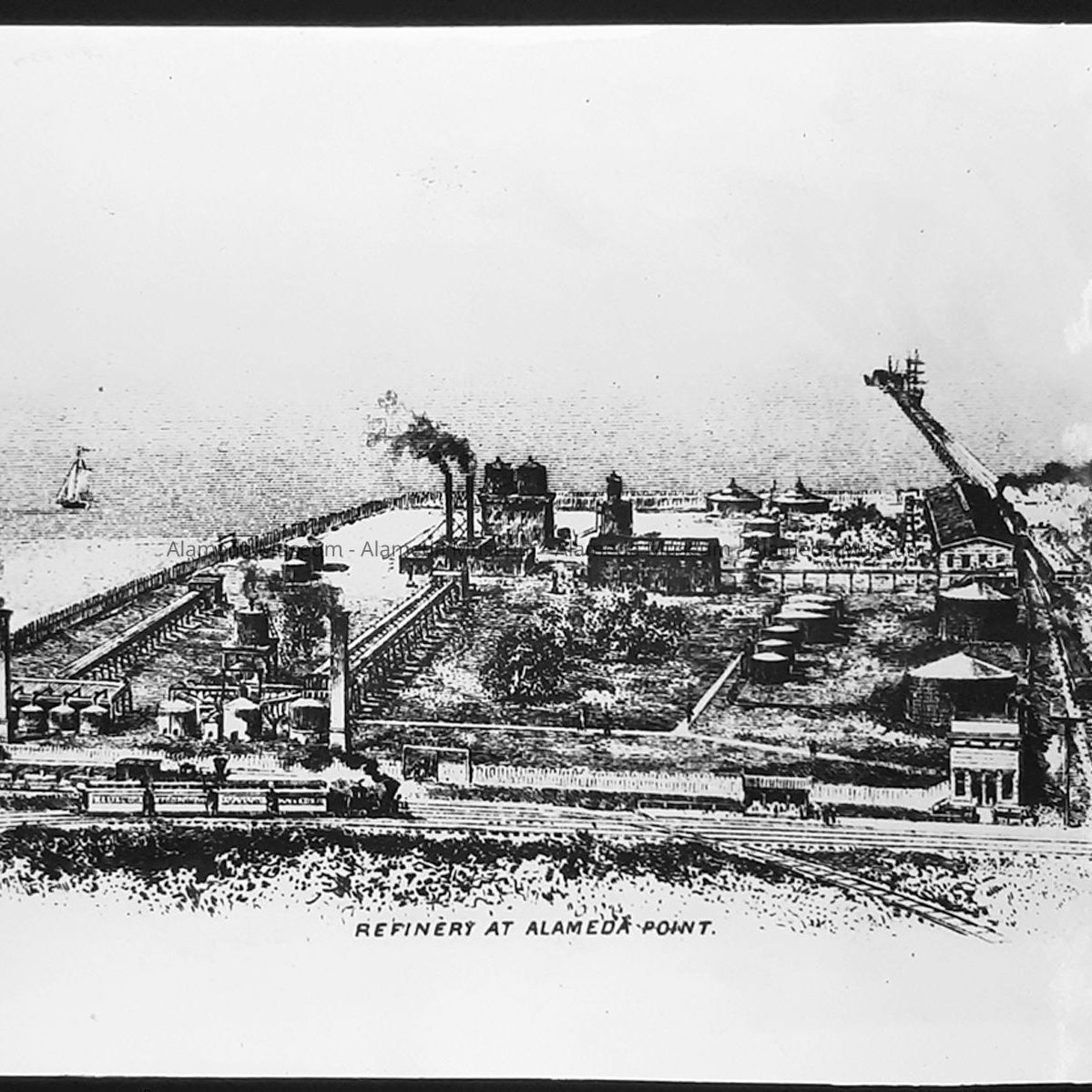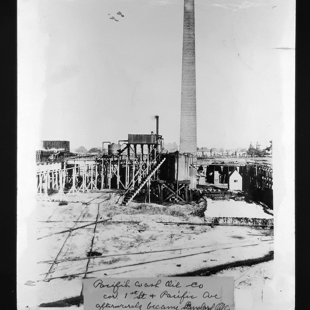 History of Object: Various views of the Pacific Coast Oil Company plant, at the corner of 1st Street and Pacific Avenue, which was built in 1879 and bought out by Standard Oil of California in 1900, The latter company dismantled the refinery in 1903 when its Richmond plant replaced it. This site eventually became part of the Naval Air Station. Views: a) refinery scene, featuring the tall brick chimney; b) large oil drum, vertical; c) panoramic view of the plant; d)general view of the refining operation from an engraving or print.