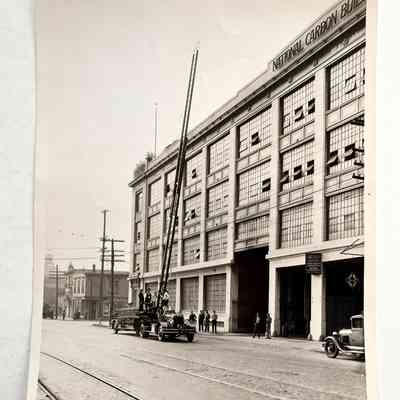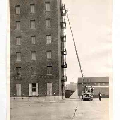 History of Object: Various Alameda Fire Department scenes: A-B) exterior views of the 635 Pacific Avenue fire station; c) resuscitation demonstration at the 635 Pacific Avenue fire station; D-E) Alameda Fire Department aerial ladder trucks in front of the National Carbon Bldg. in Oakland; F-H) Alameda Fire Department members at a training facility in Oakland; I) testing a ladder pipe near the Webb Avenue fire station.