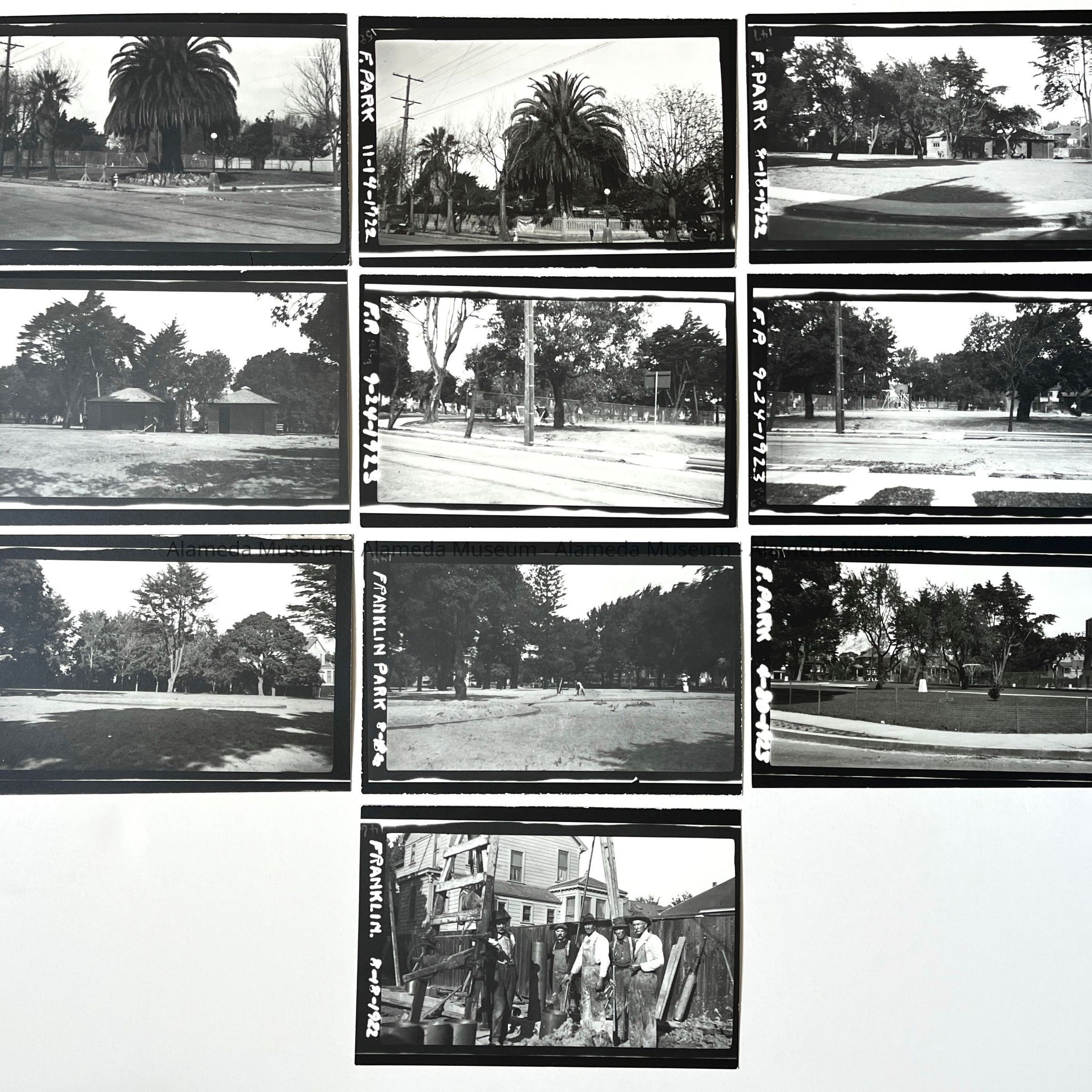 History of Object: Various views of Franklin Park taken in the years indicated: (a) palm tree - 1924; (b) palm tree - 1924; (c) maintenance bldg. - 1922; (d) maintenance building - 1922; (e) park view - 1923; (f) park view - 1923; (g) park view - 1922; (h) park view - 1922; (i) park view w/water tower - 1923; (j) group of workers - 1922.