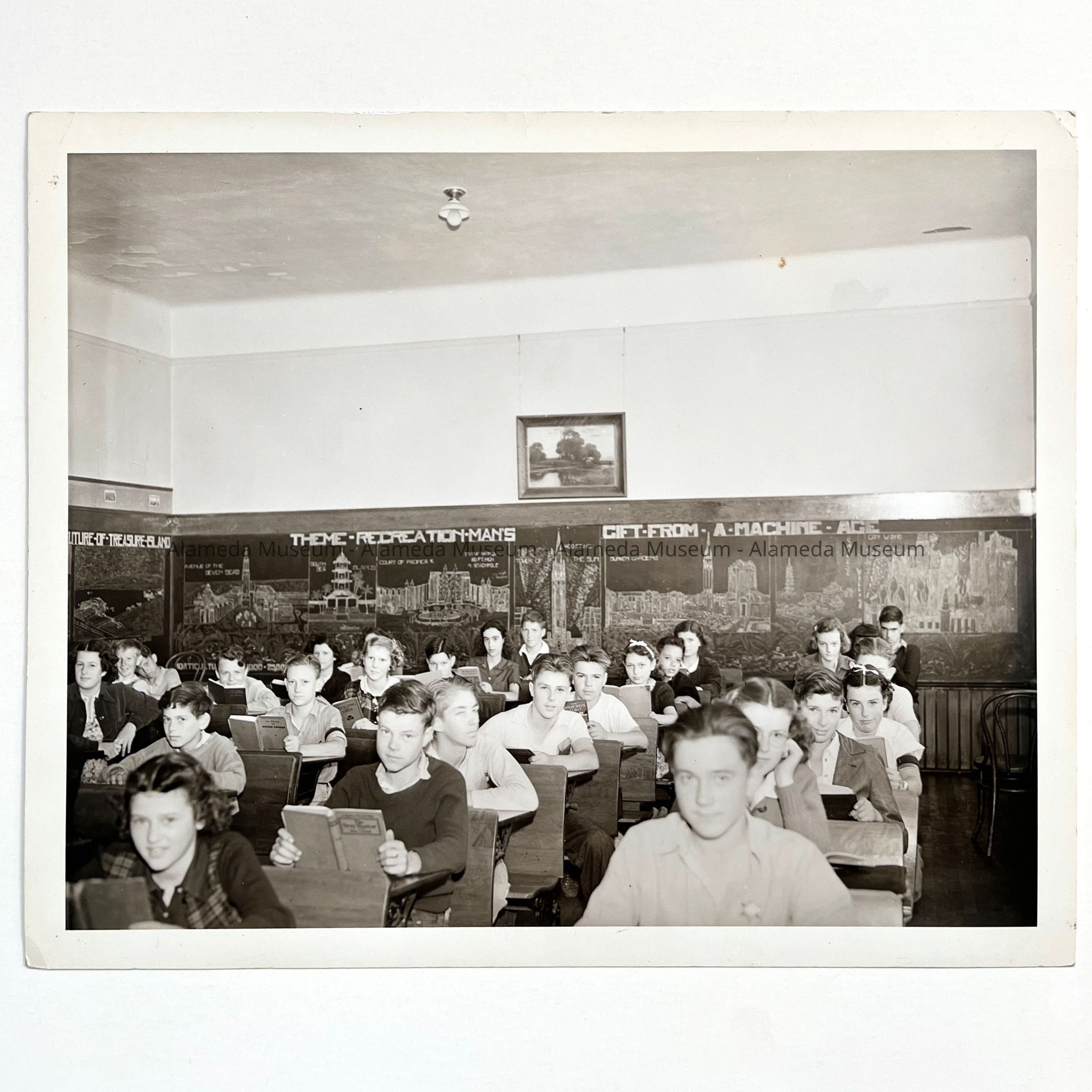 History of Object: Various views of Washington School student activities: #a - students seated at desks in Miss Mensing's classroom; #b-d - traffic patrol boys in uniform, wearing caps with the Associated Oil emblem provided by the Gutte Service Station on High Street.