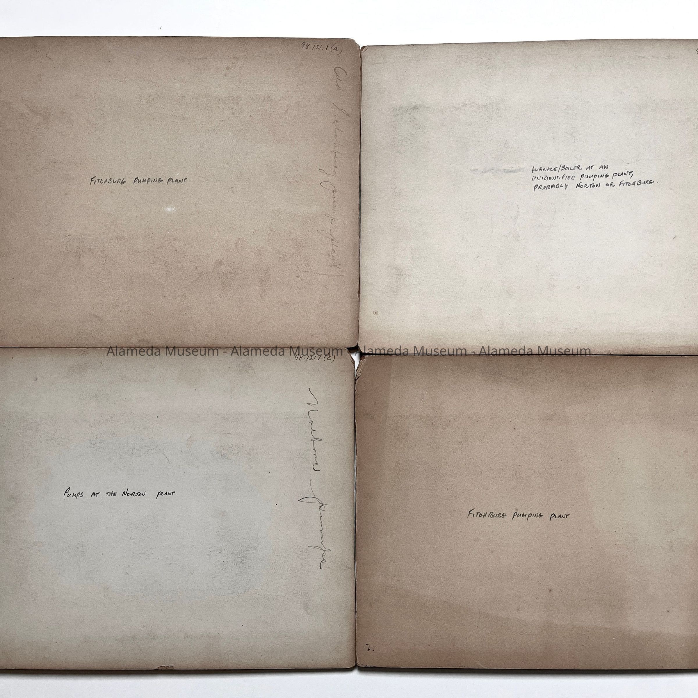 History of Object: Views of water pumping plants: #a - exterior view, Fitchburg plant; #b - a furnace/boiler an unidentified plant; #c - pumps at the Norton plant; #d - Fitchburg plant, distant view.
