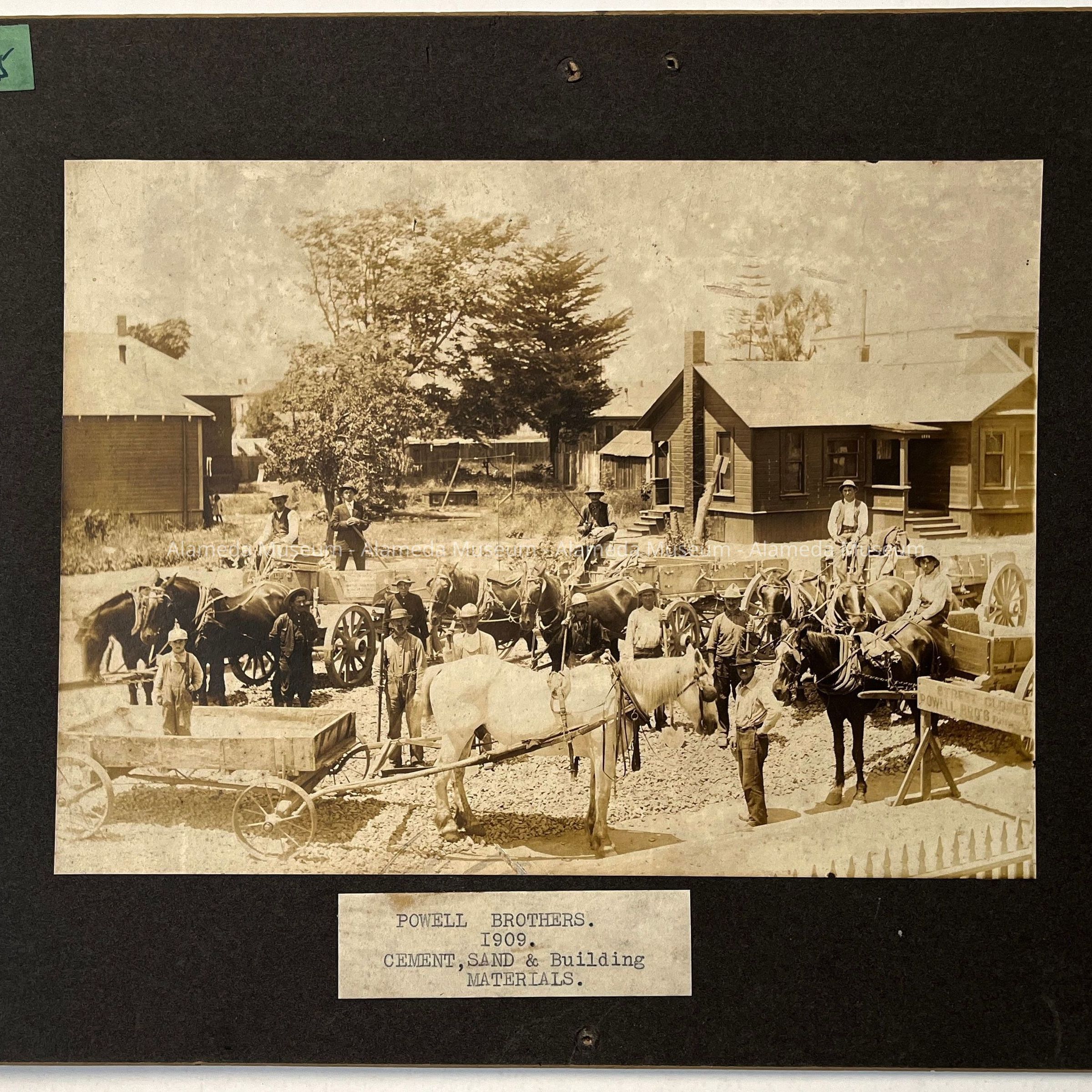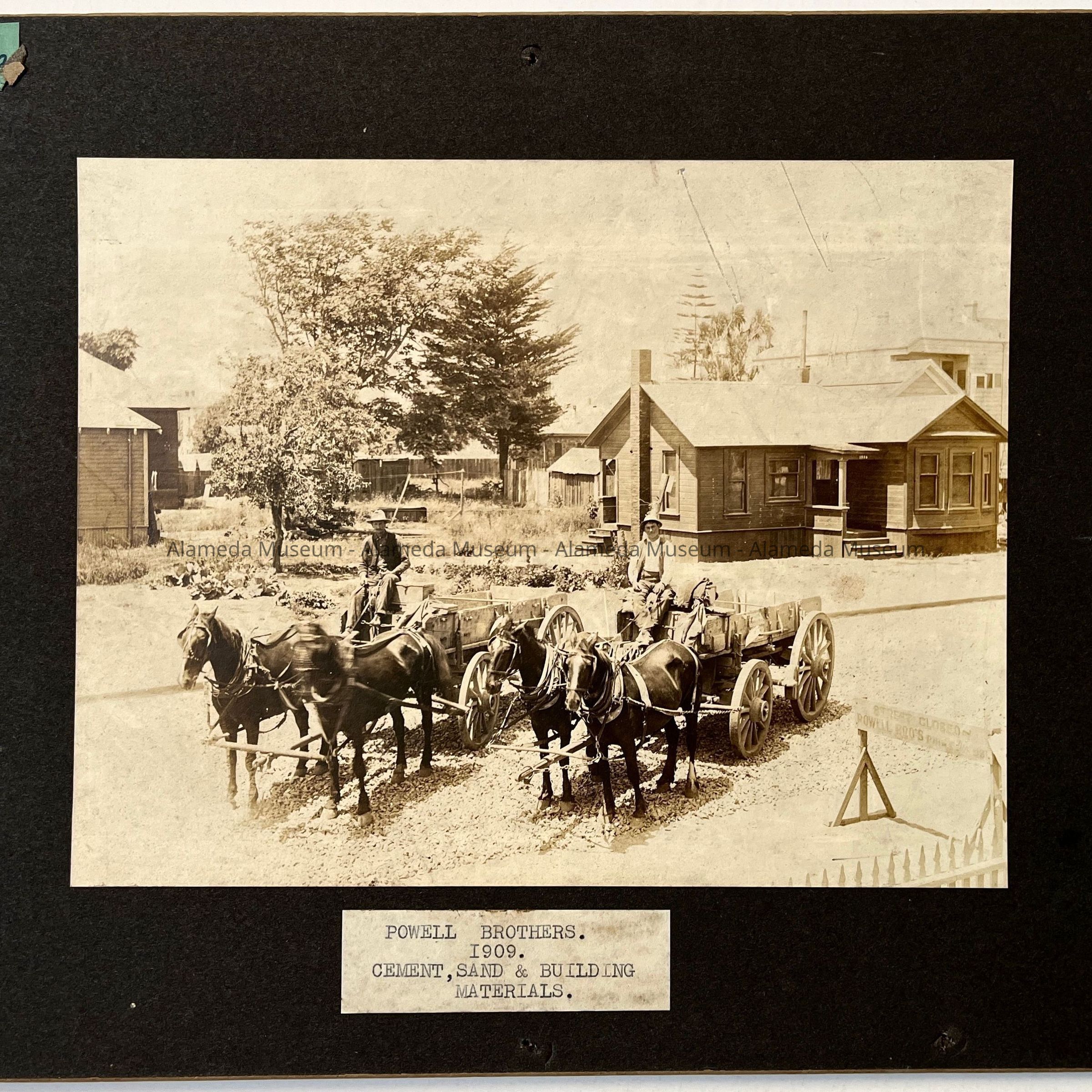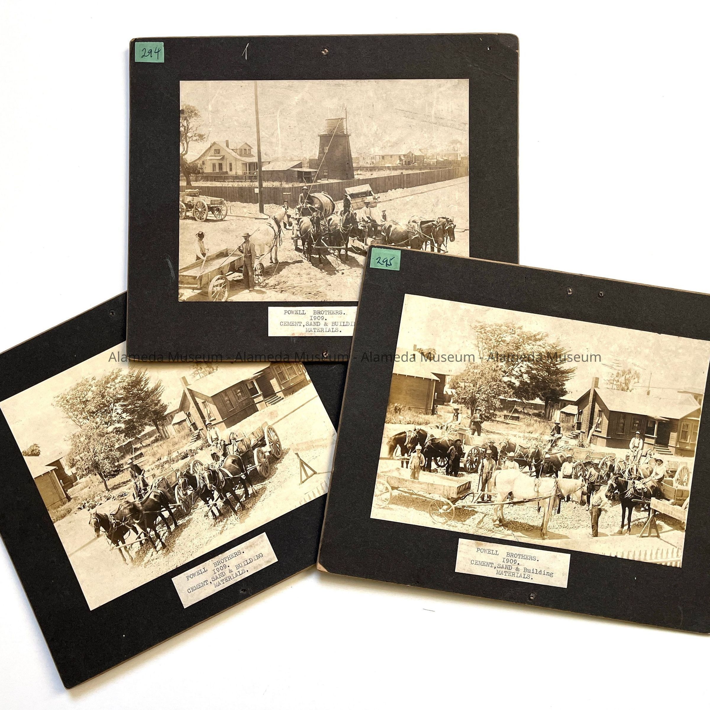 History of Object: Three operational views of the Powell Brothers, a cement, sand and building material firm, at work on an Alameda street. Horsedrawn wagons in context with piles of gravel and other road-building supplies, are posed in similar, but not identical, groupings.
