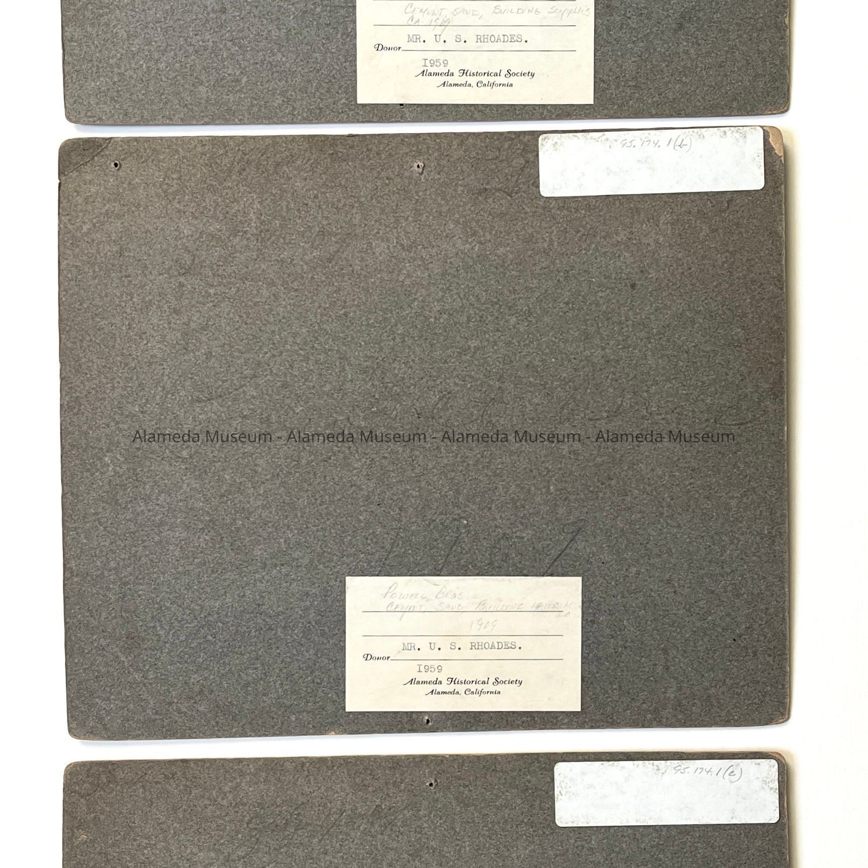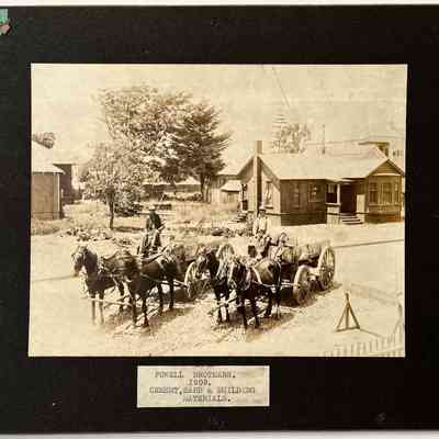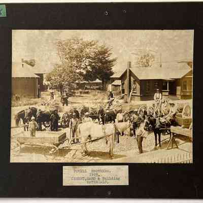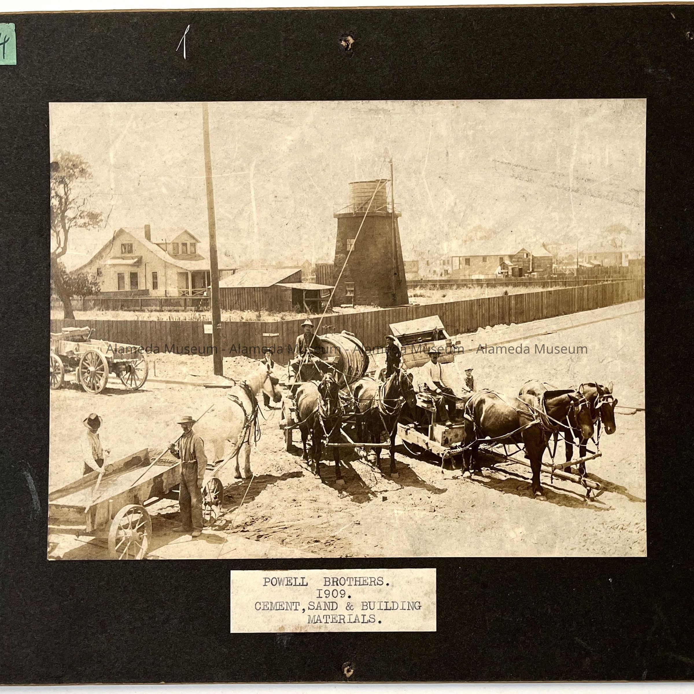 History of Object: Three operational views of the Powell Brothers, a cement, sand and building material firm, at work on an Alameda street. Horsedrawn wagons in context with piles of gravel and other road-building supplies, are posed in similar, but not identical, groupings.