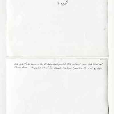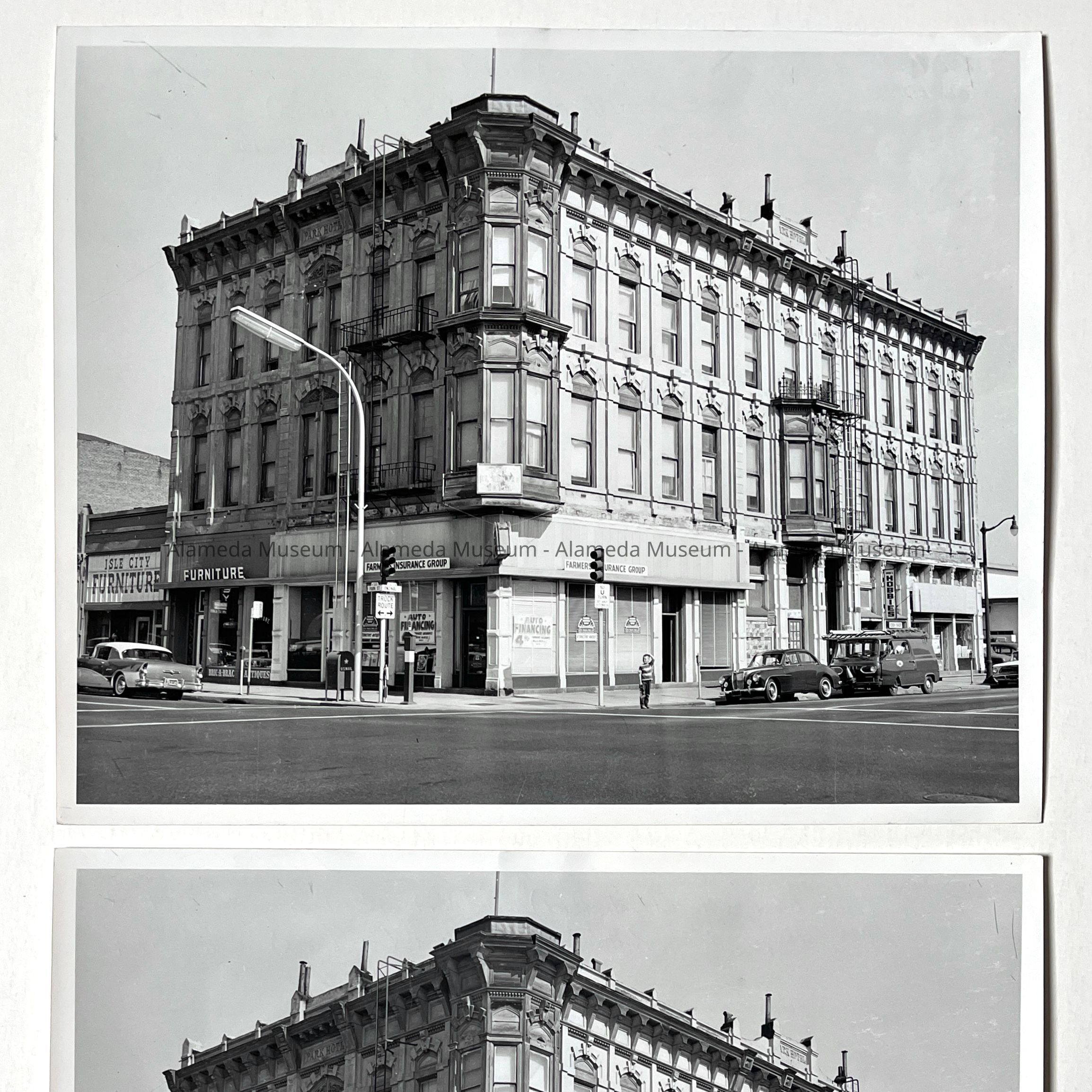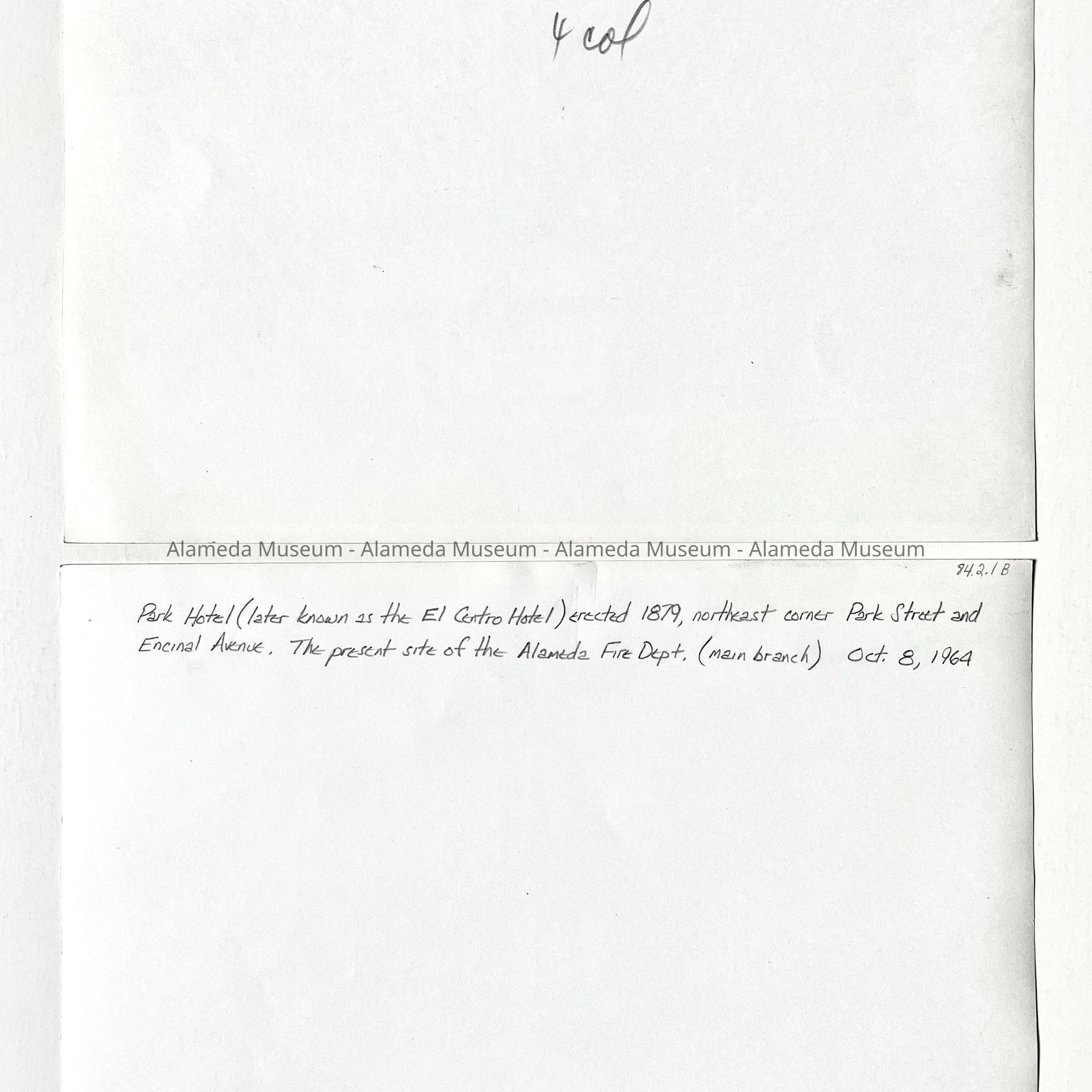 History of Object: Photo of the Park Hotel (later known as the El Centro Hotel), erected 1879, northeast corner Park Street and Encinal Avenue. The present site of the Alameda Fire Dept. (main branch). Oct. 8, 1964