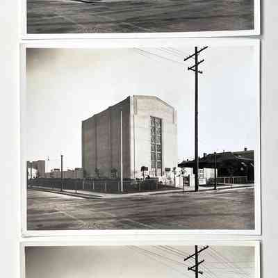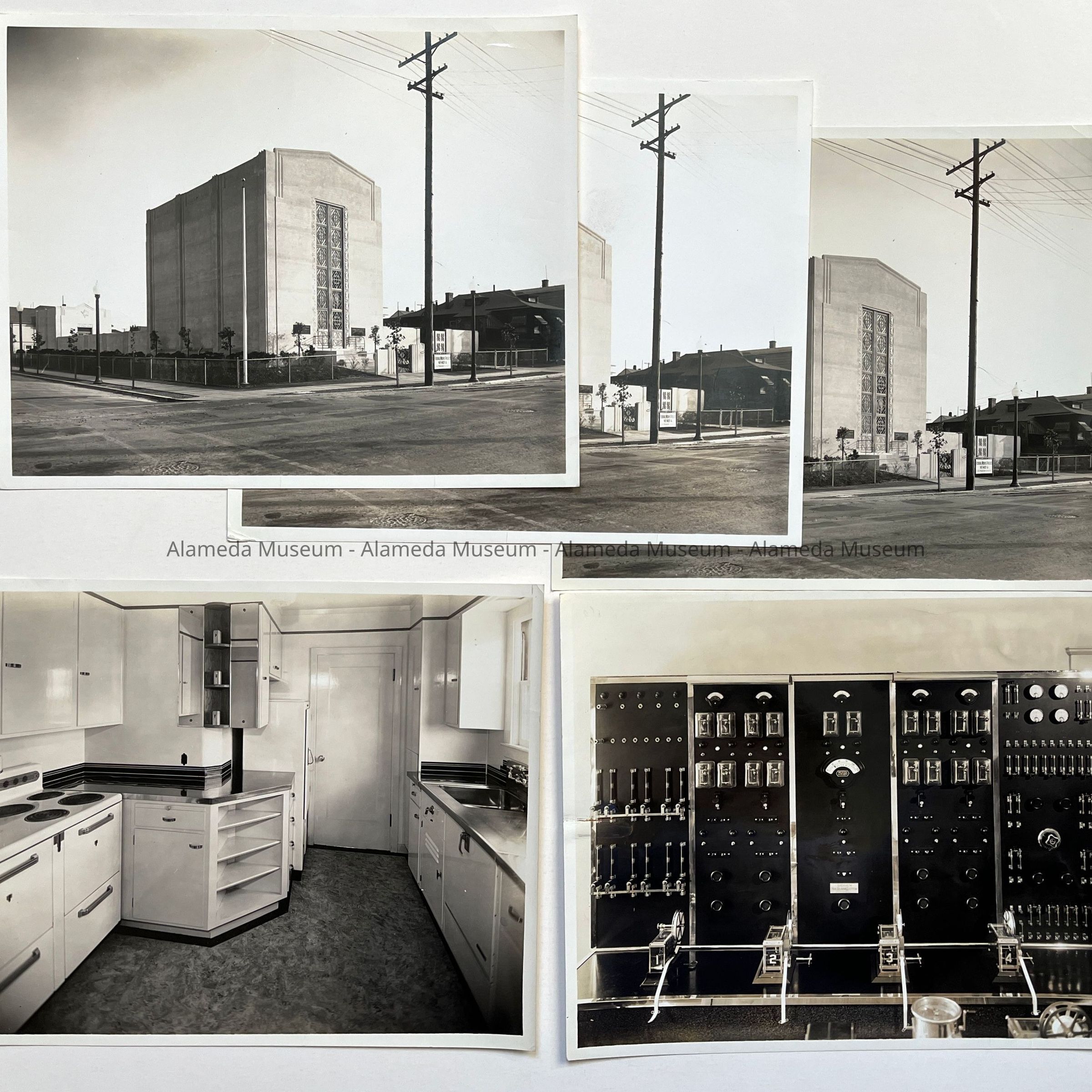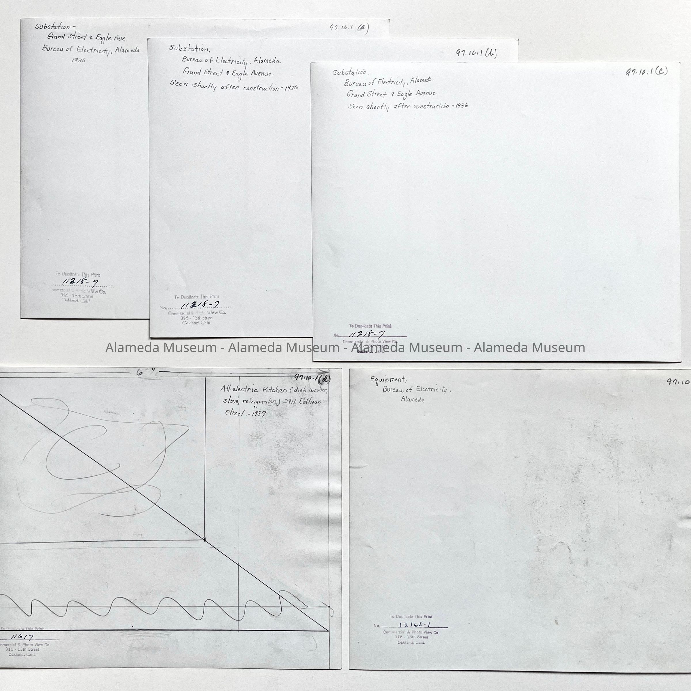 History of Object: Five photos apparently commissioned by the Alameda Bureau of Electricity to illustrate its projects: a,b.c) identical views of the Grand Street and Eagle Avenue substation; d) an all-electric kitchen at a residence at 2911 Calhoun St., Alameda; e) a group of electrical fire alarm panels, location unknown (see cost estimate sheet, attached to this card).