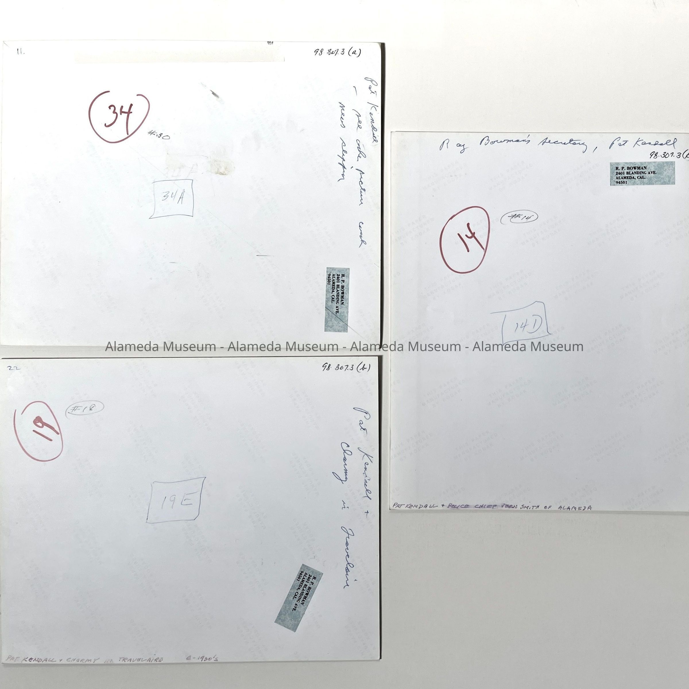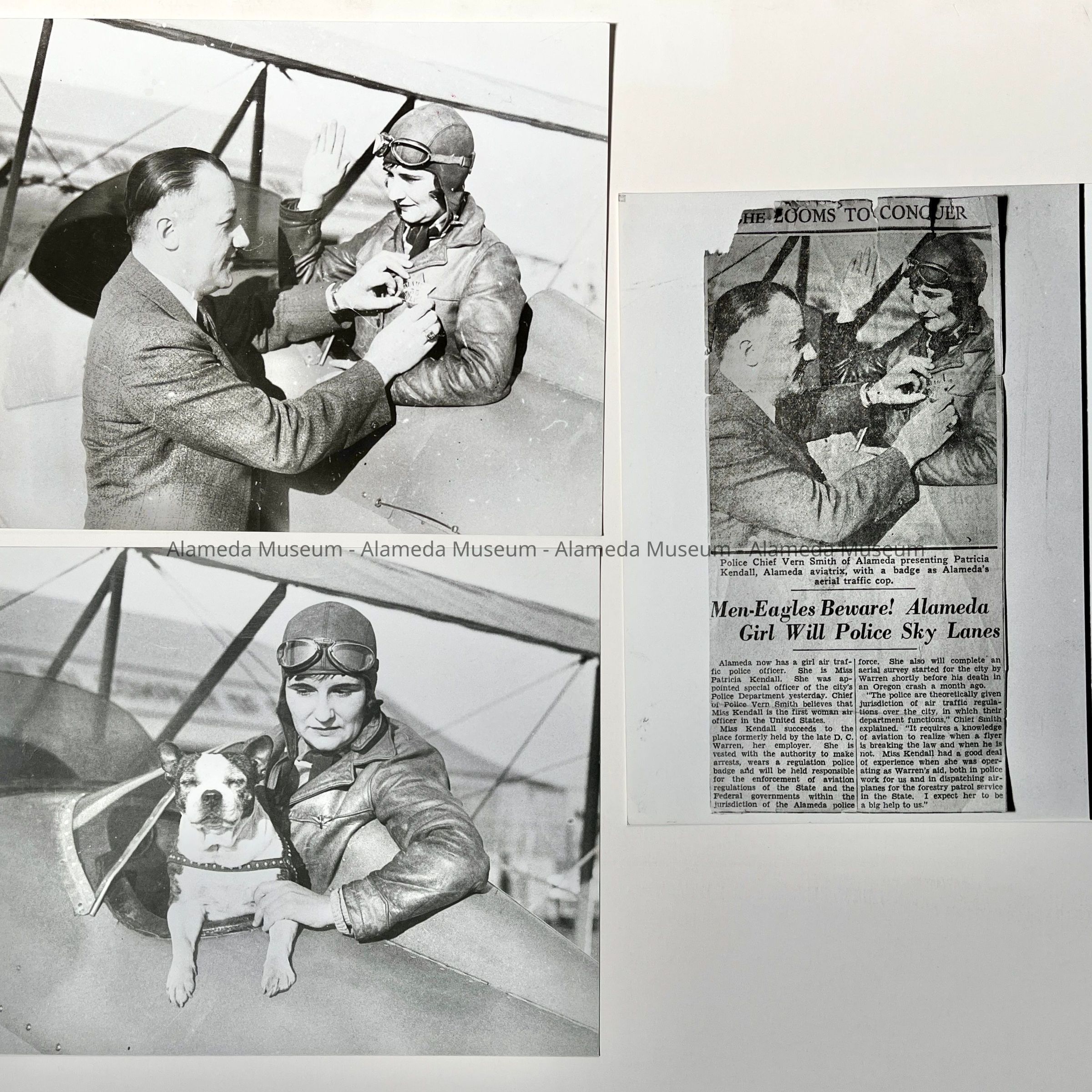 History of Object: Set of photos pertaining to the part-time assignment of Ms. Pat Kendall, Secretary to Ray Bowman, as the Alameda Police Department's Air Traffic Control Officer: a) Pat Kendall getting her police badge from Alameda Police Chief Vern Smith; b) Miss Kendall seated in her Travelaire plane with her dog; c) newspaper clipping of this event, photographed.