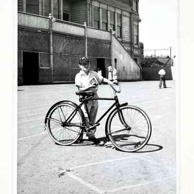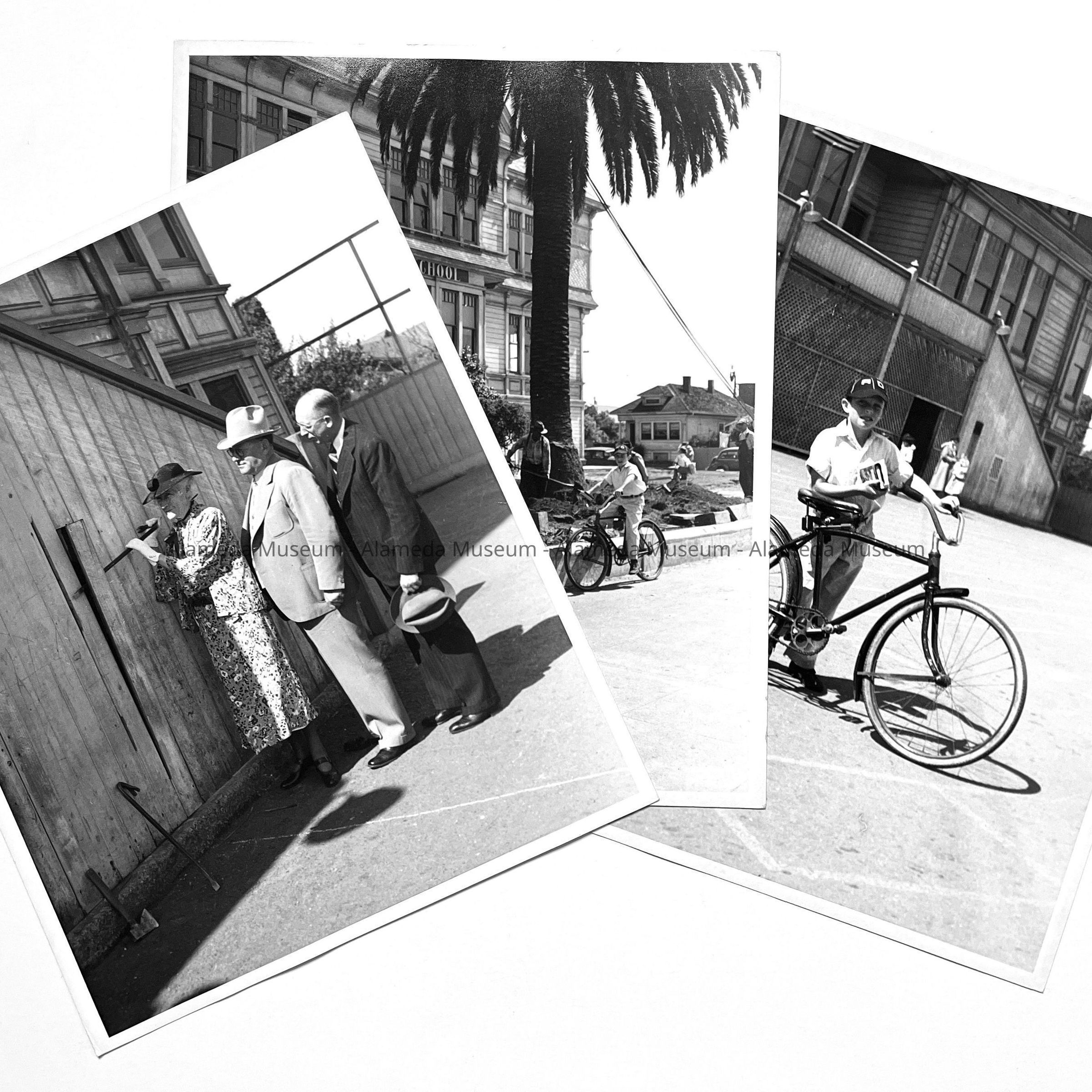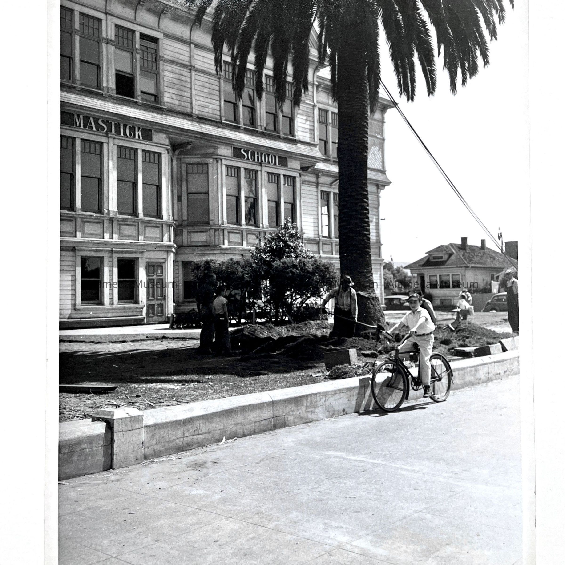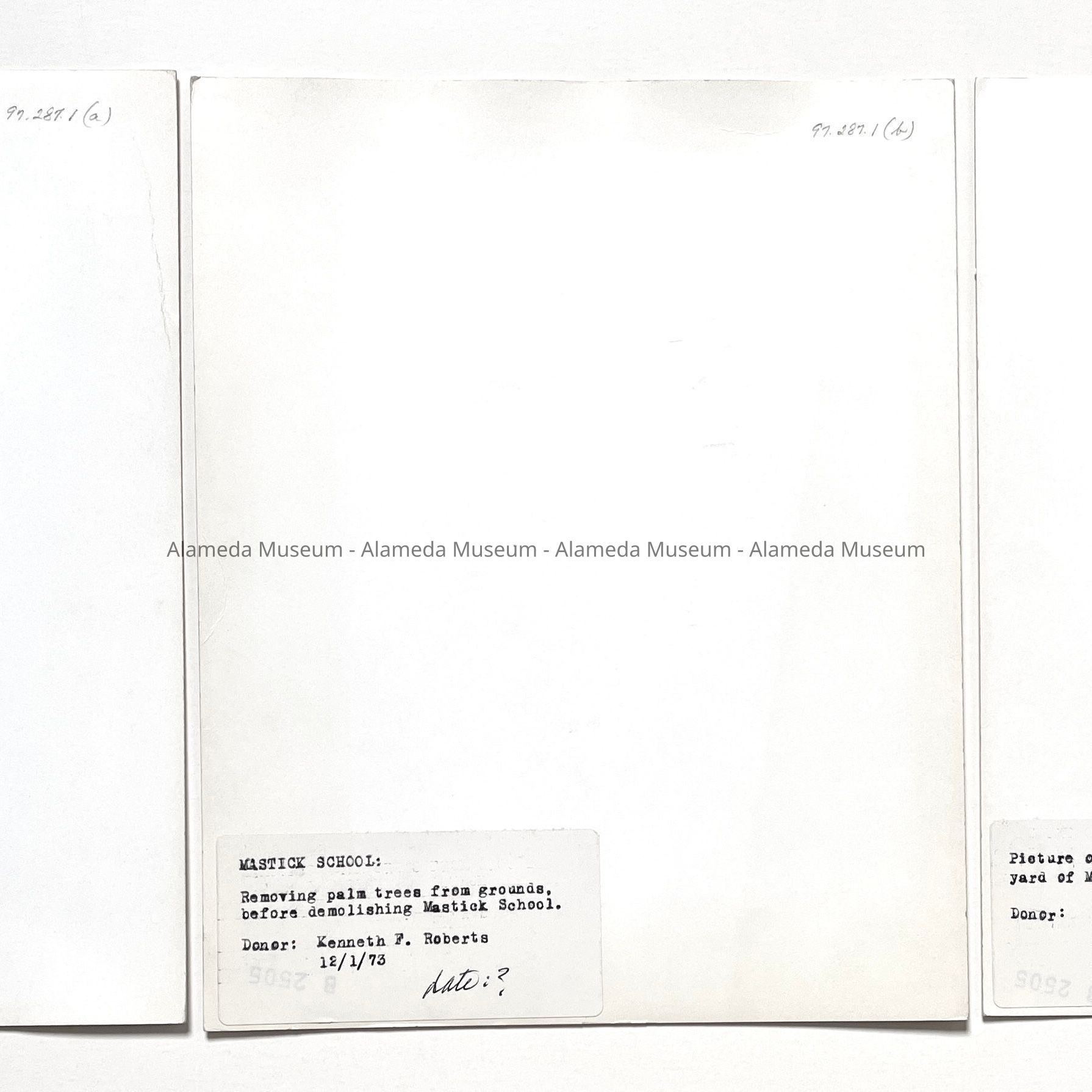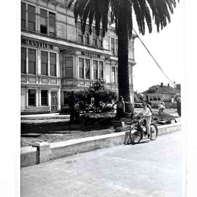 b) workmen removing the palm trees from the grounds prior to the demolition of the buildings; c) young student, Kenneth Roberts, in the school yard with his bicycle.