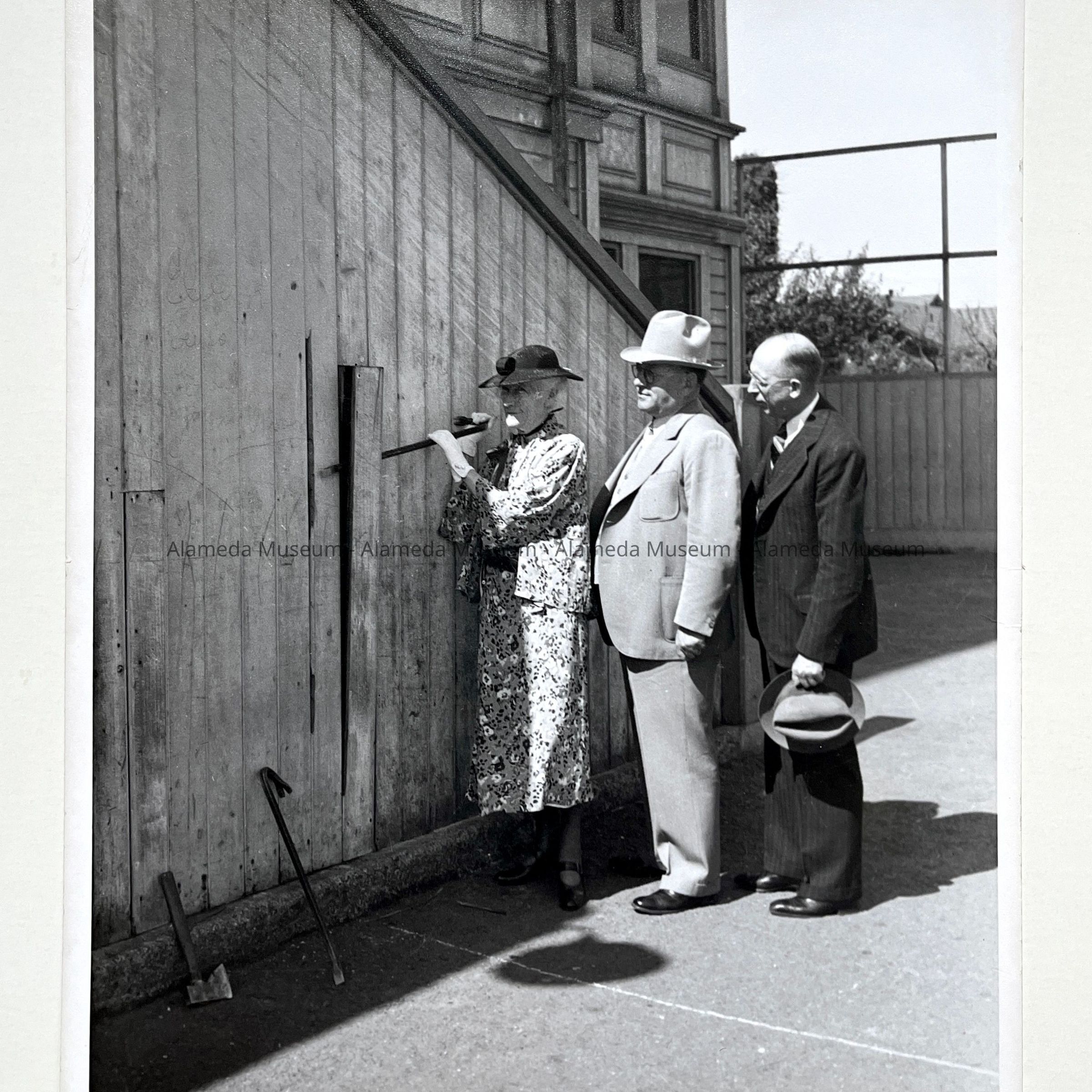 a) Miss Treanor, Trustee Everett Farwell and Supt. Paden symbolically taking a crowbar to the wood stairs of the old school;
