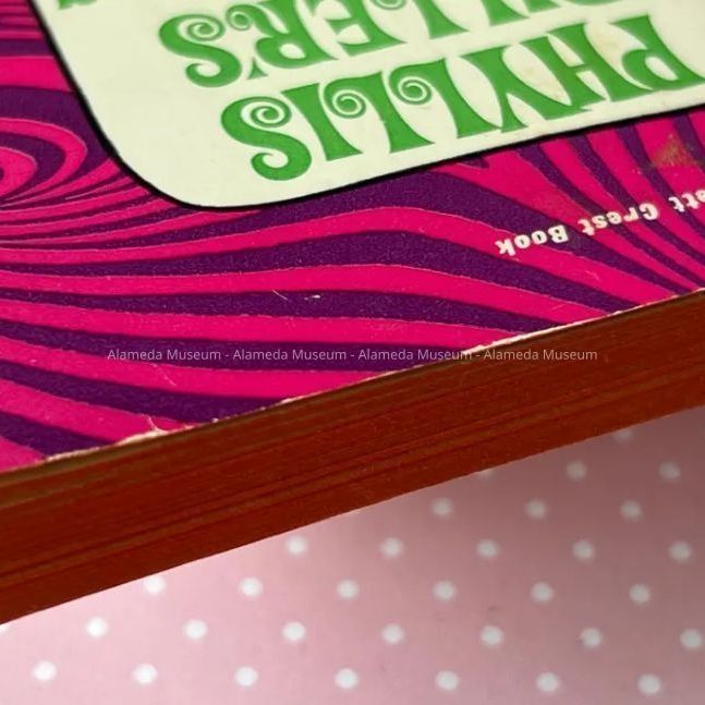 Description: Paper-back bound soft-cover book with orange fore-edges, cover featuring a pattern of psychodelic hot pink and zebrastripes, titled 'Phyllis Diller's Housekeeping Hints'. Introduction by Bob Hope. Copyright 1966, BAM Productions.