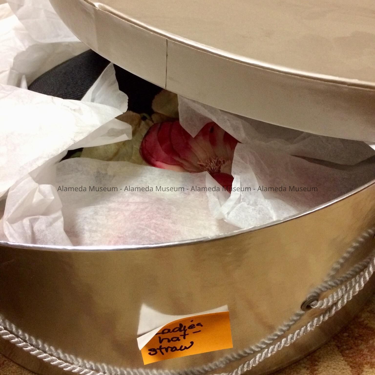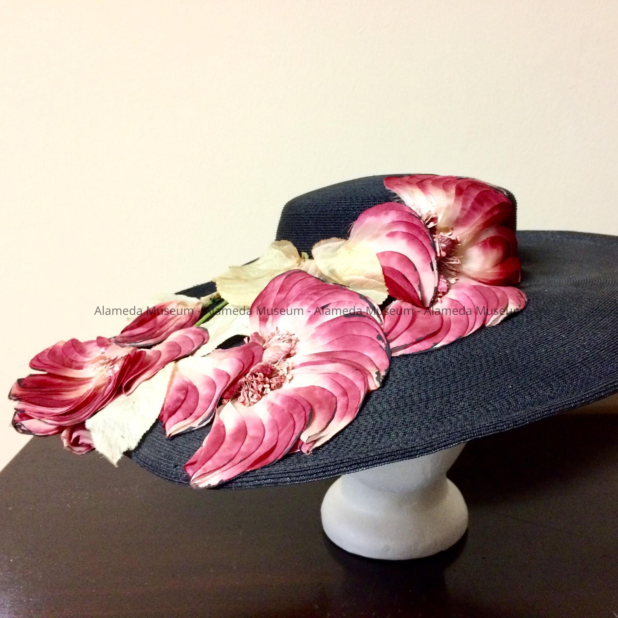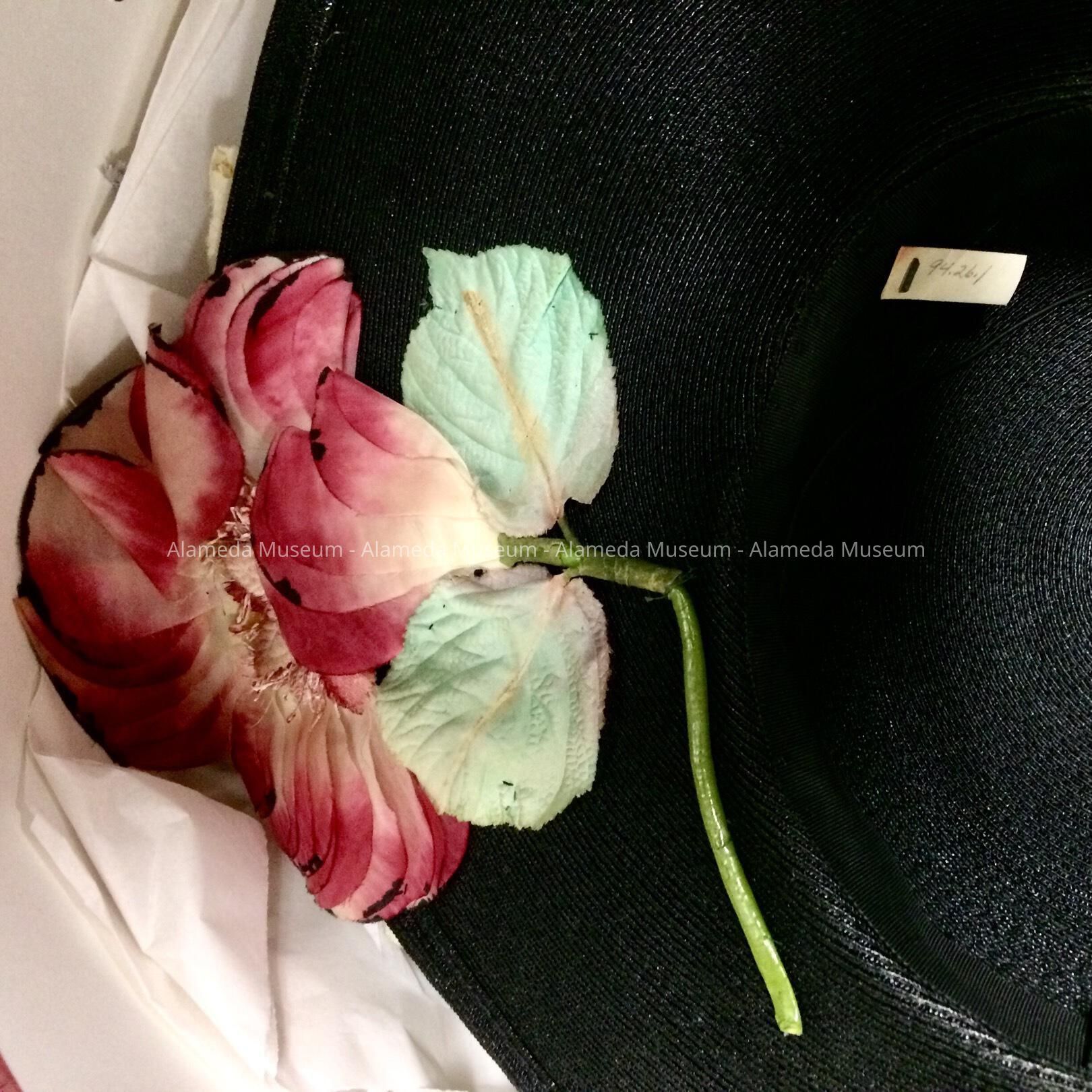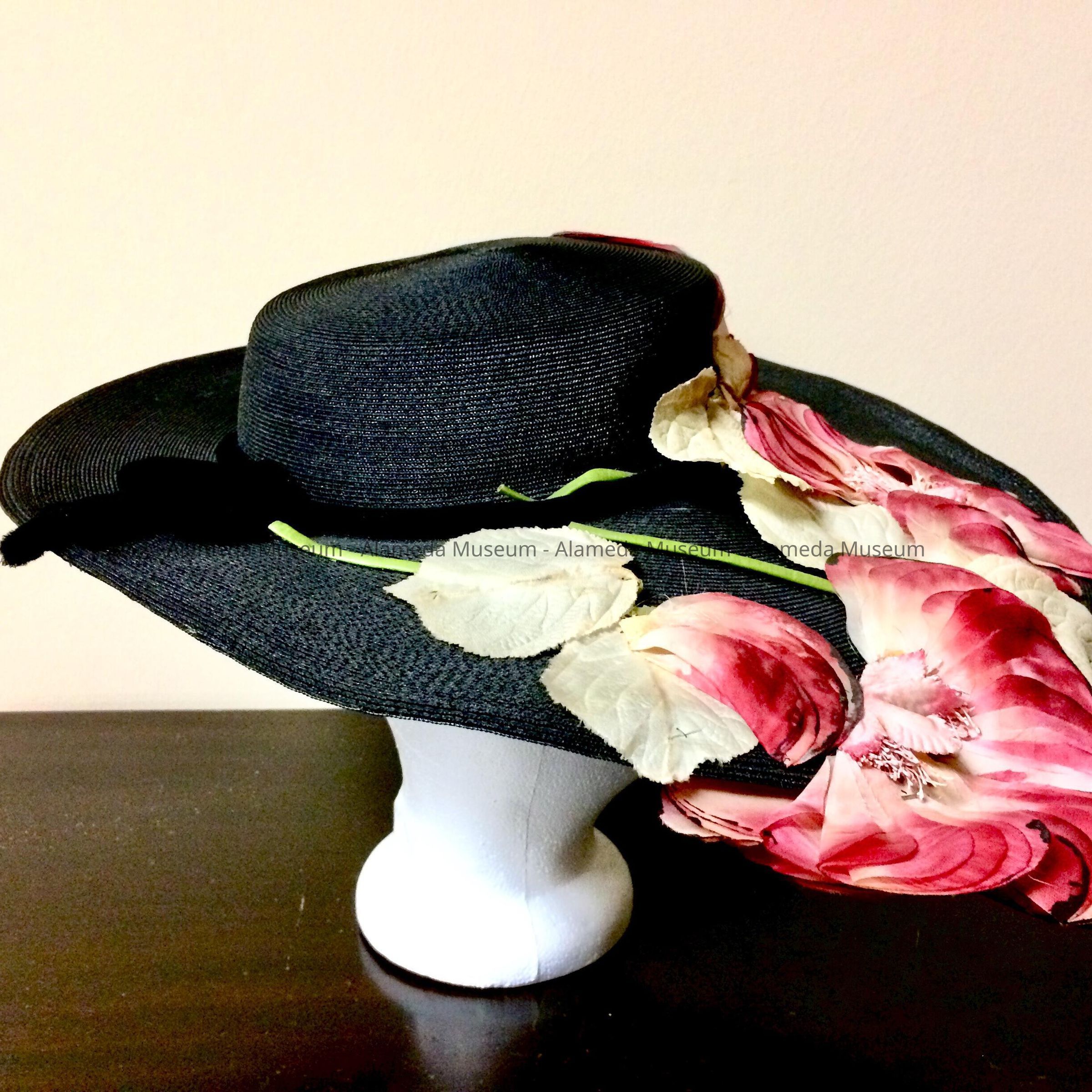 Hat worn by Polly, wife of Bert Carrington. Mr. Carrington was involved in many civic activities in the city, and the two were longtime residents of the Fernside district of Alameda.
