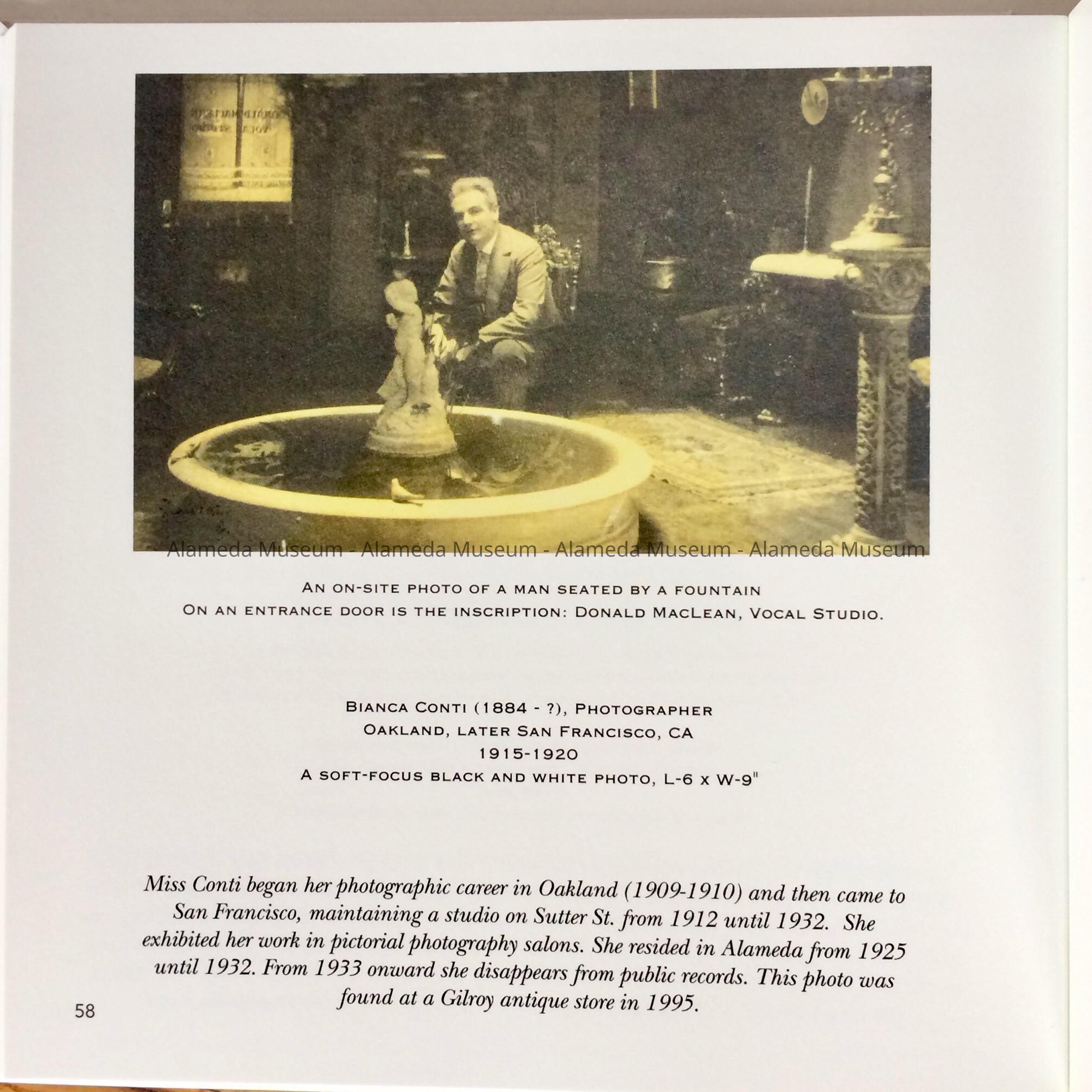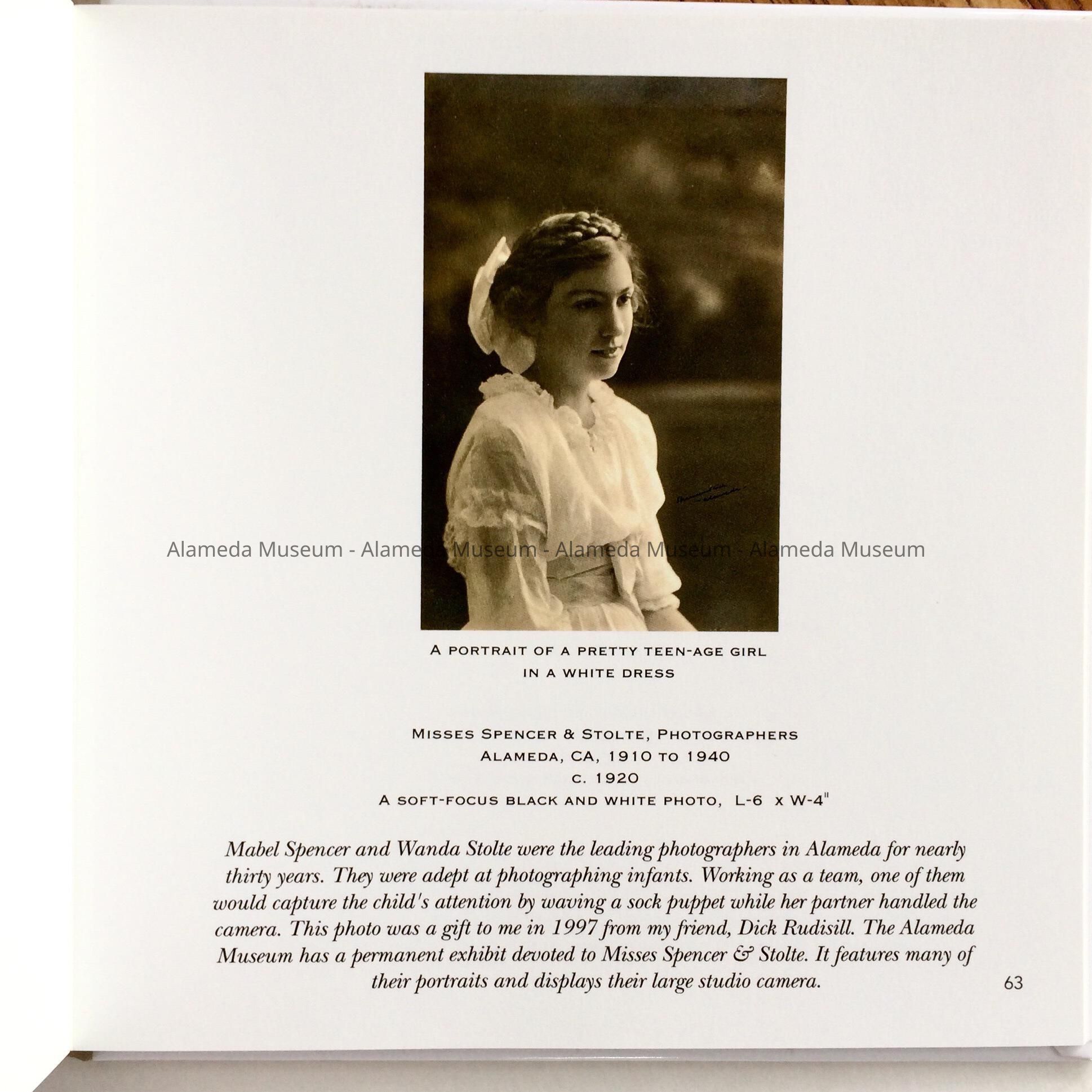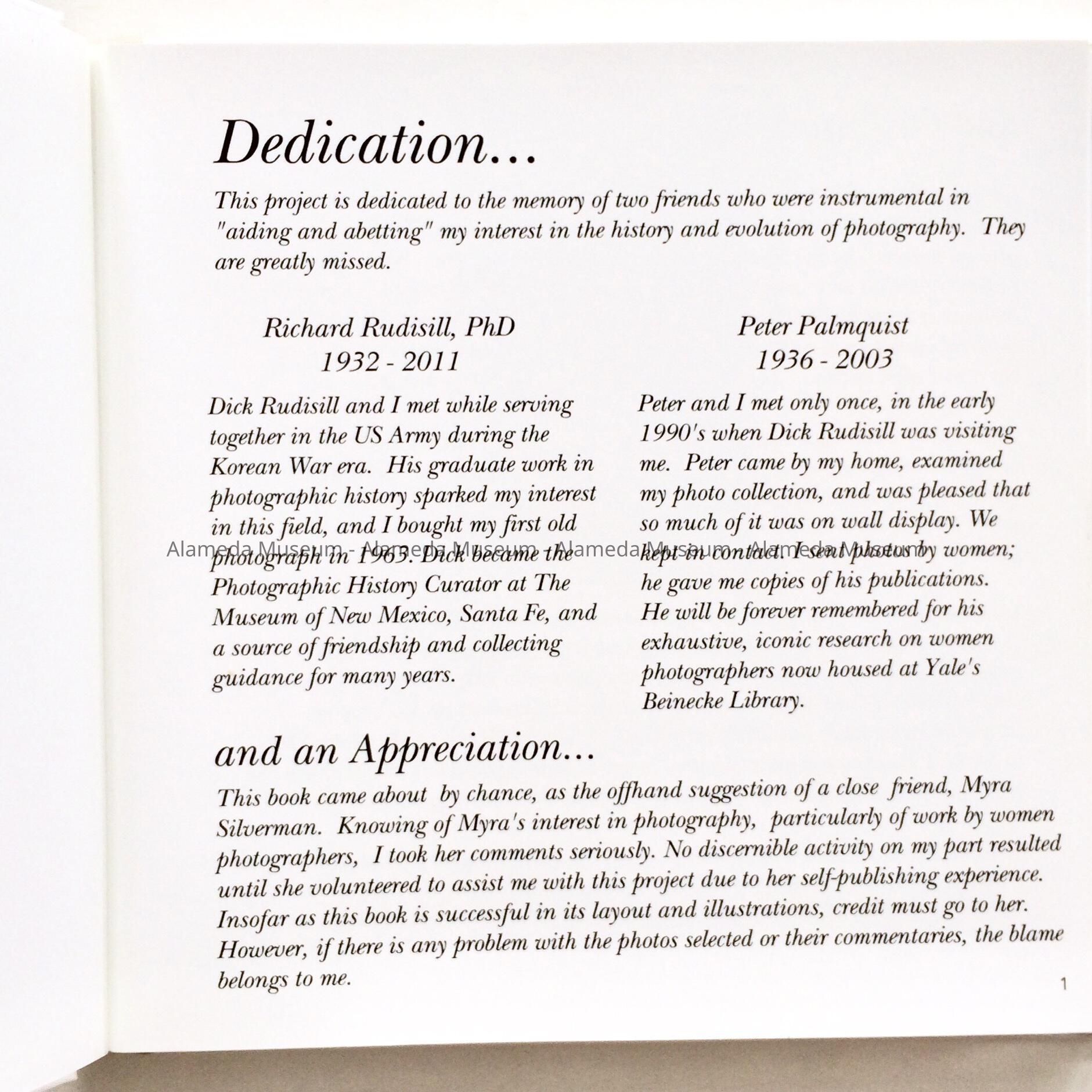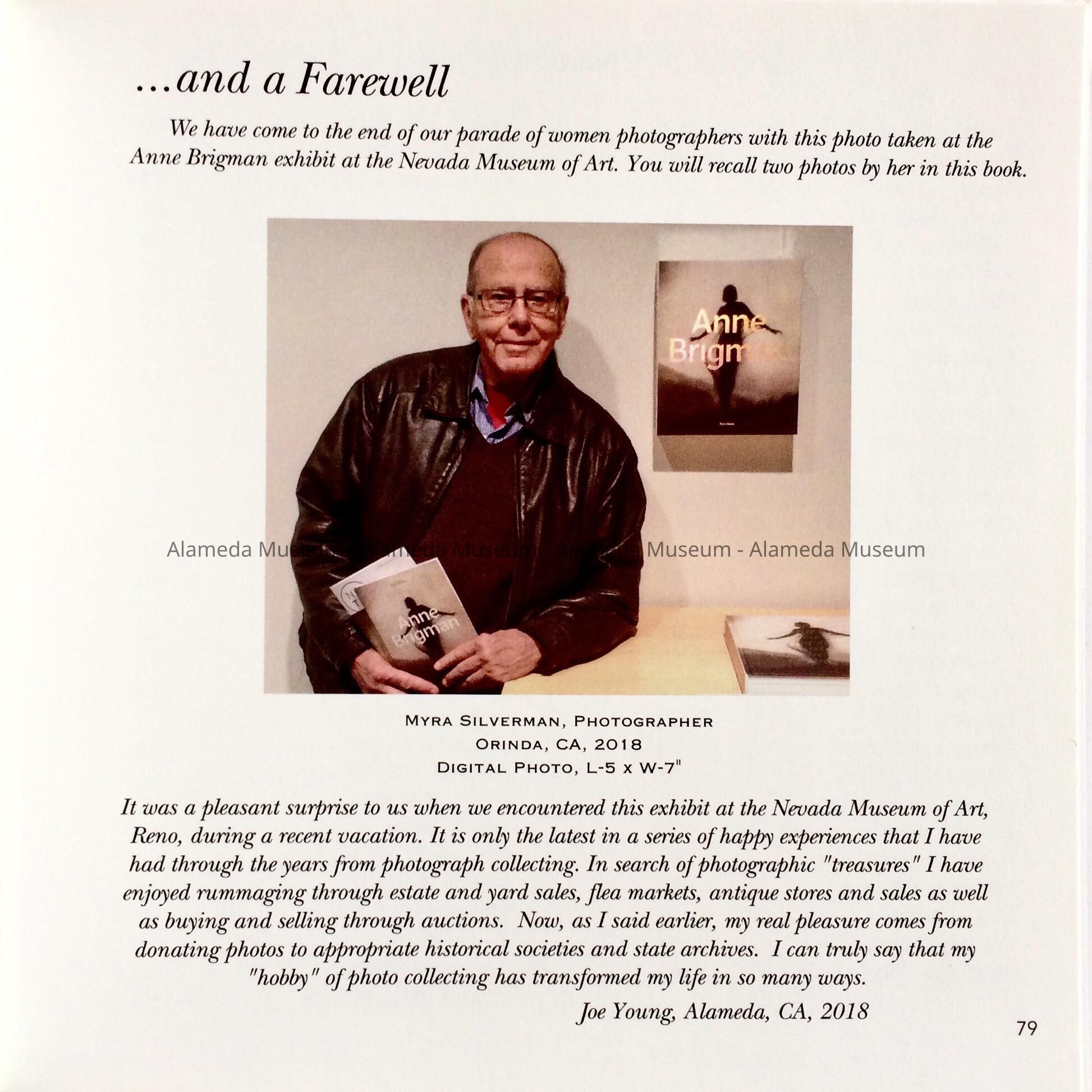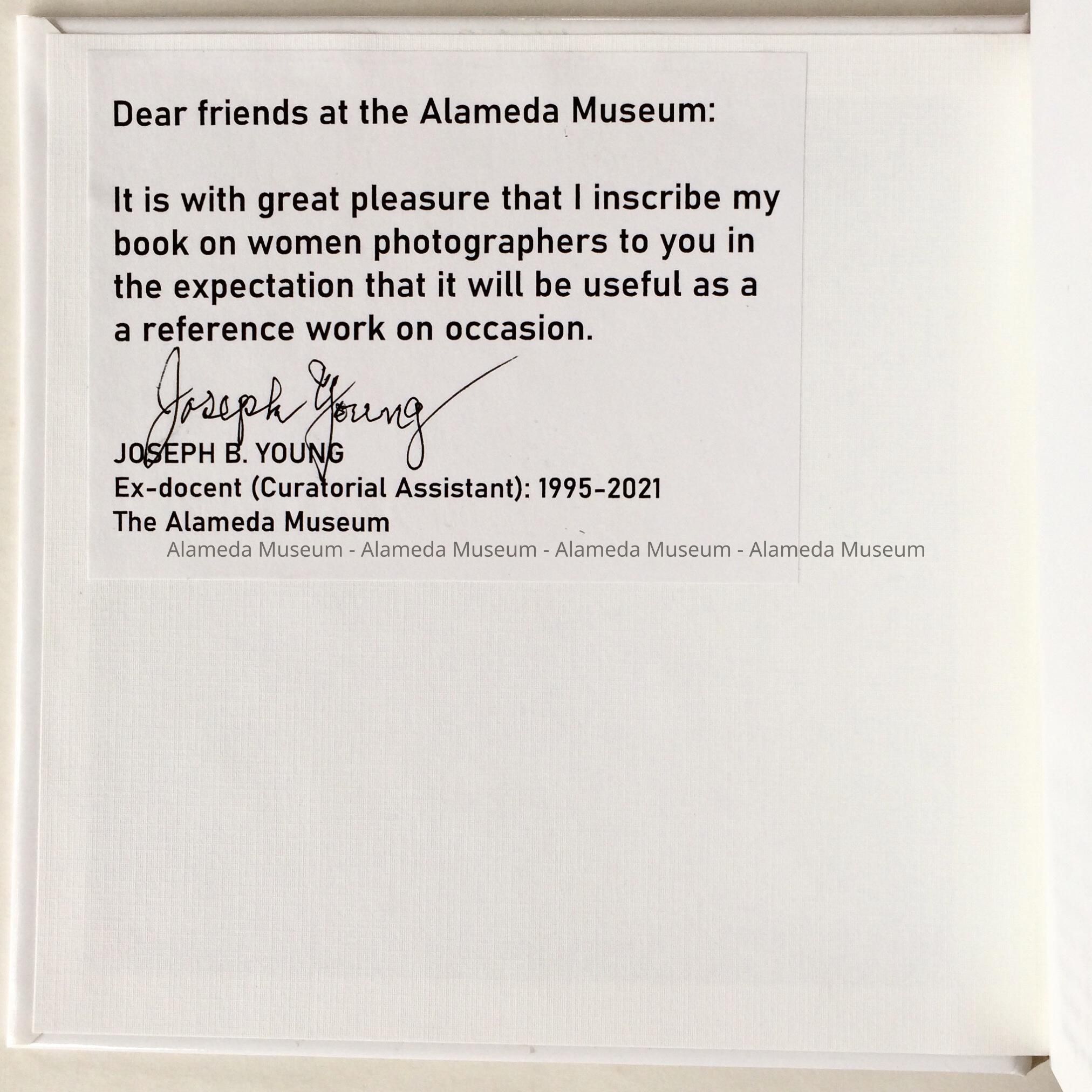 History of Object: book written and self-published by Alameda resident, museum ex-docent and long-time curatorial assistant Joseph B. Young, who retired from his volunteer work at the museum in 2021. It was through his interest in photography that Joe first came in contact with them Curator George Gunn, who convinced him to become his assistant. The book represents favorite photos by woman photographers from Joe's collection, with explanations about each image. Some were acquired in Alameda estate sales, antique or book stores, or at the once-per-month Antique Fair or Flea Market (on the former NAS). Page 63 has an image by Alameda photographers Spencer and Stolte, mentioning the permanent exhibit at the Alameda Museum. Page 58 mentioned that photographer Bianca Conti resided in Alameda from 1925 to 1932. Page 79 has a photo of the author.