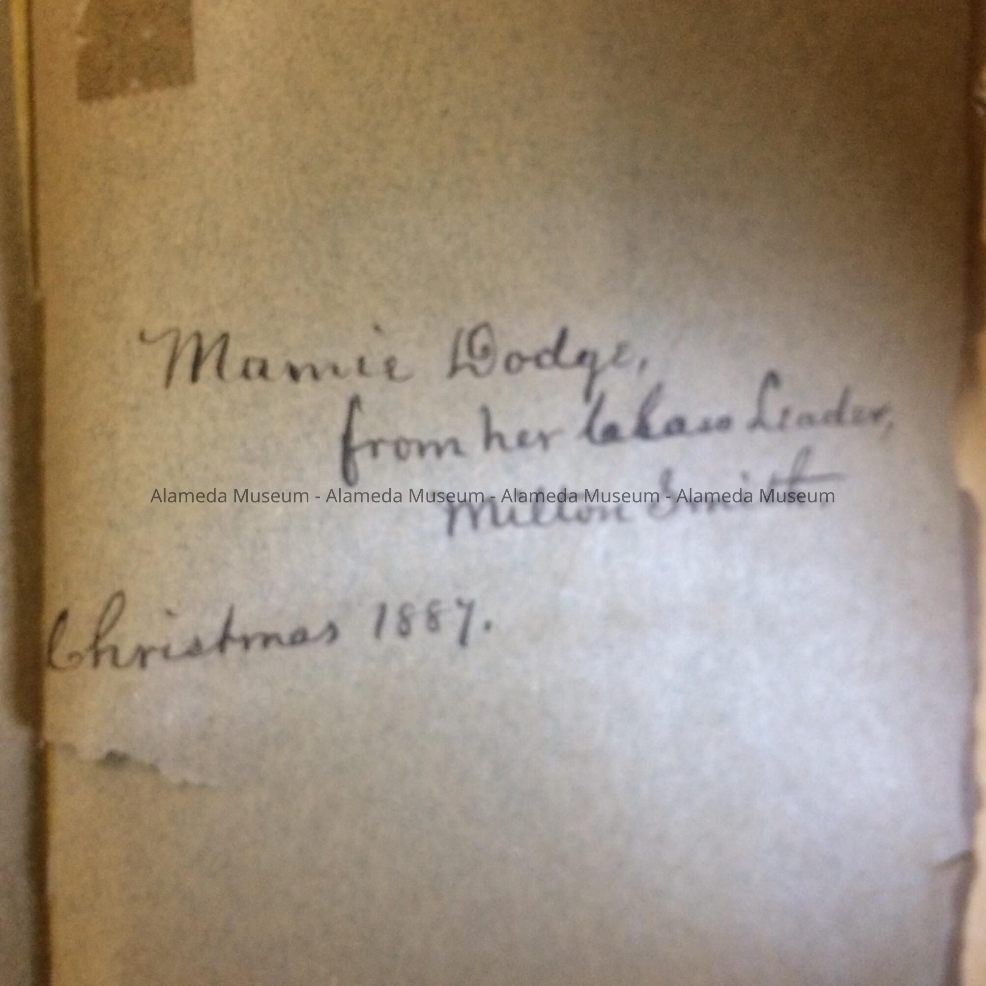 ON THE FLY LEAF OF THE BOOK IS THE INSCRIPTION, "MAMIE DODGE, FROM HER CLASS LEADER, MILTON SMITH, CHRISTMAS 1887.