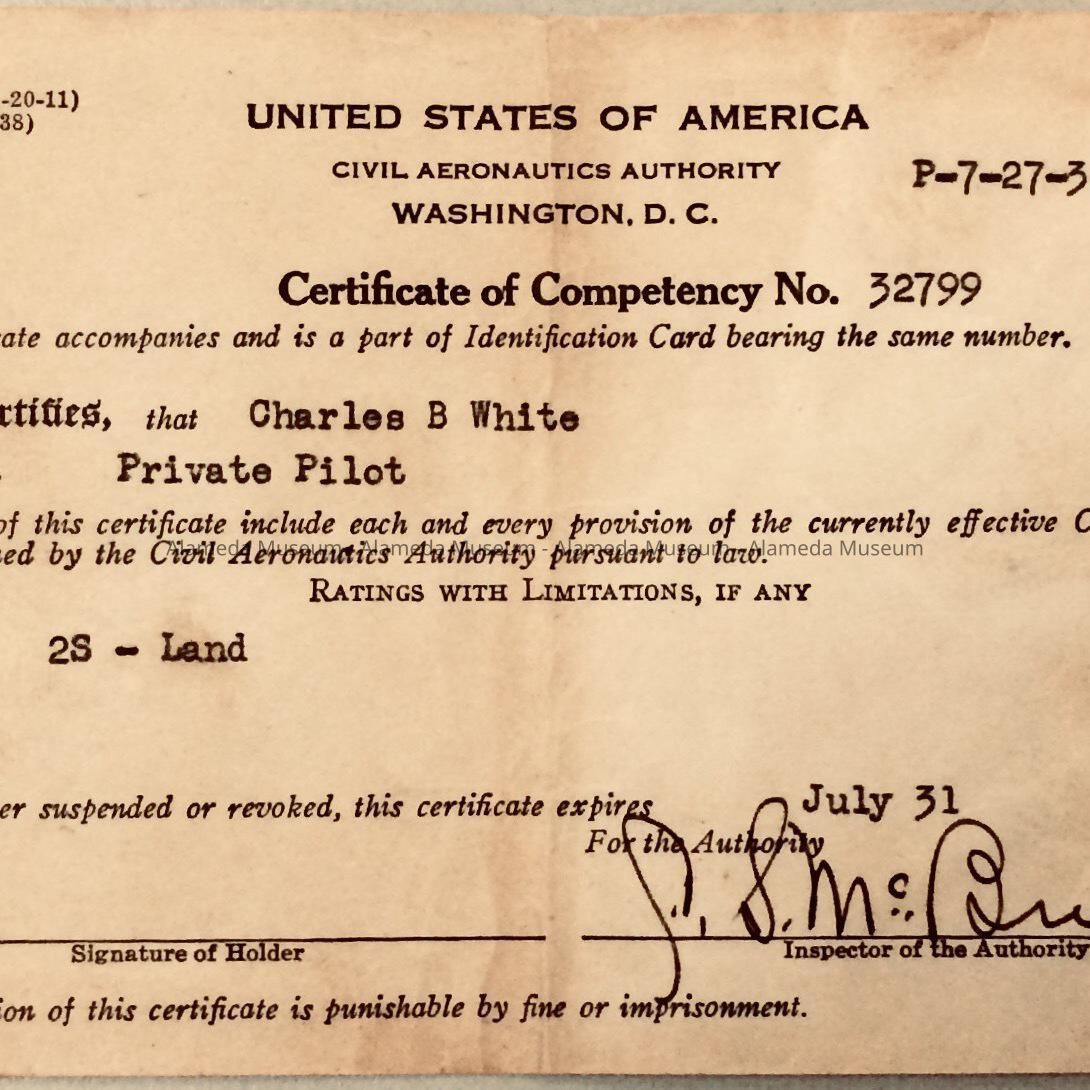 HISTORY OF OBJECT: A CERTIFICATE OF COMPETENCY ISSUED TO CHARLES B. WHITE AS A PROFESSIONAL PILOT. LICENSE EXPIRED ON JULY 31, 1940. MR. WHITE WAS BORN IN ALAMEDA AND WAS A MEMBER OF A PROMINENT ALAMEDA FAMILY.