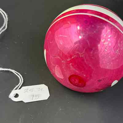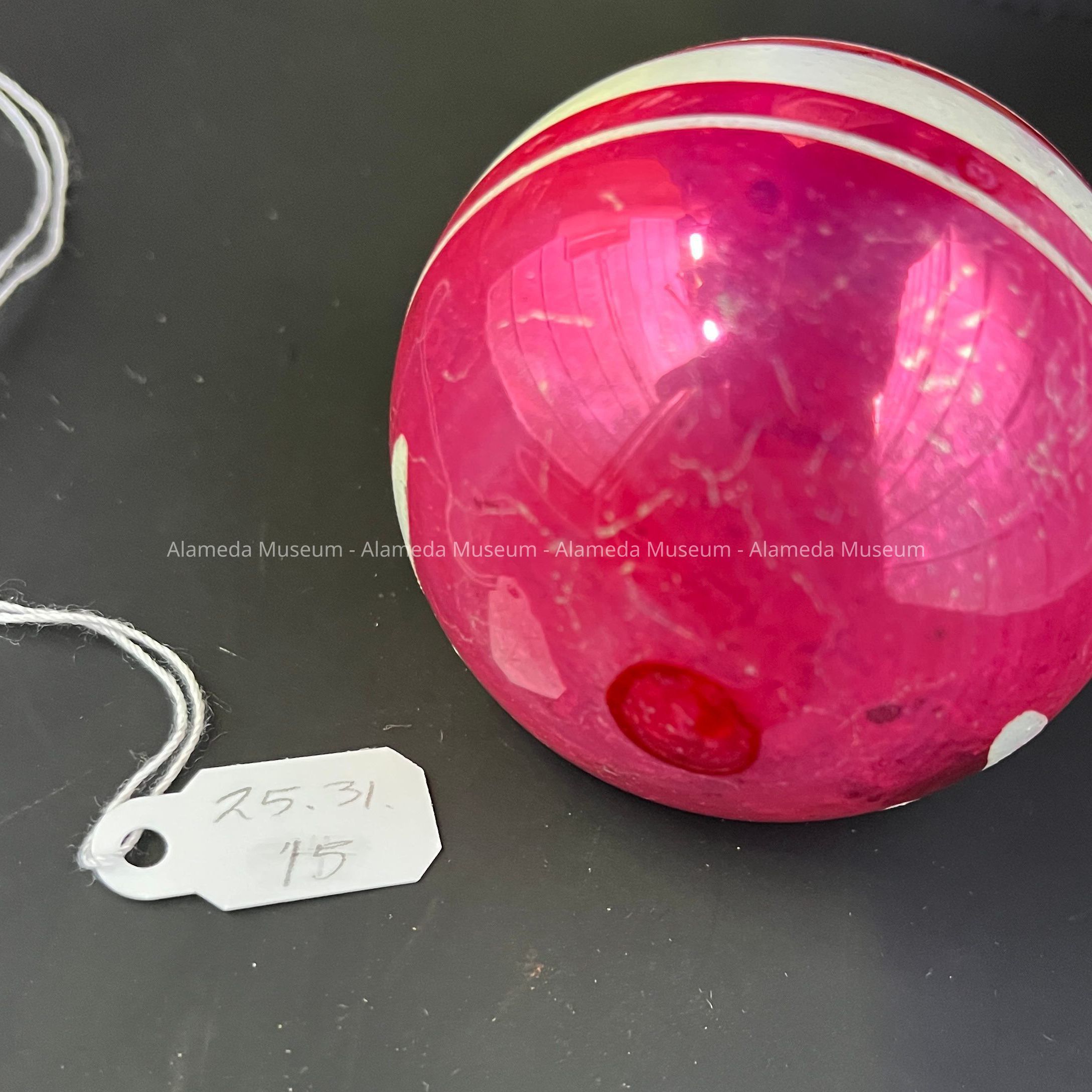Description: A ball-shaped glass ornament painted bright metallic pink with white horizontal lines and floral dashes, with a one-sided white indent with pink central dot. Paint has settled in a circle at the bottom during manufacture.
