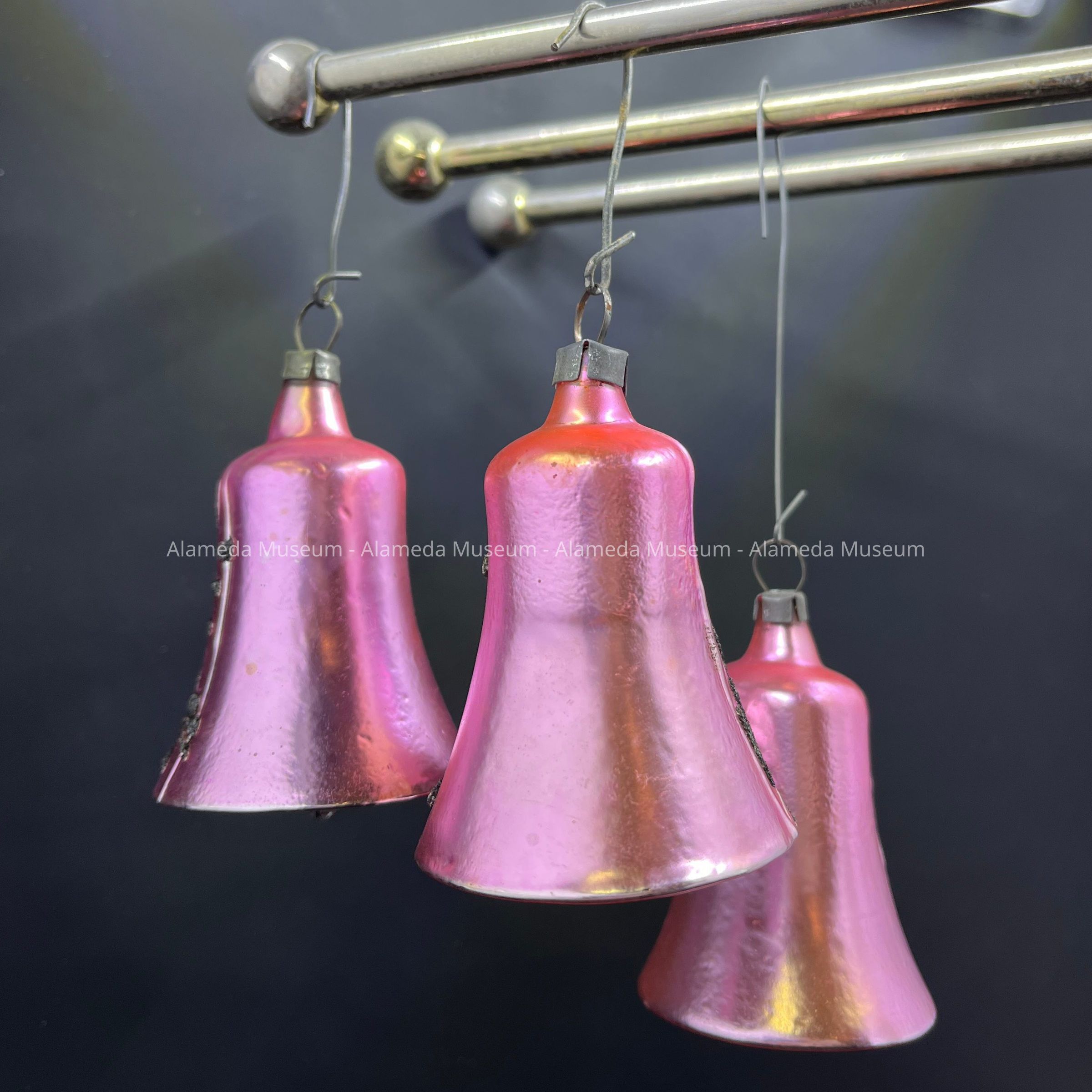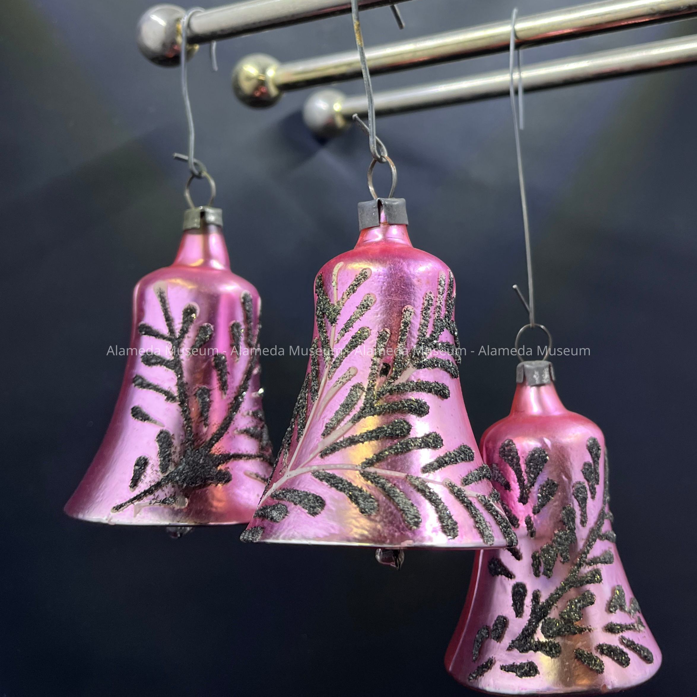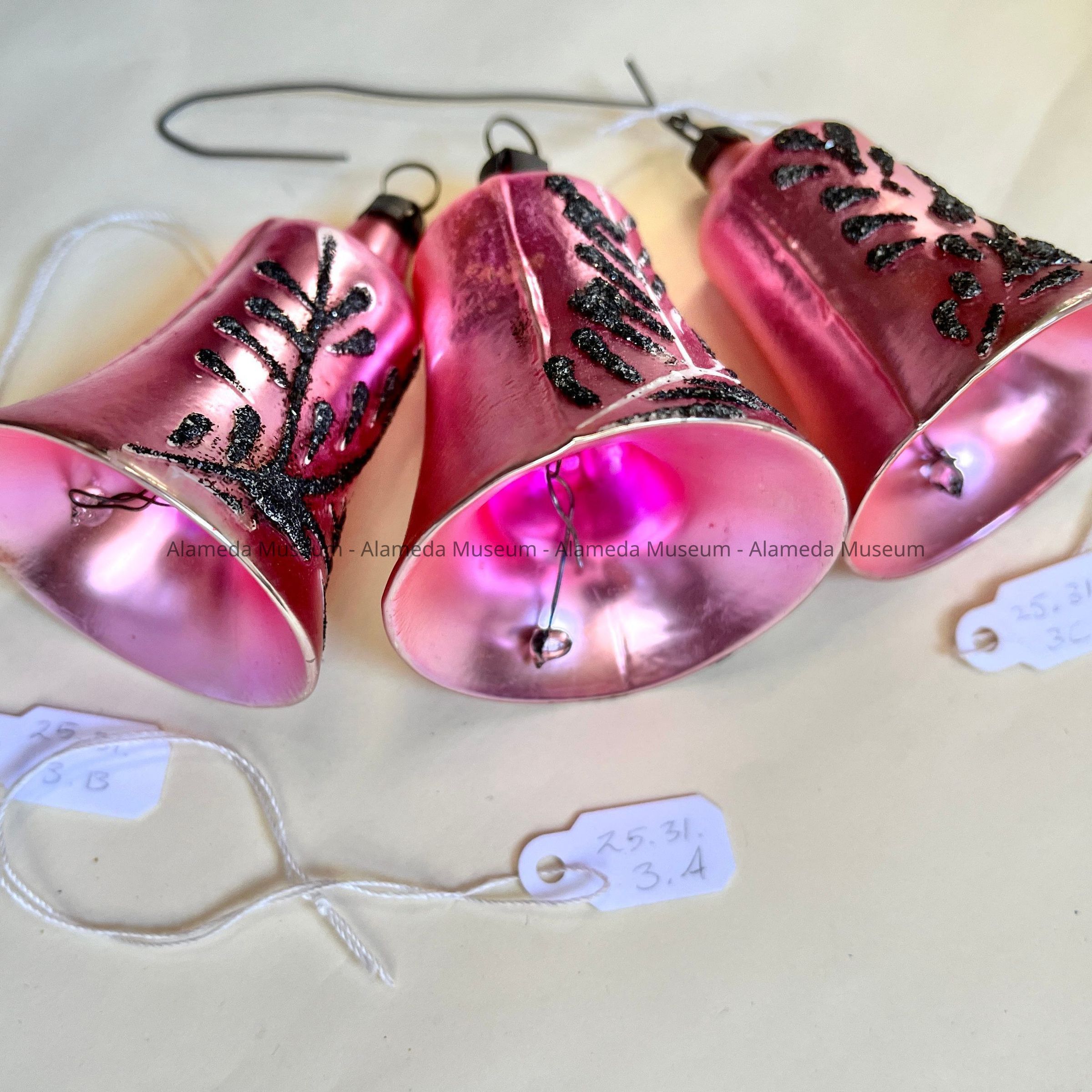 Description: Three matte, metallic pink, cast glass ornaments in the shape of a bell, with on one side, a decoration of a branch split into three arms, of raised glitter material. A is slightly bigger, has an intensification of color in the inside, and the branch decoration is carried out in white opaque paint. A has an unusual ribble on the back - possibly a manufacturing fault. Glitter has oxidized into black. The clappers are transparent colorless glass beads attached with metal wire.