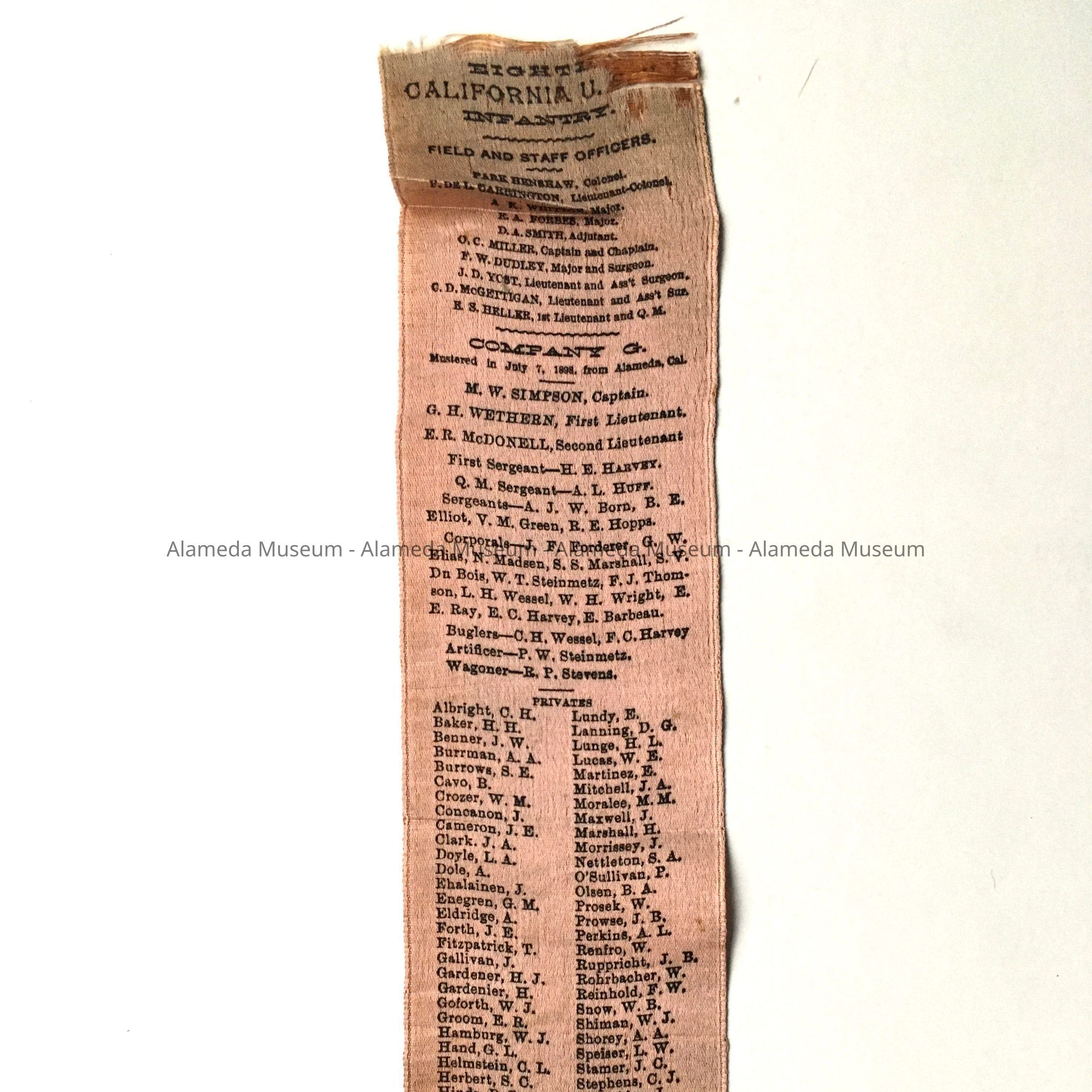 History of Object: Ceremonial ribbon with a roster of membership. Company G, Alameda, 1898. Company G formed 1894. Ribbon once the property of Edward McDonell, member of a pioneer Bay Farm Island family.