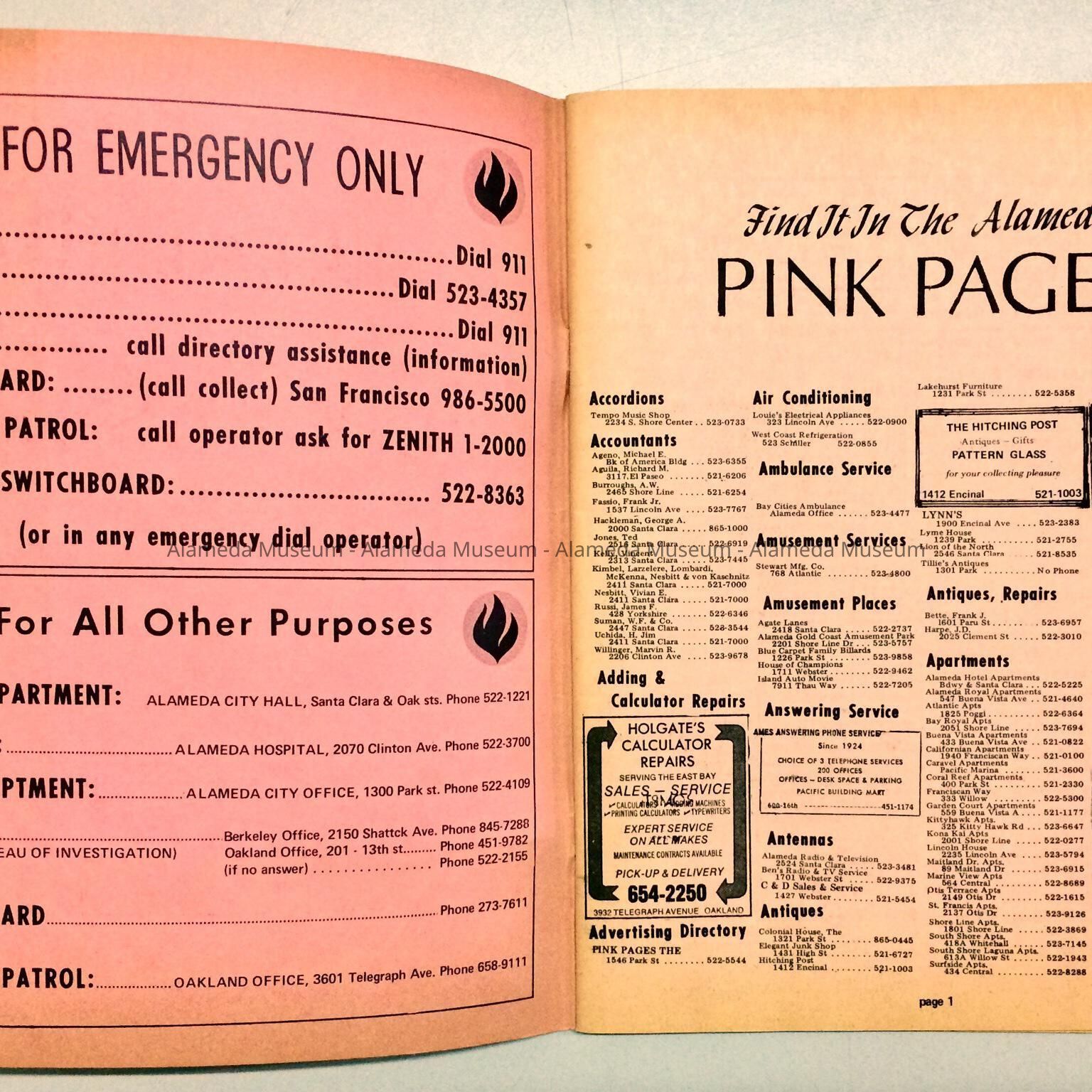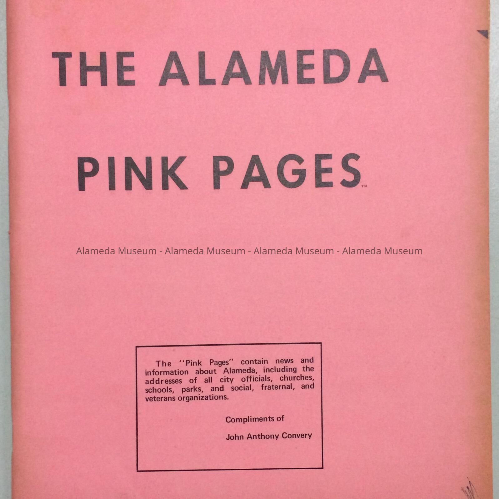 A BUSINESS DIRECTORY OF THE CITY OF ALAMEDA, KNOWN AS THE "PINK PAGES." THE DIRECTORY CONTAINS A LISTING OF CITY OFFICIALS, LOCAL BUSINESSES, AND A REPRINT OF THE HISTORY OF ALAMEDA COUNTY, CALIFORNIA (FROM A 19th CENTURY BOOK).