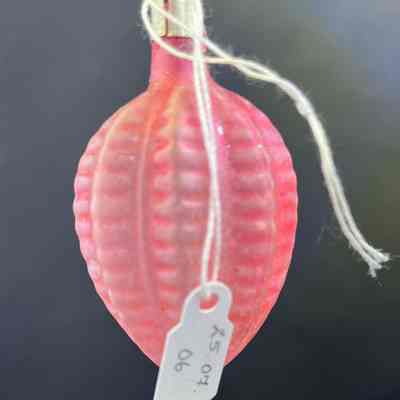 Description: Shaped like a ridged, knobbly fruit, this ornament is of frosted pale pink glass, and may be shaped to look like a stylized pine cone or fruit.