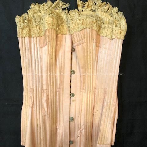 Pink satin covered corset with ecru trim and white silk lacing, 1895Entry/Object ID