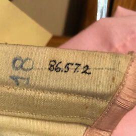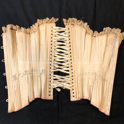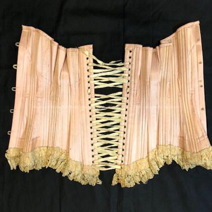 Description: Pink satin covered corset with ecru colored trim. White silk lacing & nickel plated catches.