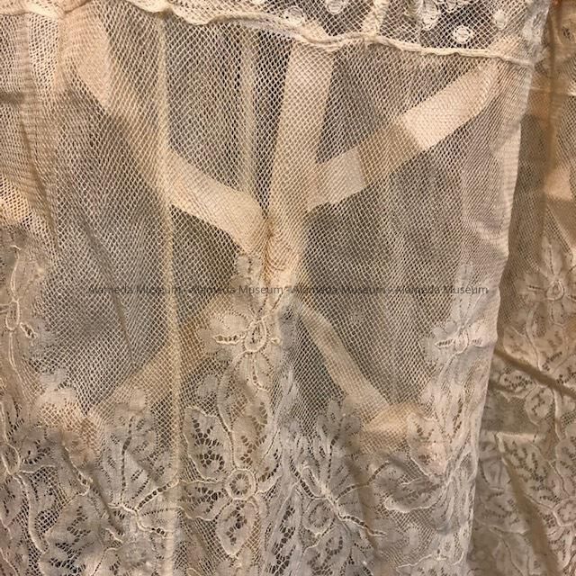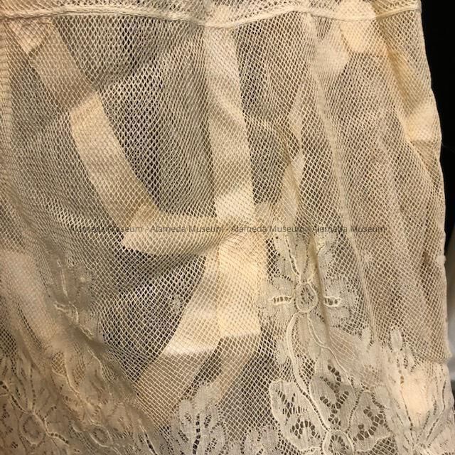 Silk-satin (pink colored) petticoat with full flounce ruffle of ecru colored machine lace backed by unusual design of silk ribbons.