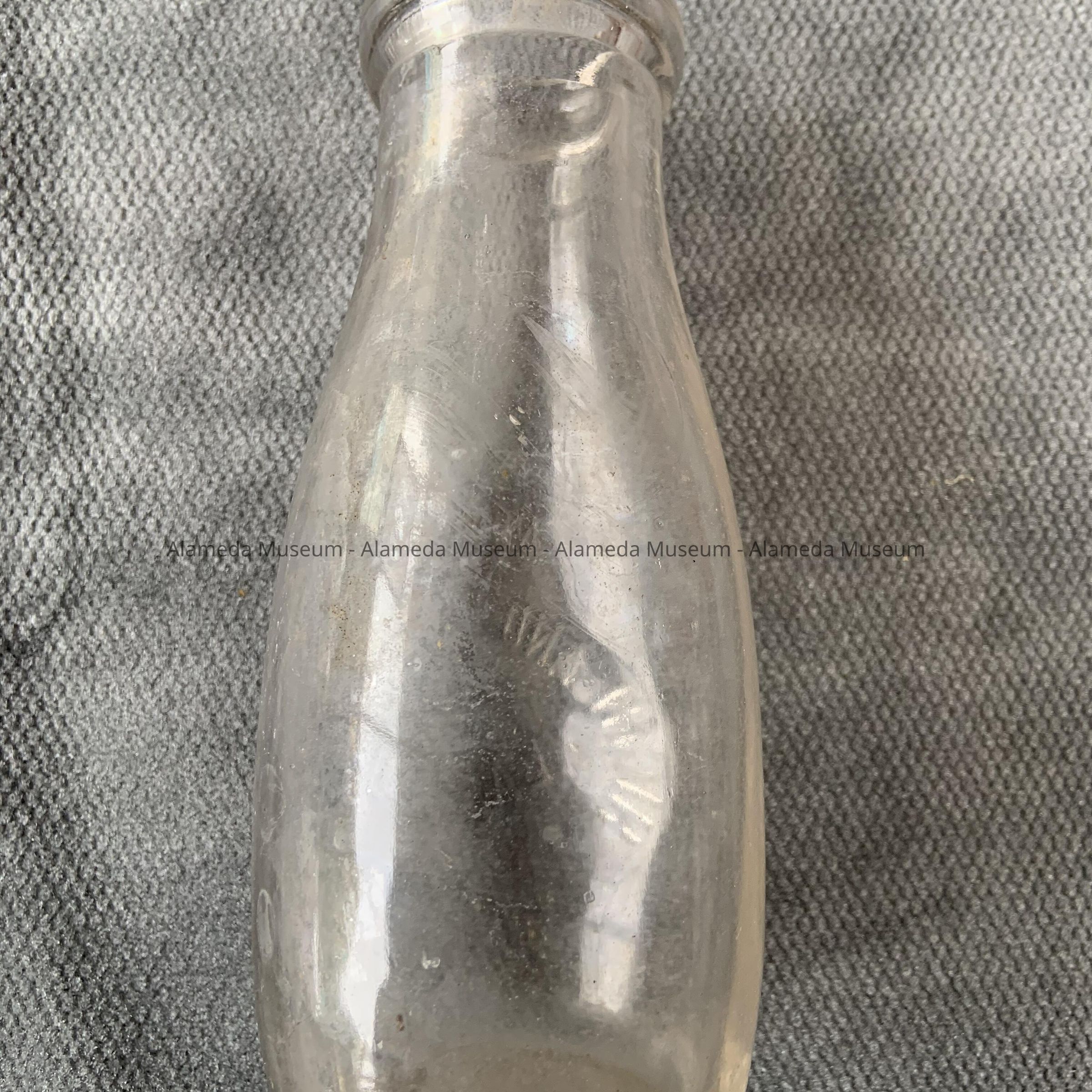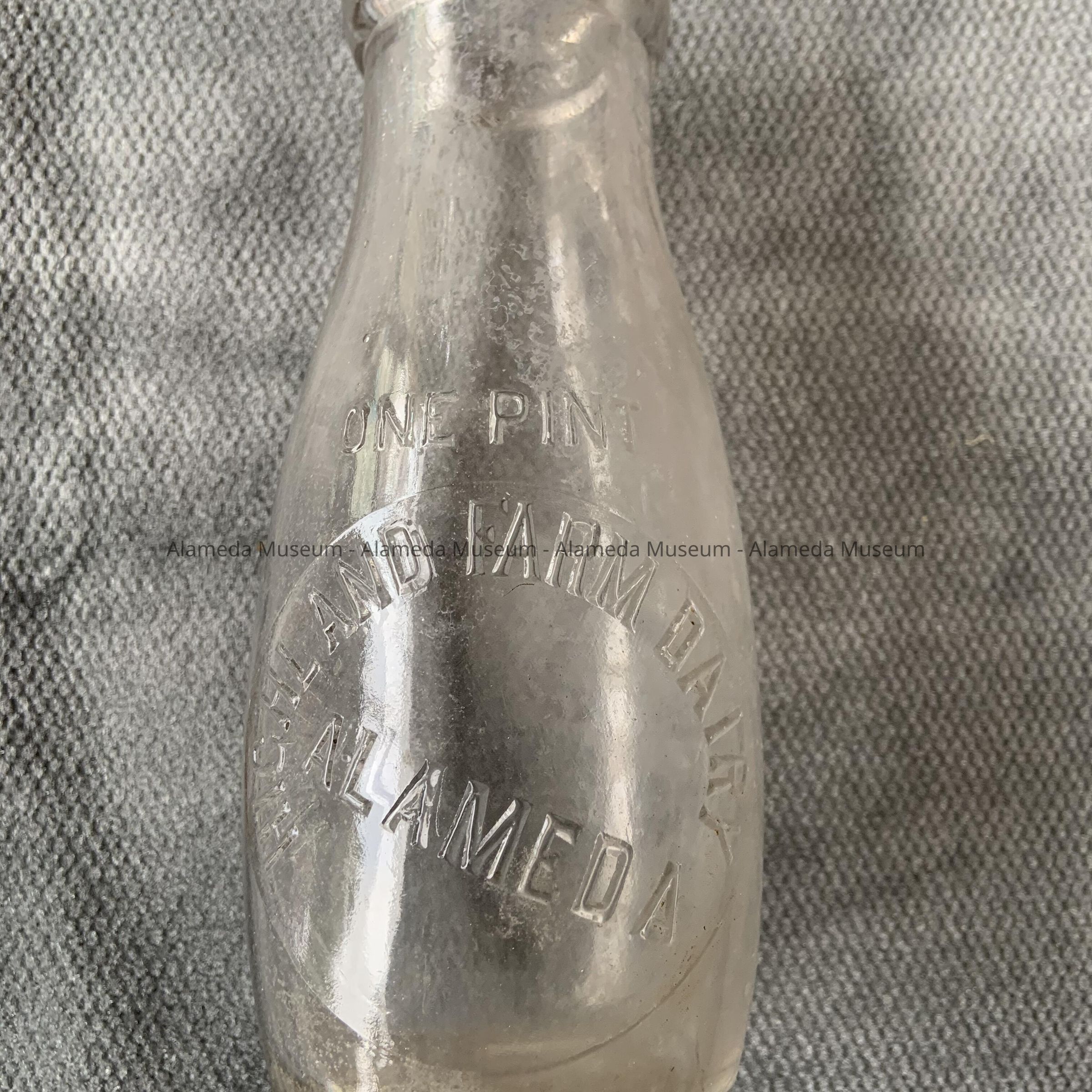Description: A clear double seam glass pint-size milk bottle with an embossed label: "Highland Farm Dairy Alameda.