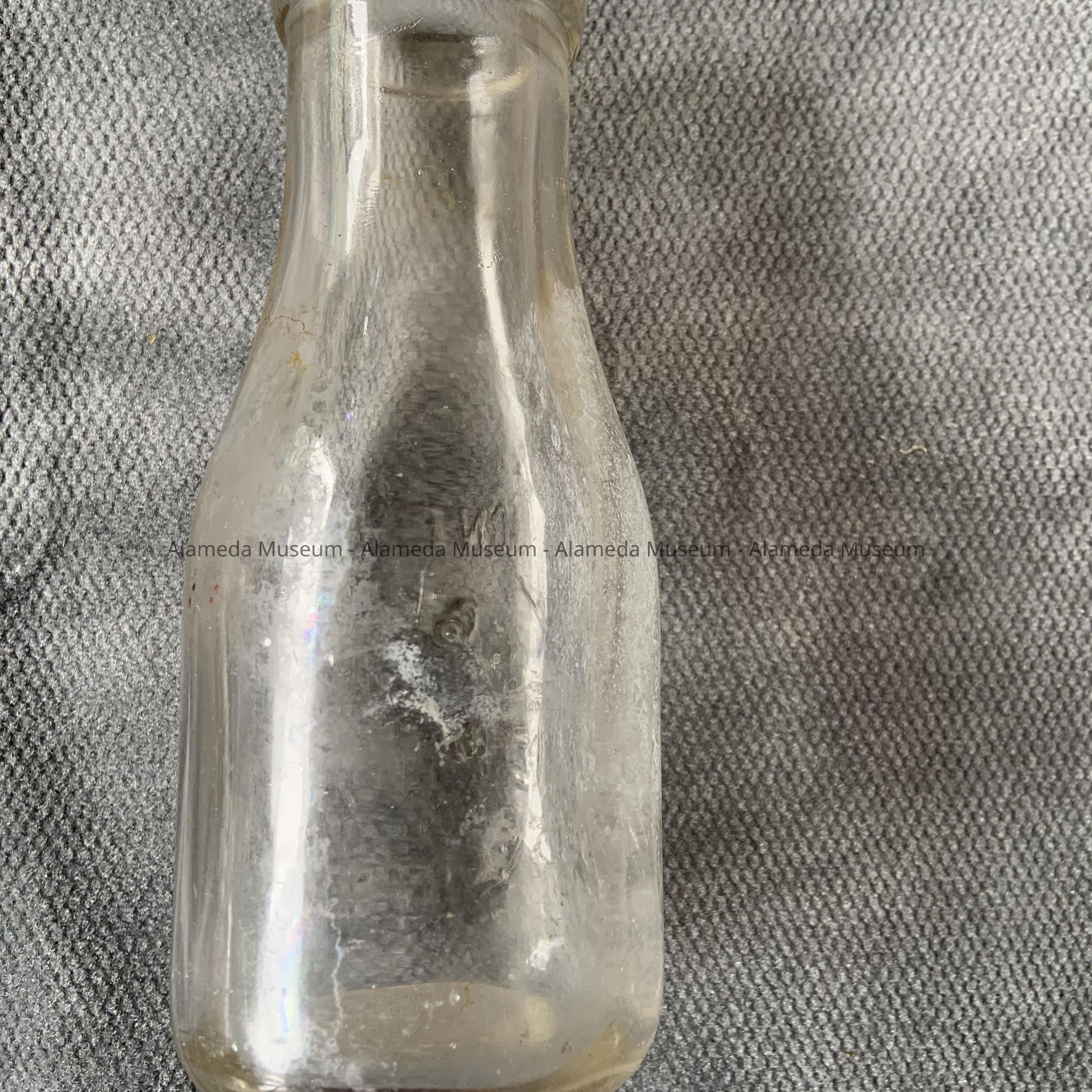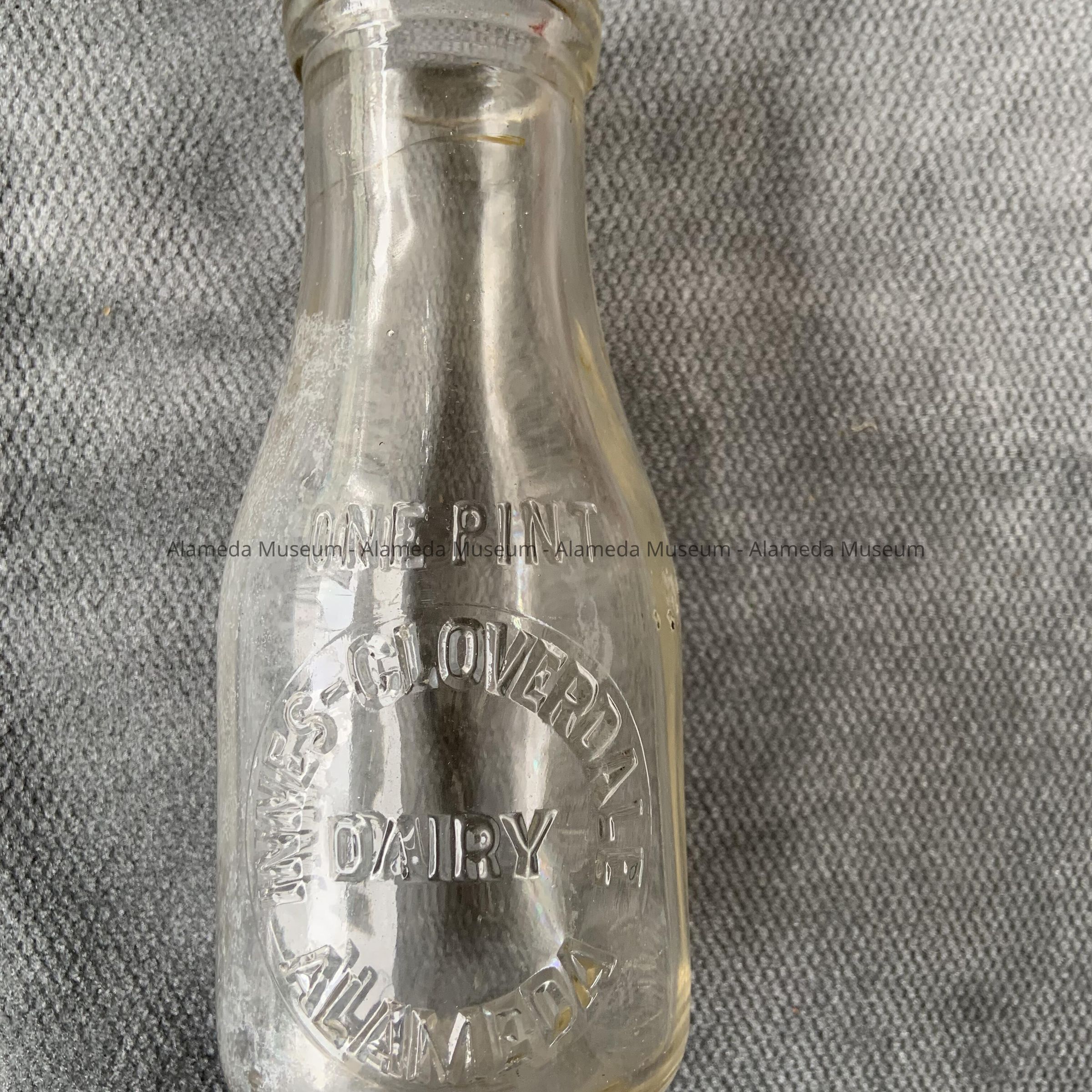 Description: A double seam pint size clear glass milk bottle with an embossed caption reading: "Innes-Cloverdale Dairy Alameda".